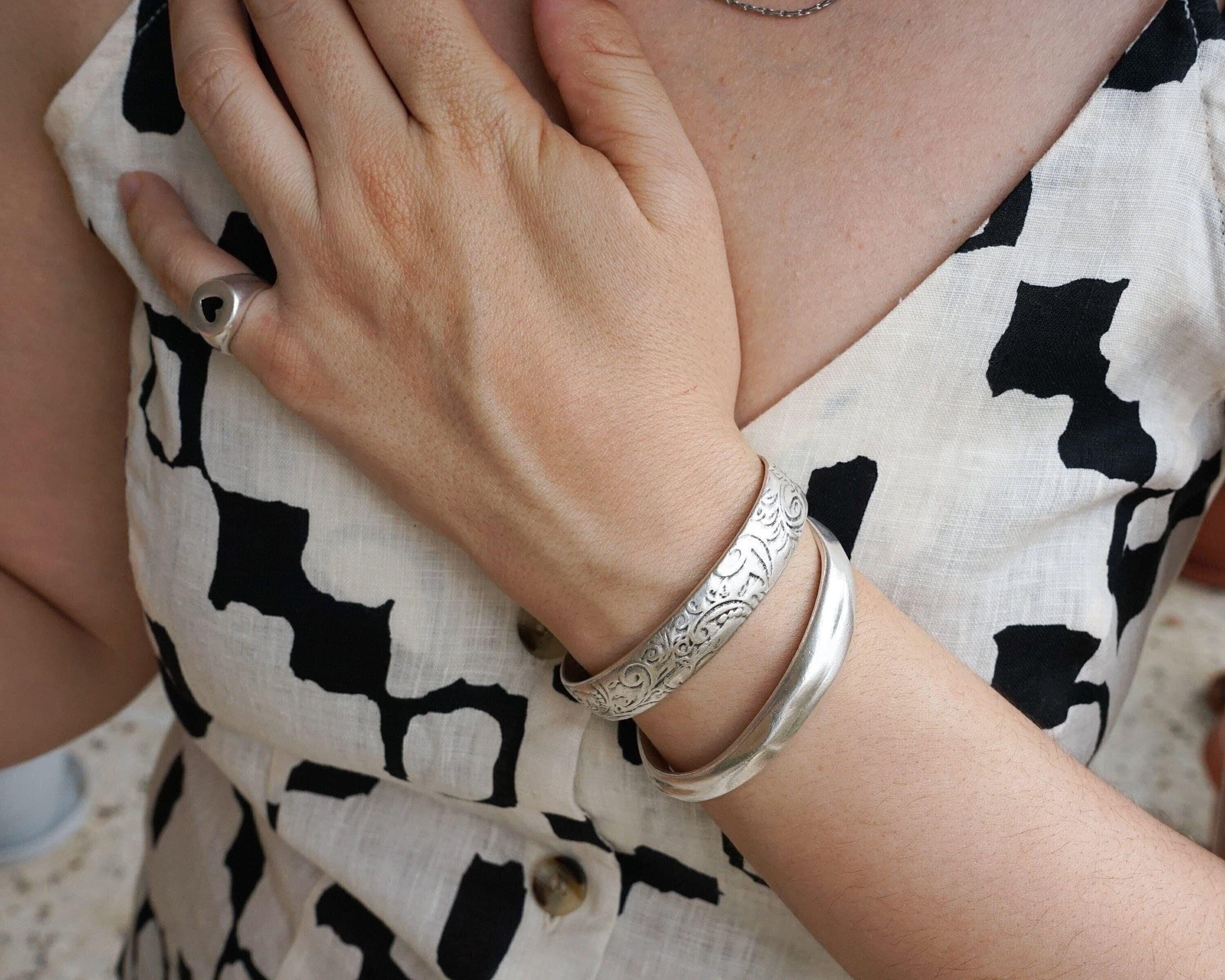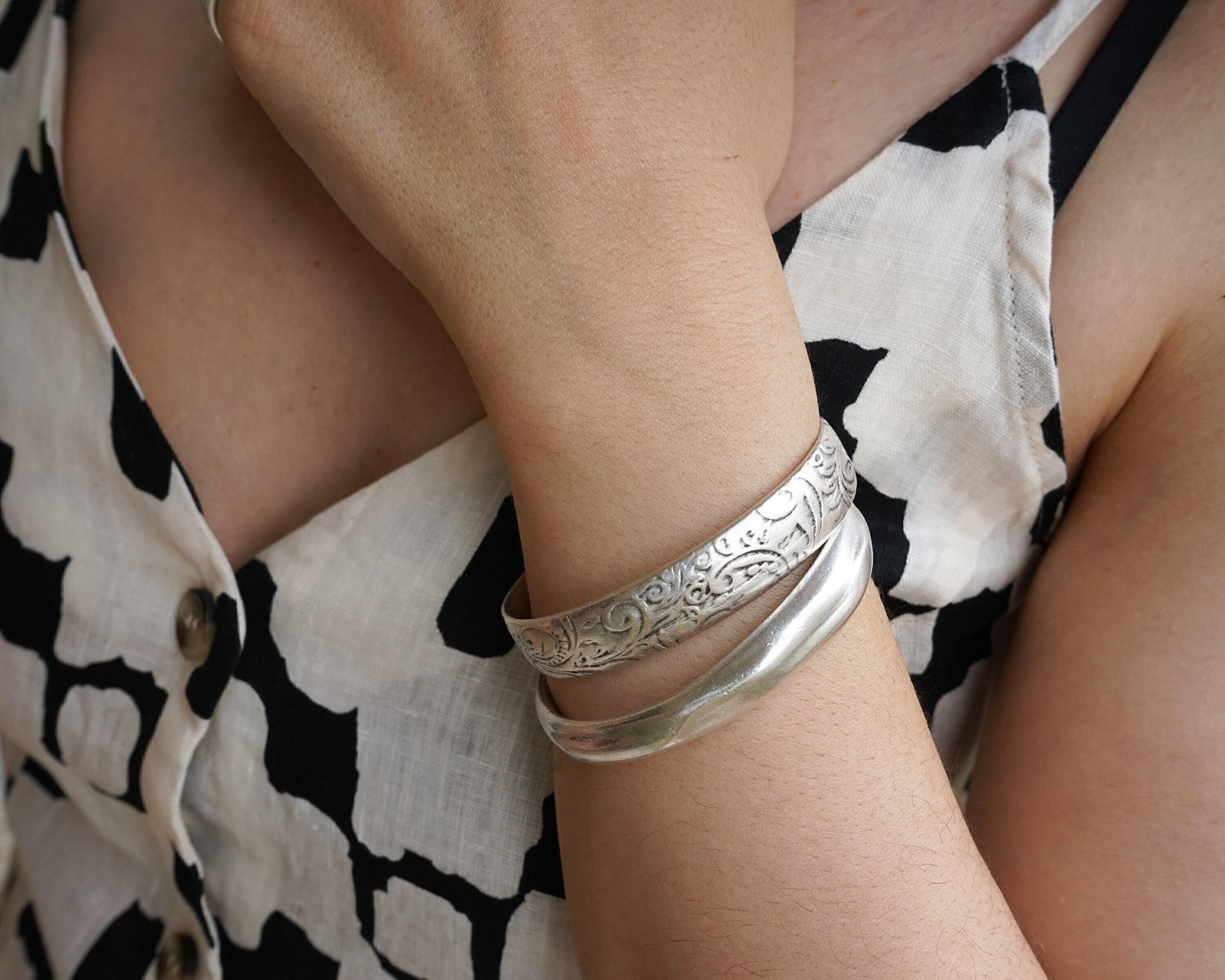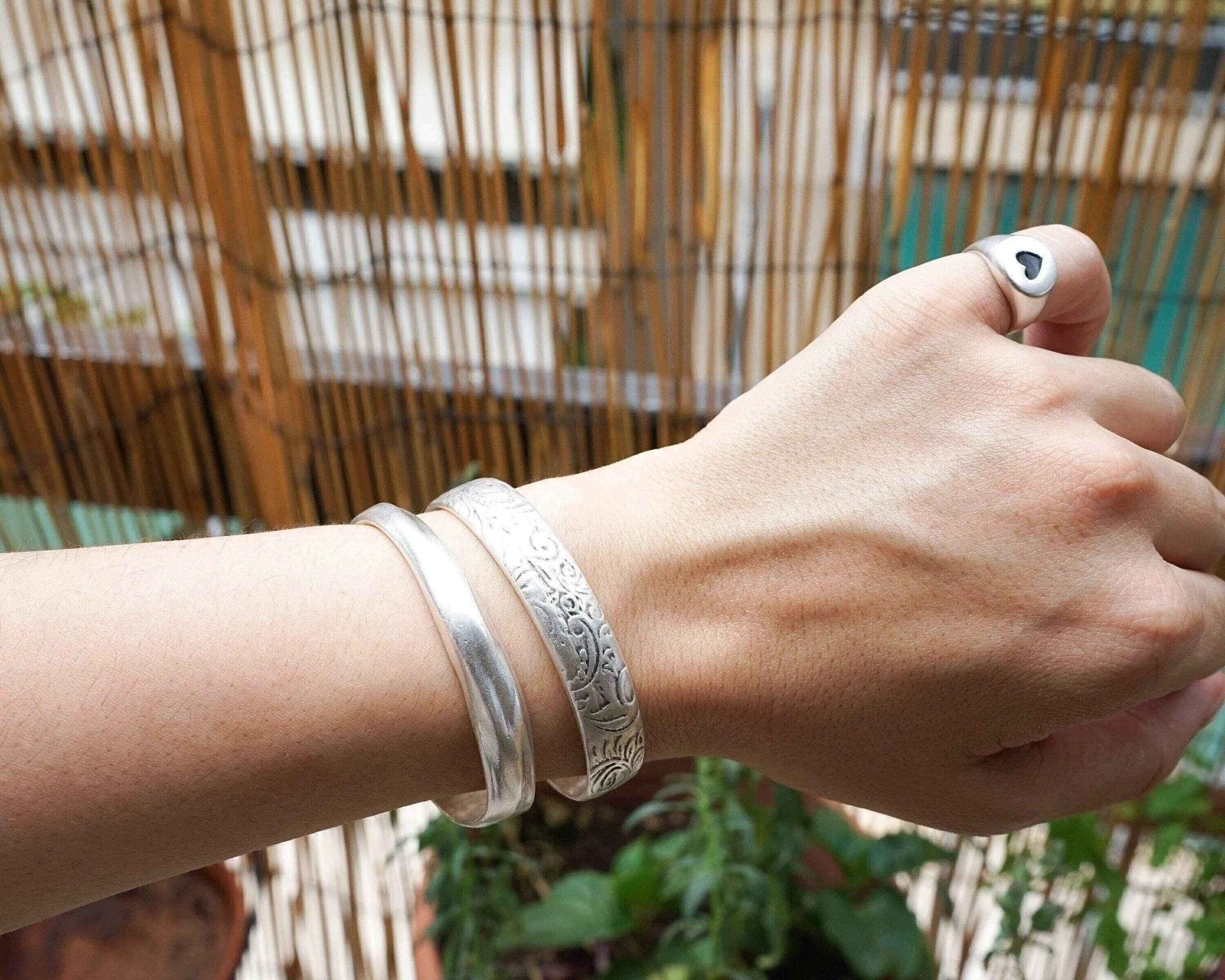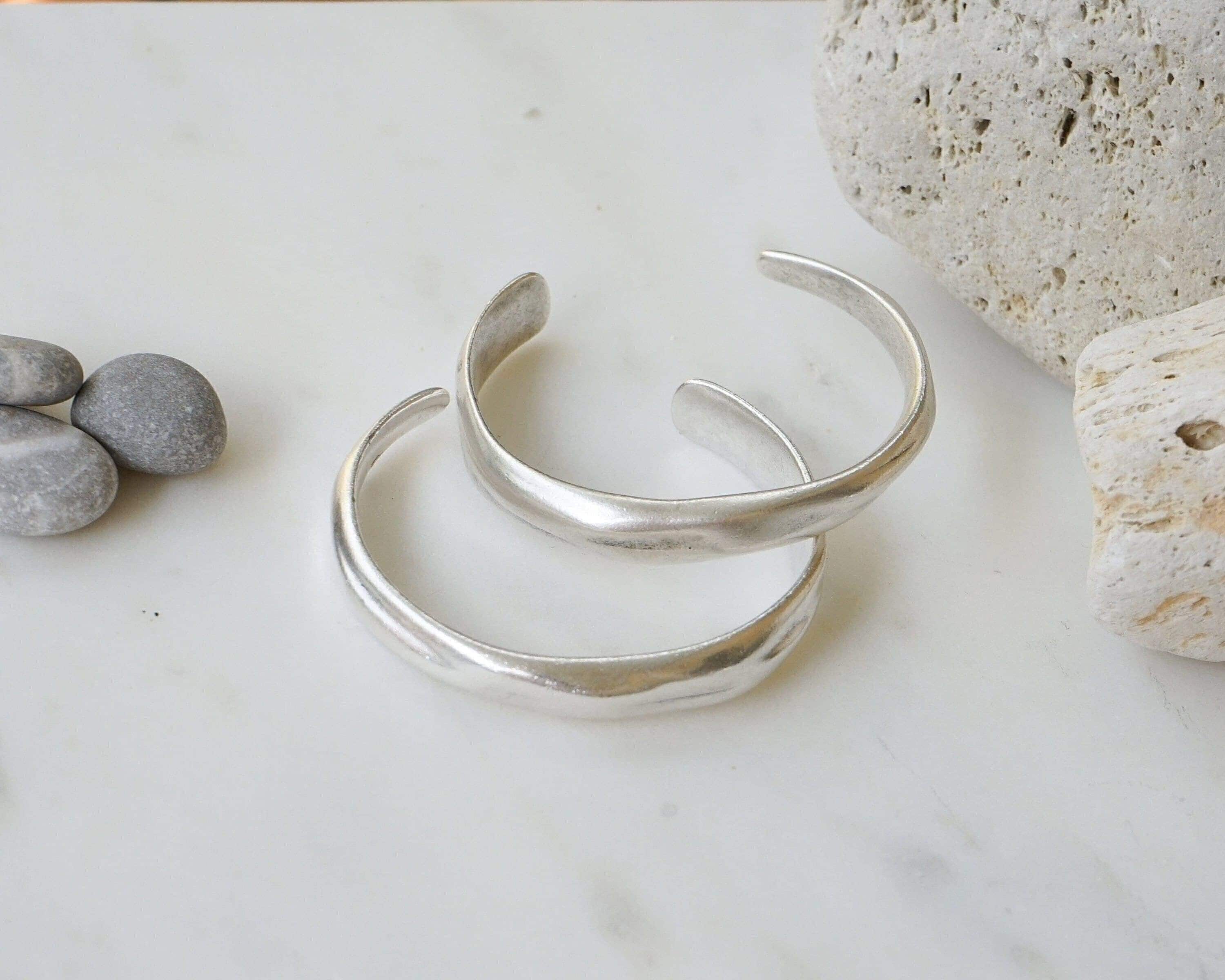This silver-plated cuff bracelet, crafted with an antique vintage look, features a beautifully hammered surface that exudes timeless elegance and versatility. Its sleek and stylish design makes it perfect for mixing and matching with other cuffs and bangles to create a personalized, layered look.