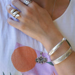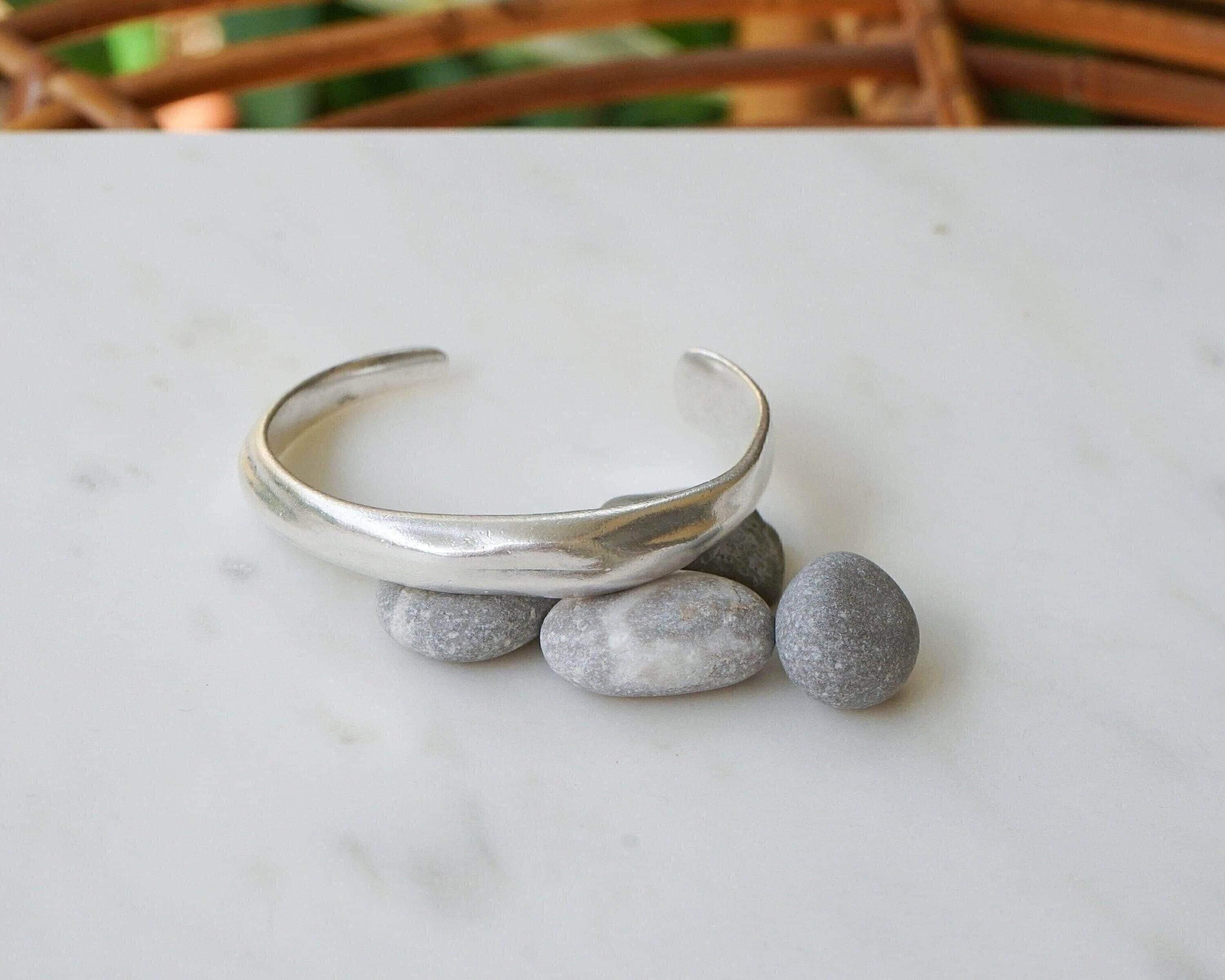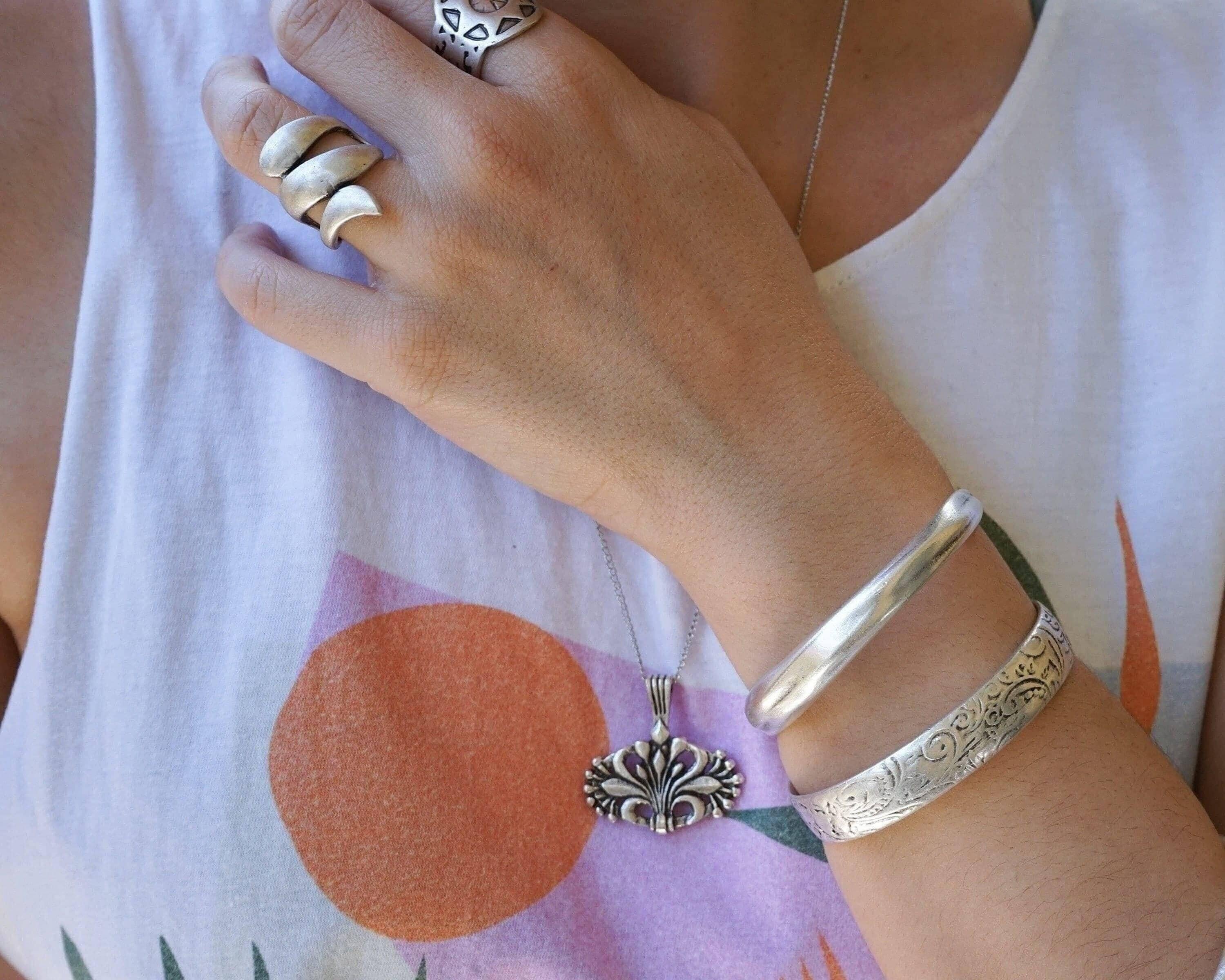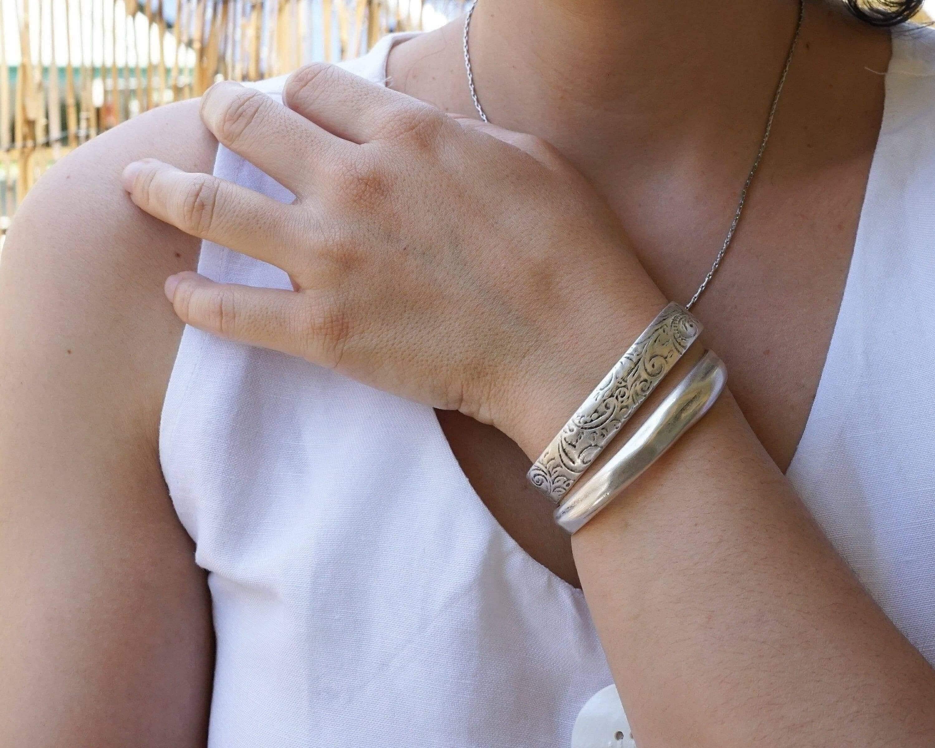 This silver-plated cuff bracelet, crafted with an antique vintage look, features a beautifully hammered surface that exudes timeless elegance and versatility. Its sleek and stylish design makes it perfect for mixing and matching with other cuffs and bangles to create a personalized, layered look.