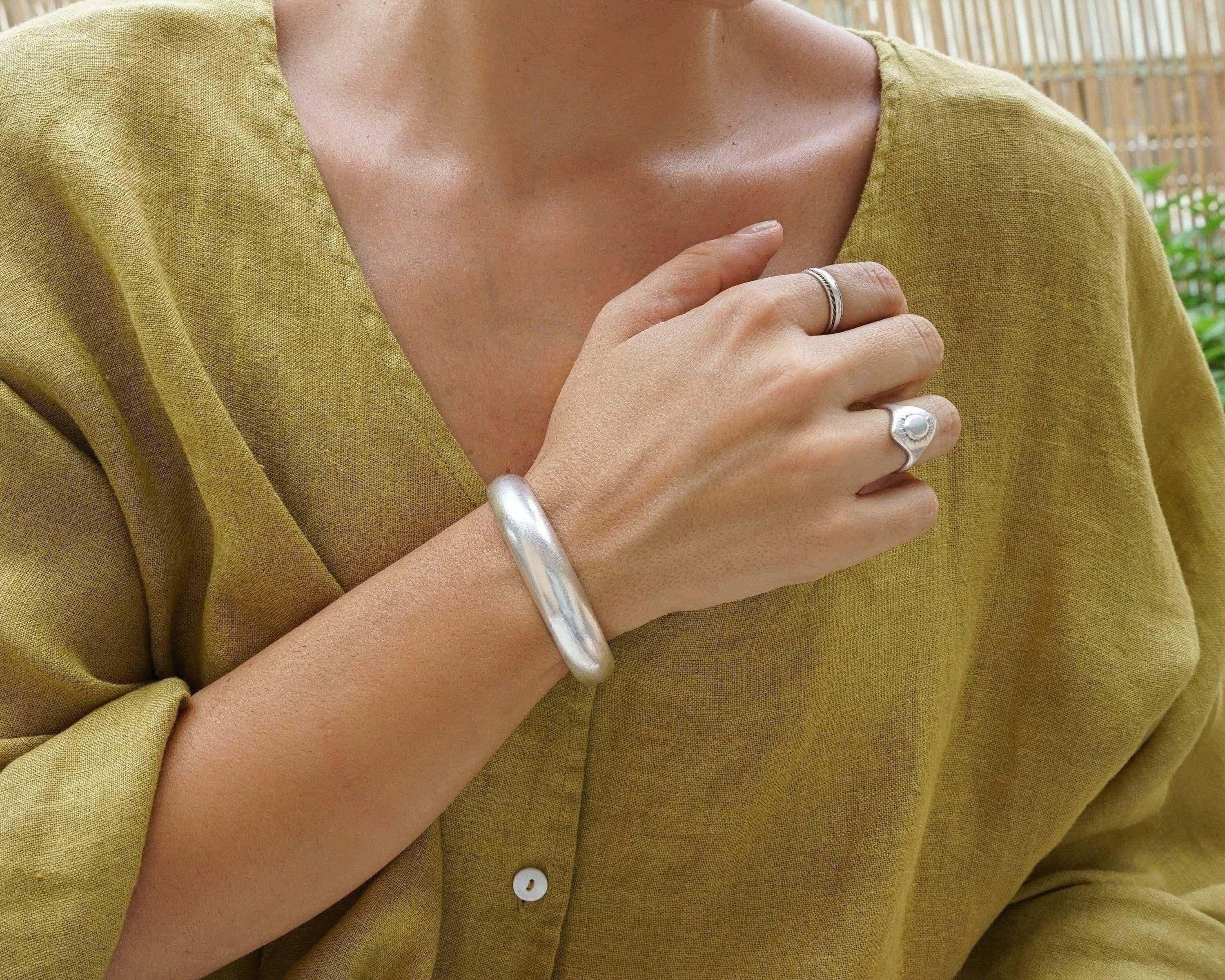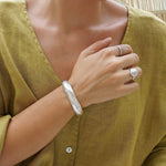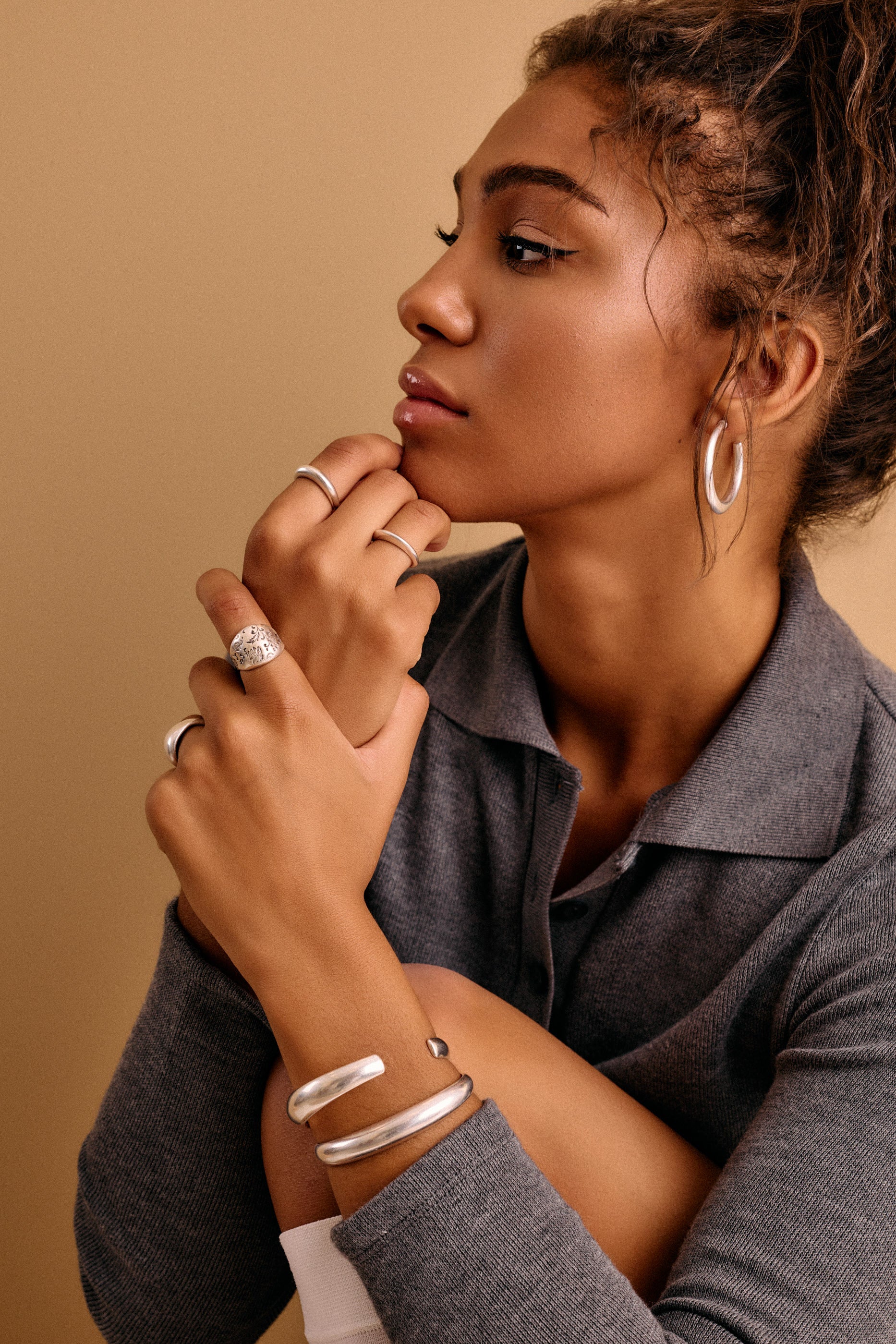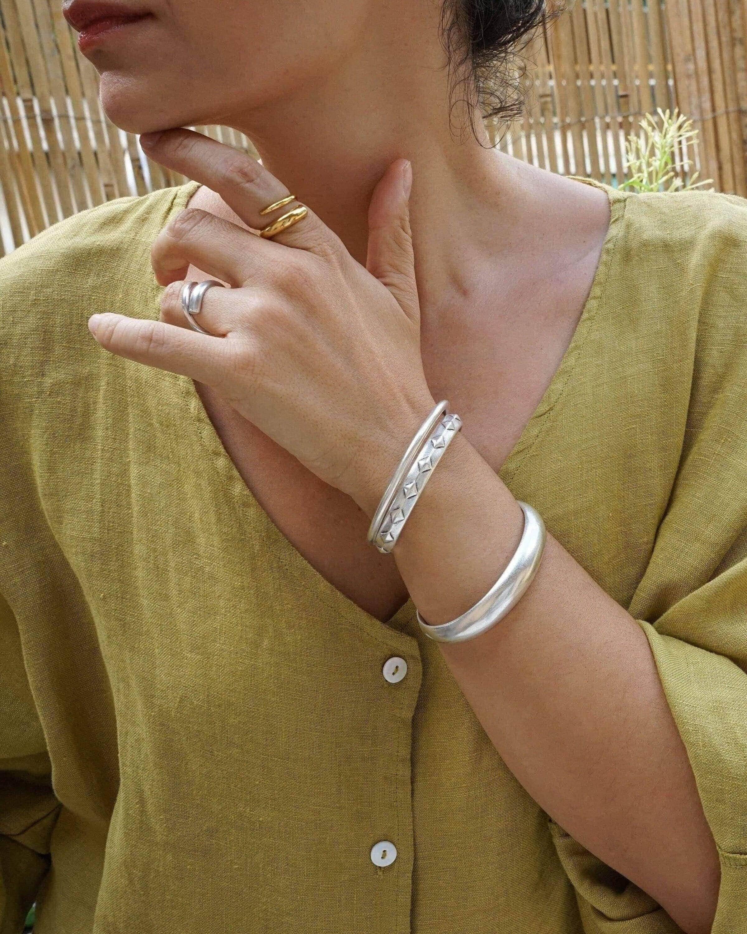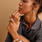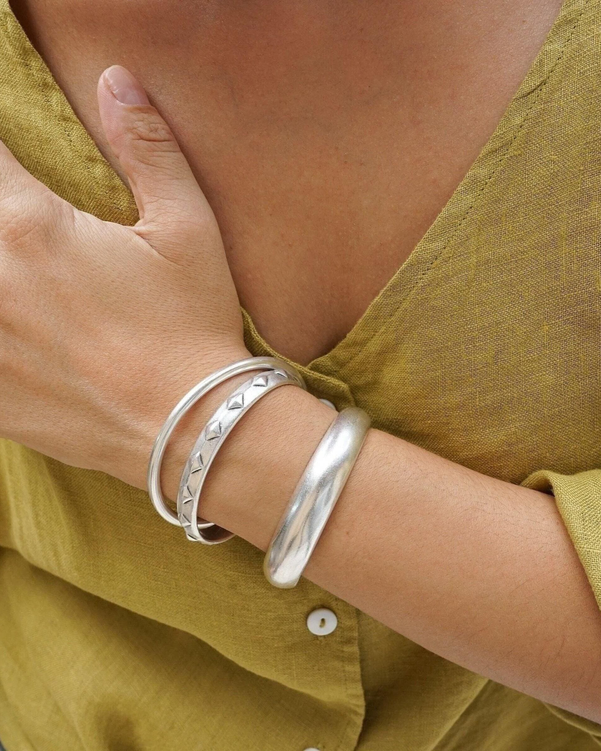 Experience the refined elegance of the Big Silver Shade Bold Cuff. Featuring sleek silver plating and a striking SADE BOLD design, this cuff is the epitome of sophistication and luxury. Its bold yet versatile style makes it the perfect accessory to pair with other cuffs and bangles, effortlessly enhancing any ensemble.