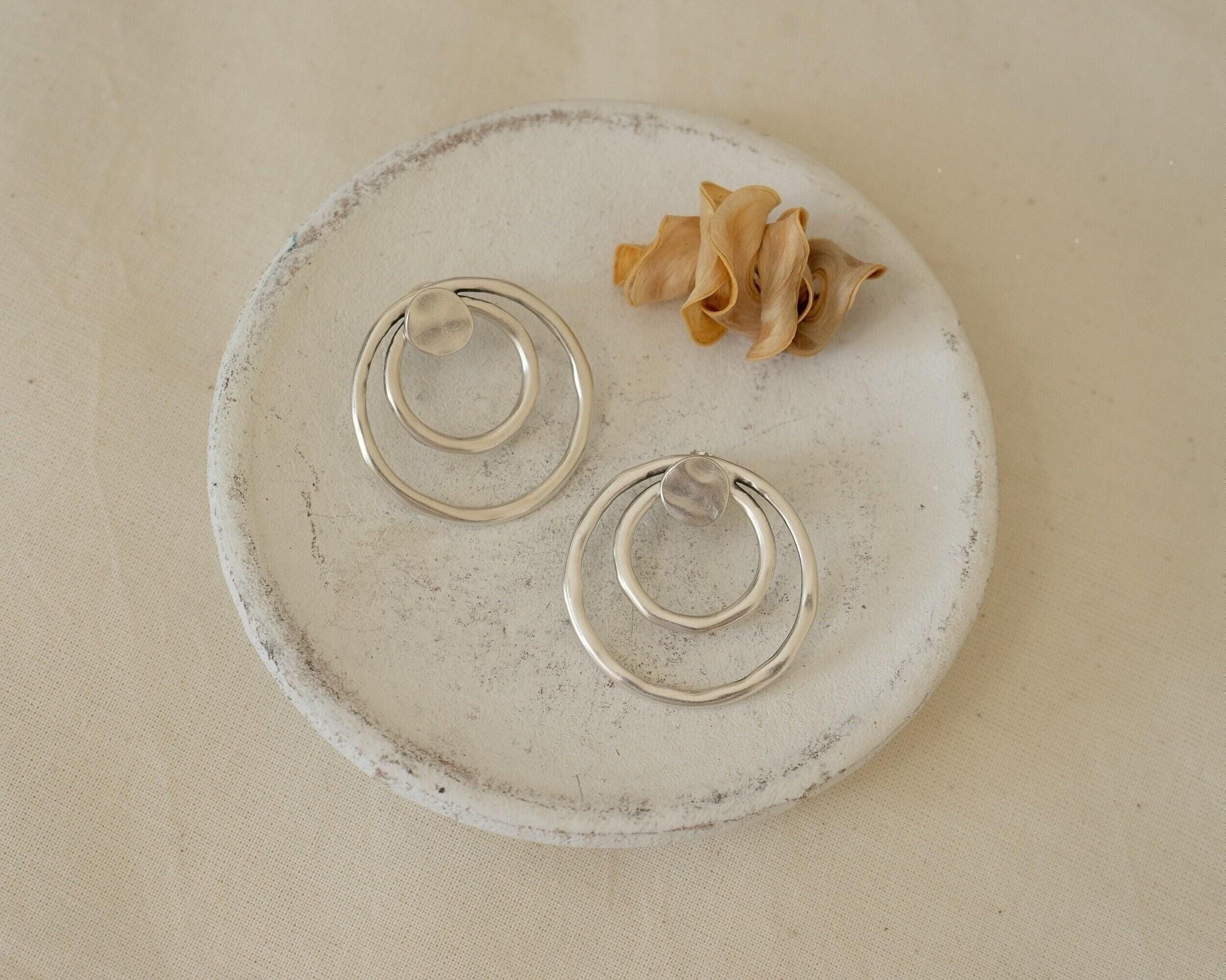 Discover these original and trendy large geometric ear jackets, an essential addition to your jewelry collection. Versatile in design, they can be worn as stylish ear jackets or transformed into wavy hammered square stud earrings. These unique and delicate pieces effortlessly elevate any outfit, making them a standout accessory.