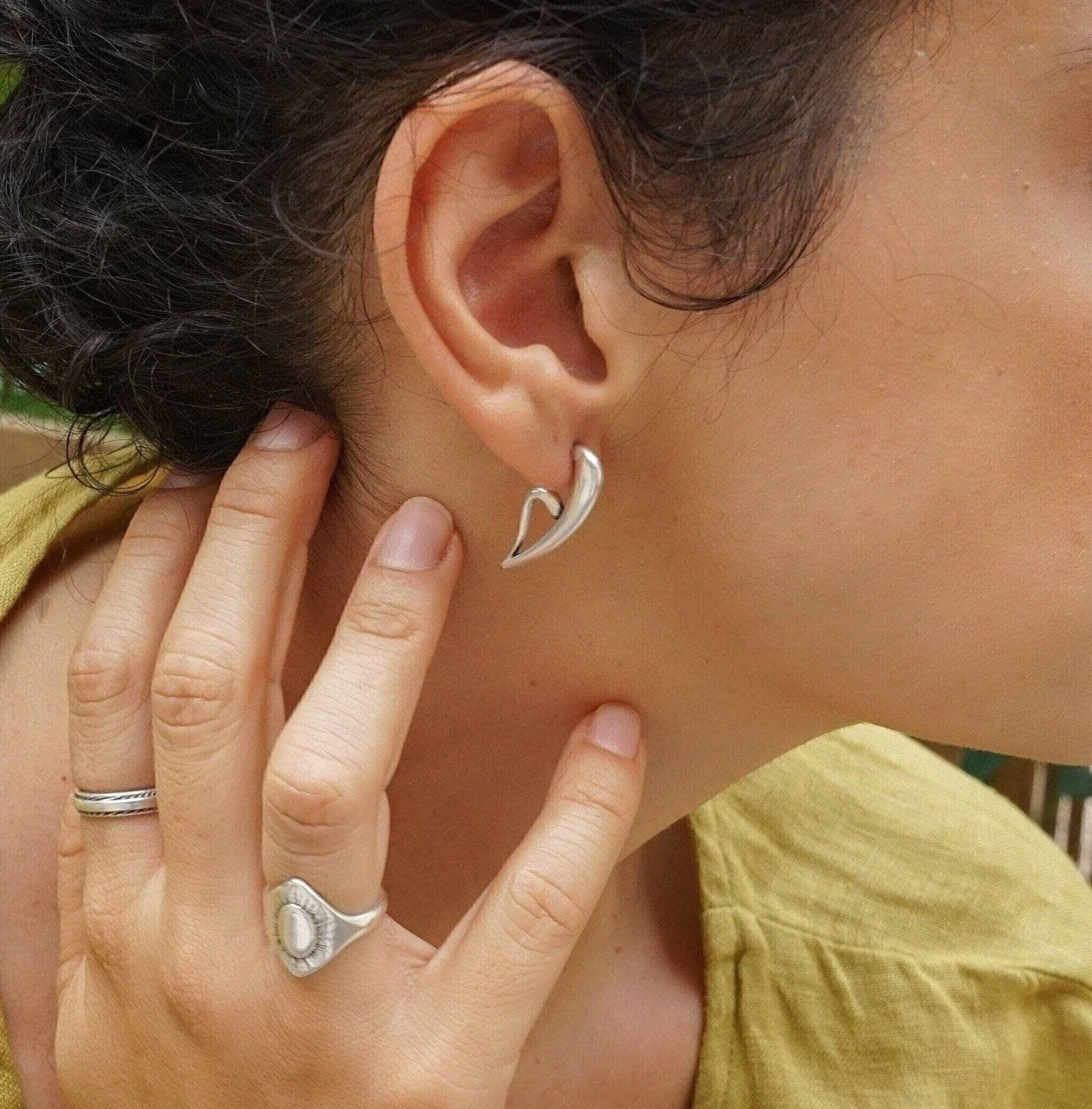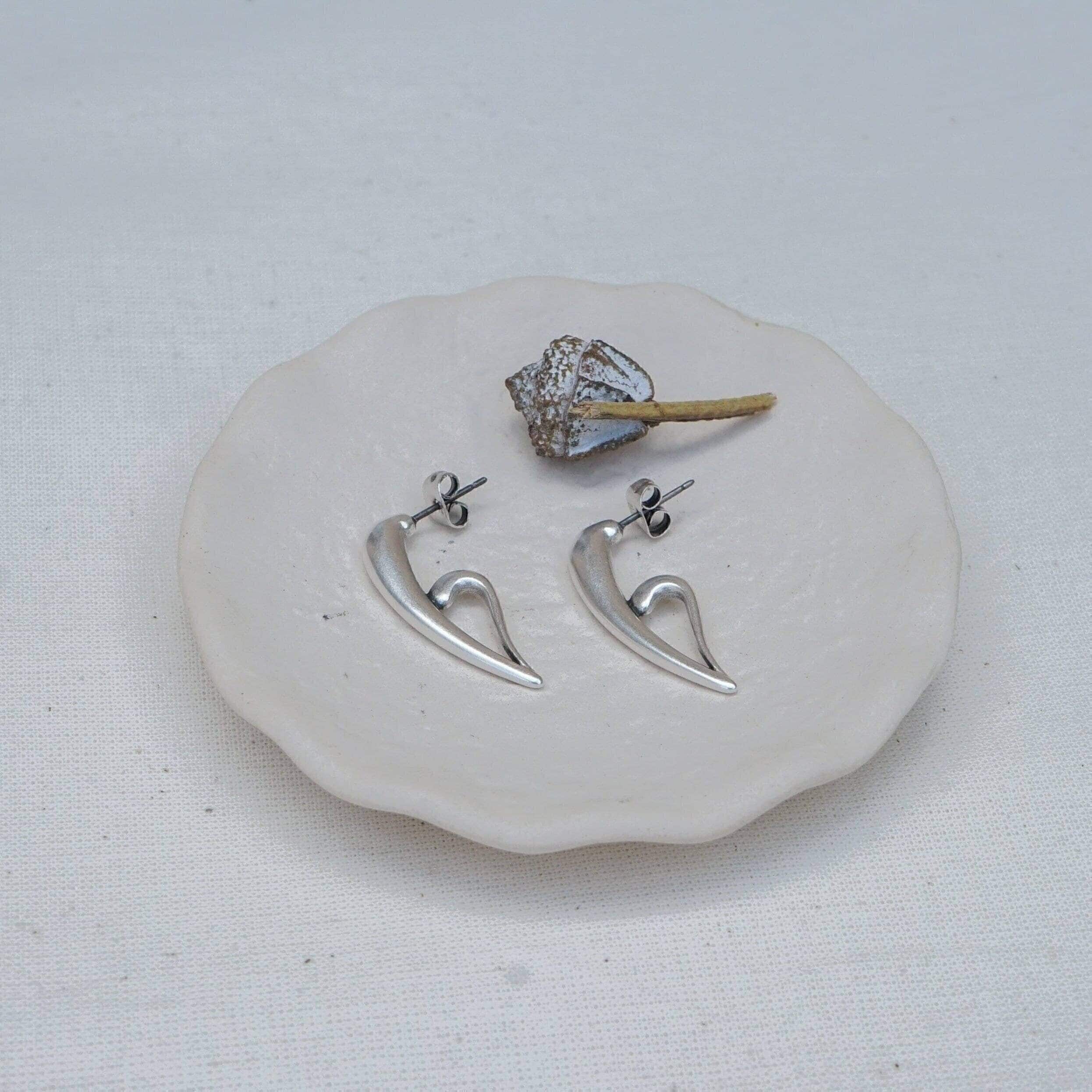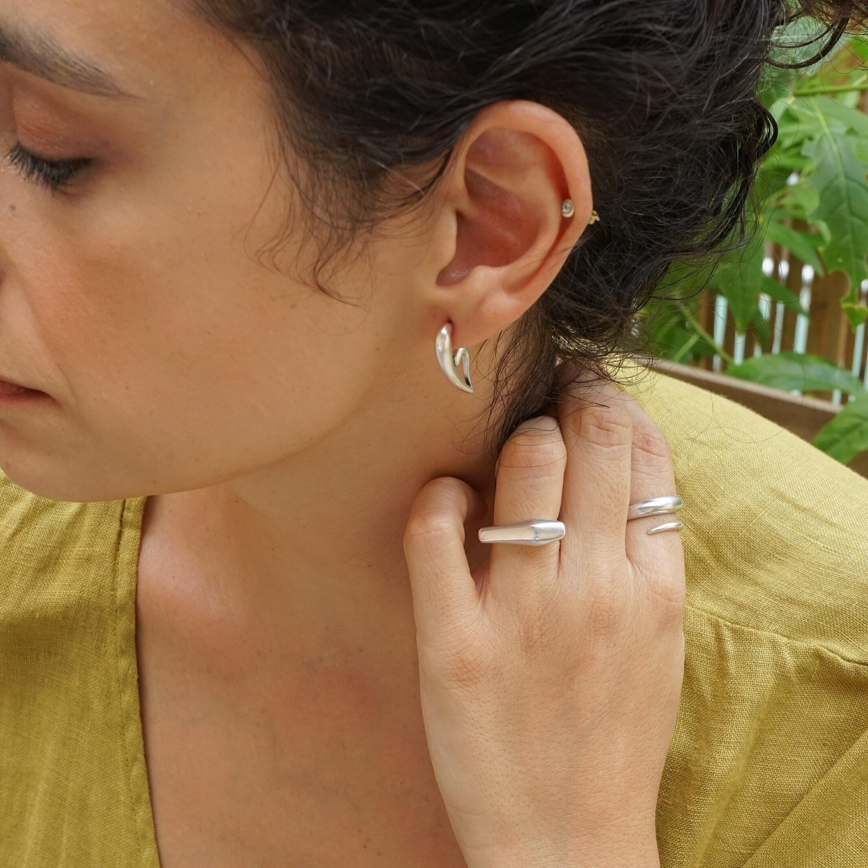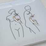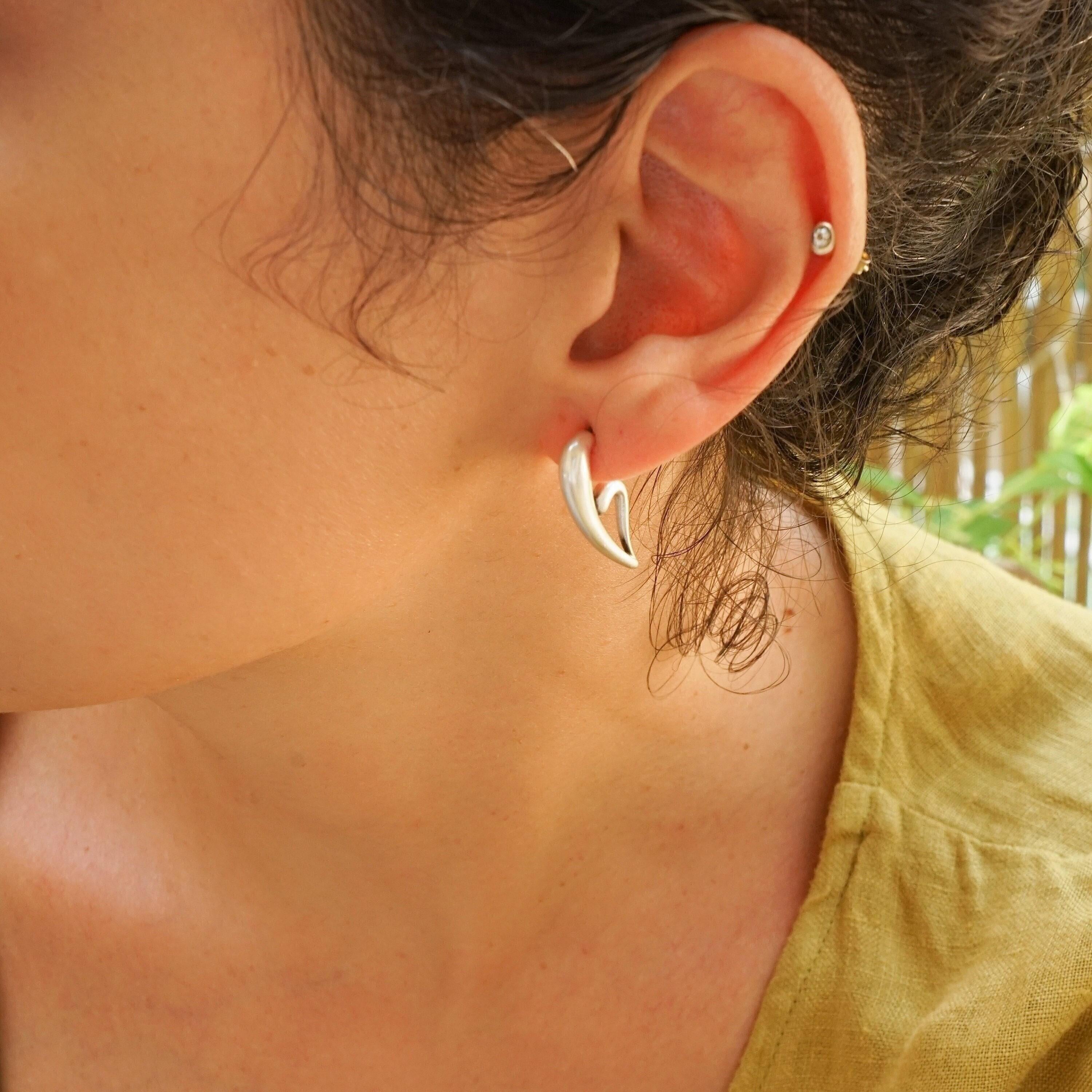 Discover a pair of distinctive, silver-plated half-heart earrings that embody a free-flowing design. With their unique 3/4 shape, these earrings can be worn solo for an elegant touch or stacked for a contemporary flair, perfect for those with multiple piercings.
