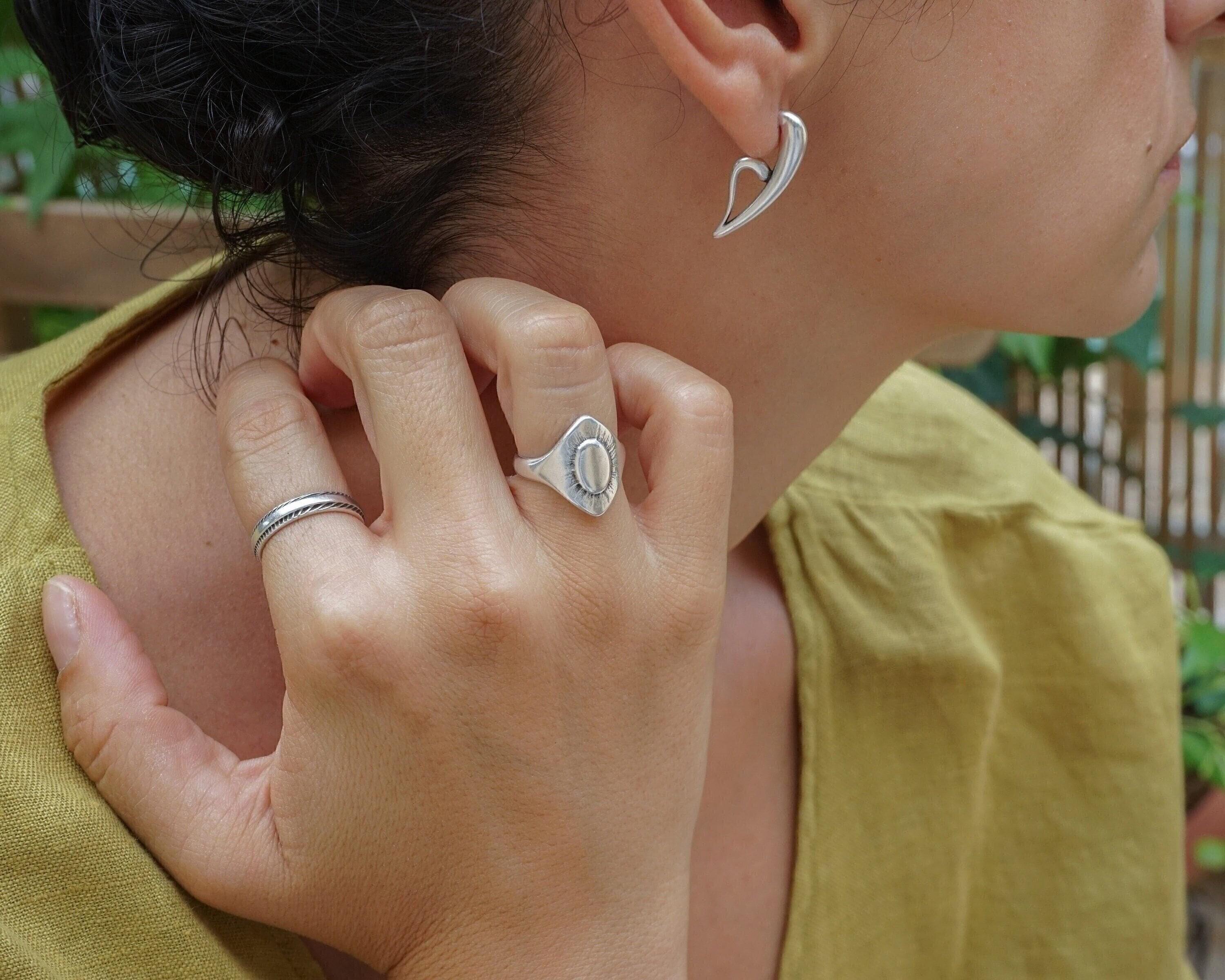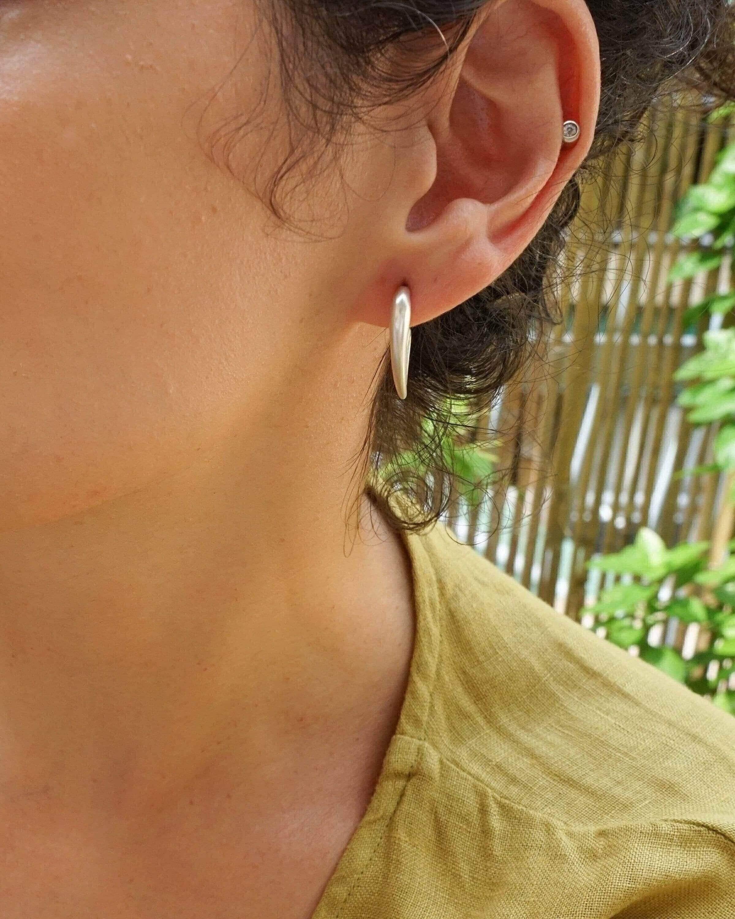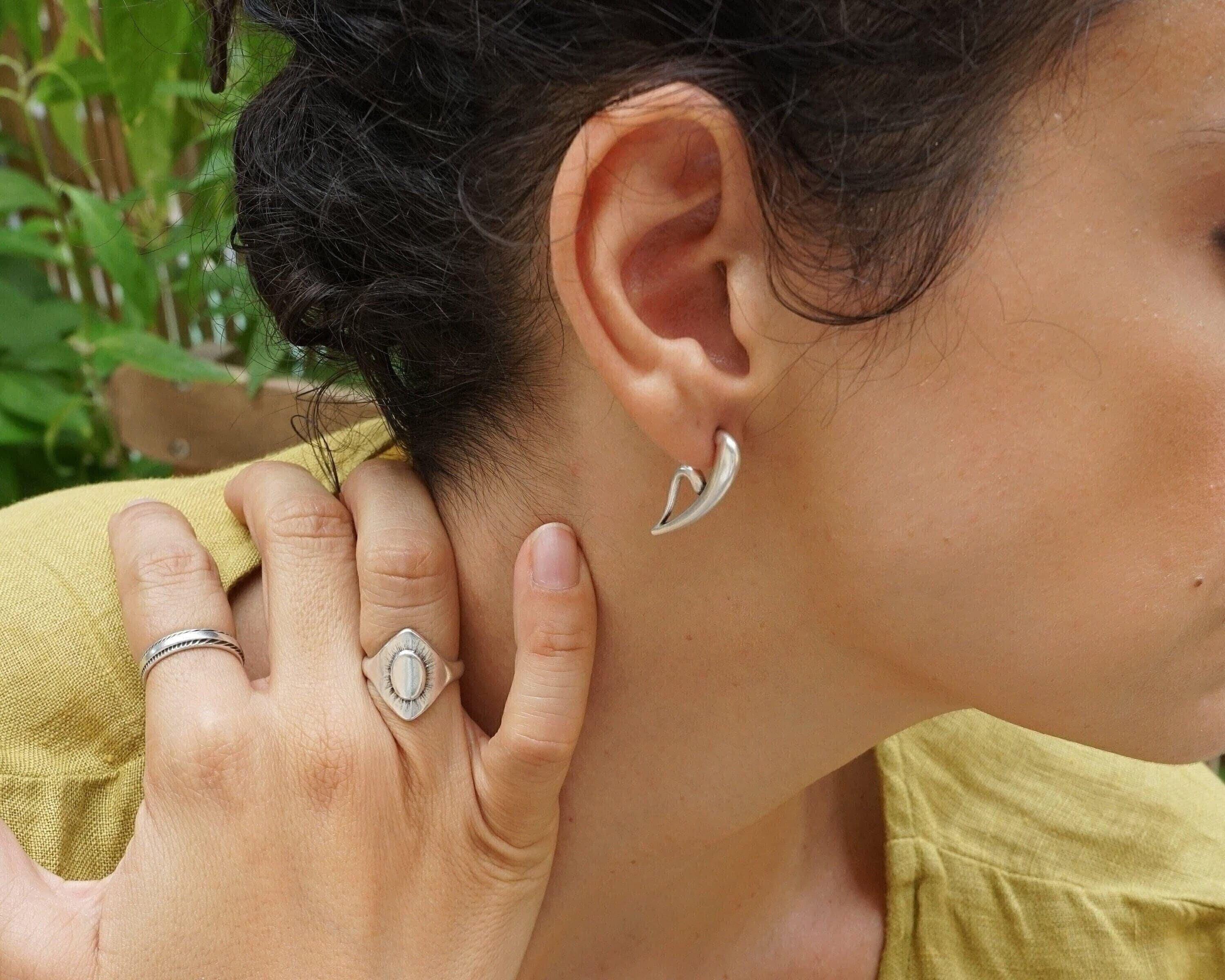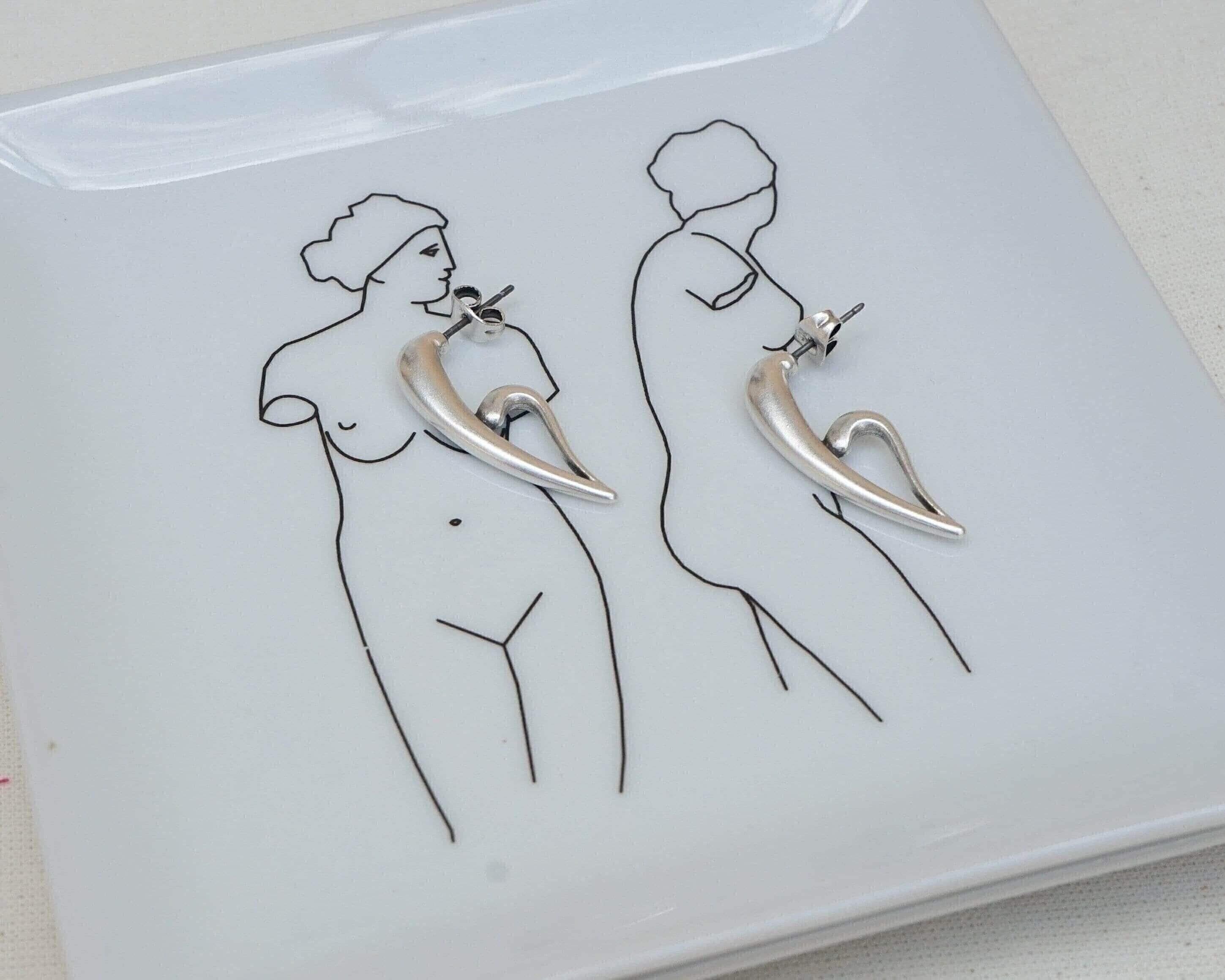 Discover a pair of distinctive, silver-plated half-heart earrings that embody a free-flowing design. With their unique 3/4 shape, these earrings can be worn solo for an elegant touch or stacked for a contemporary flair, perfect for those with multiple piercings.
