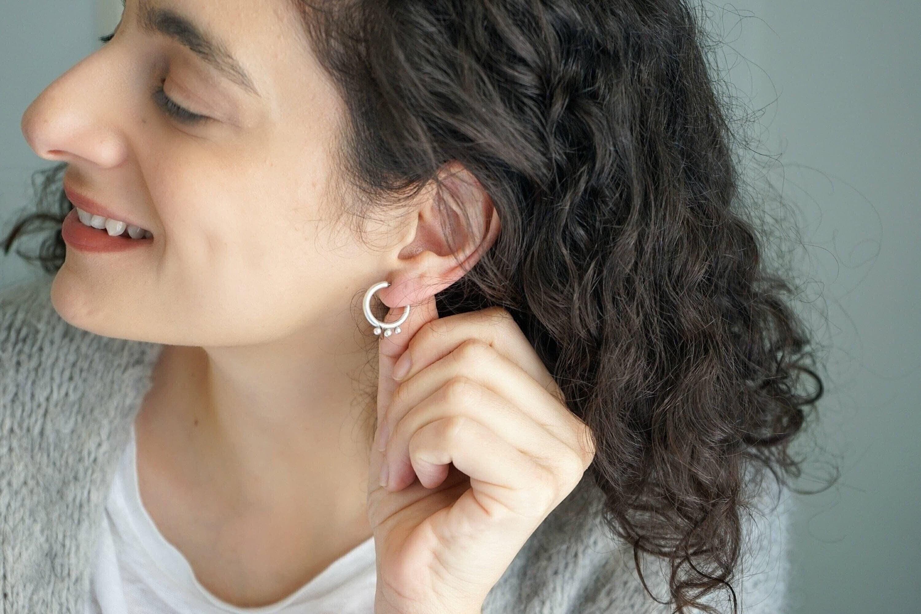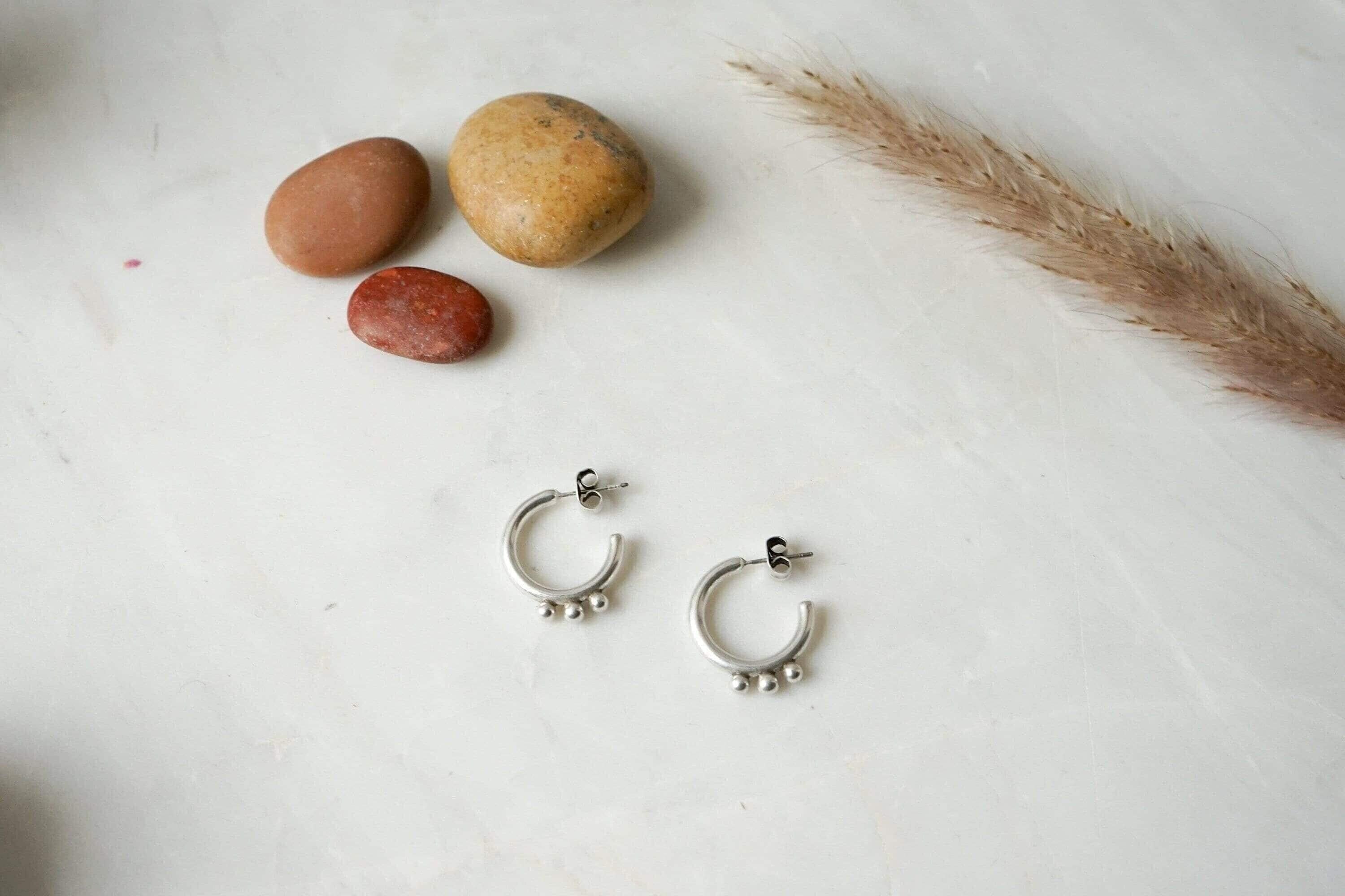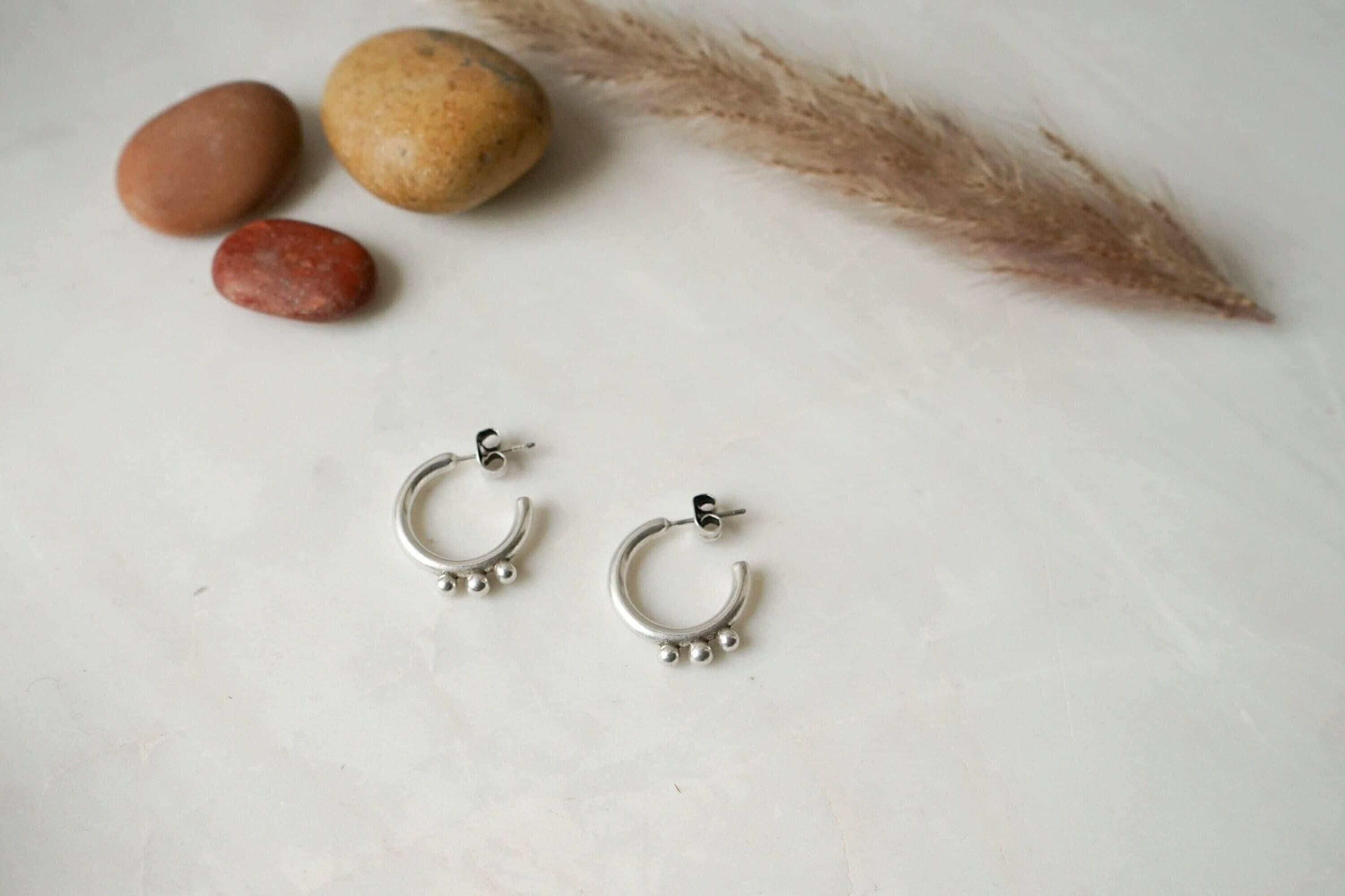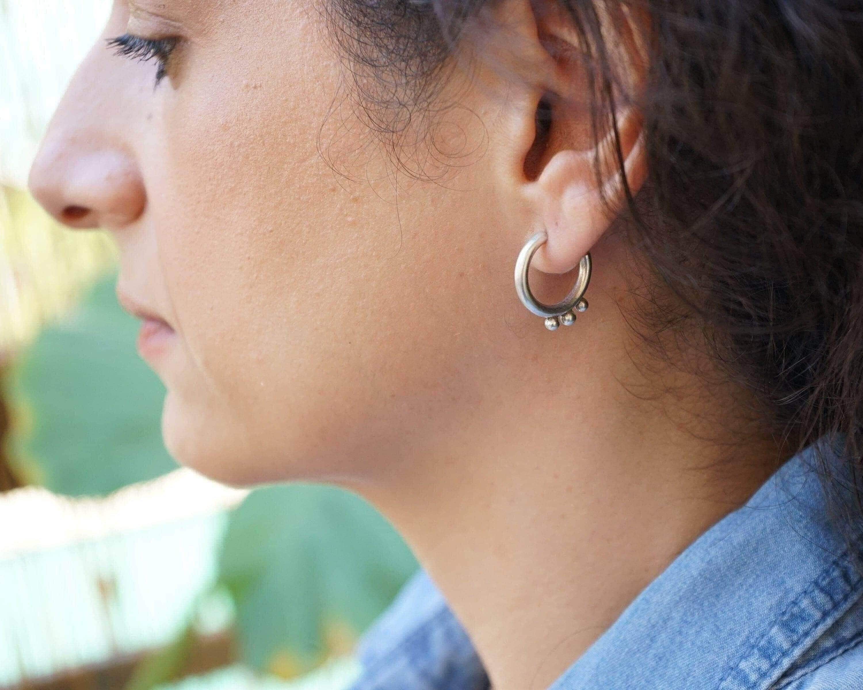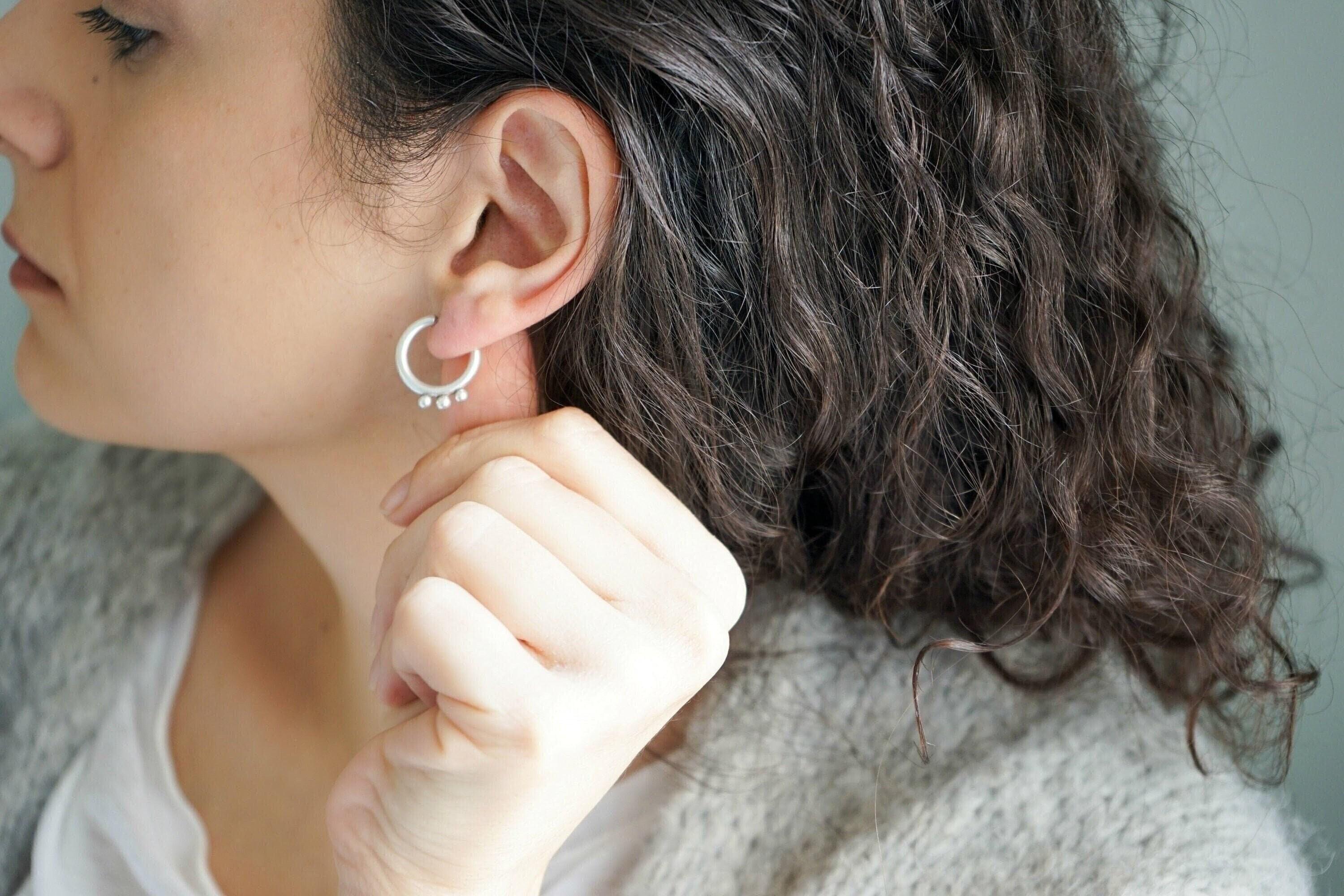 Discover the allure of these medium antique silver open hoop earrings, measuring 0.73 x 0.82 inches (18.6 x 21.2 mm). With their elegant 3/4 design and three delicate grains, these earrings offer a versatile accessory that can effortlessly transition from day to night. Wear them alone for a refined, timeless aesthetic, or stack them with other earrings to create a modern, layered look that showcases your personal style.