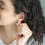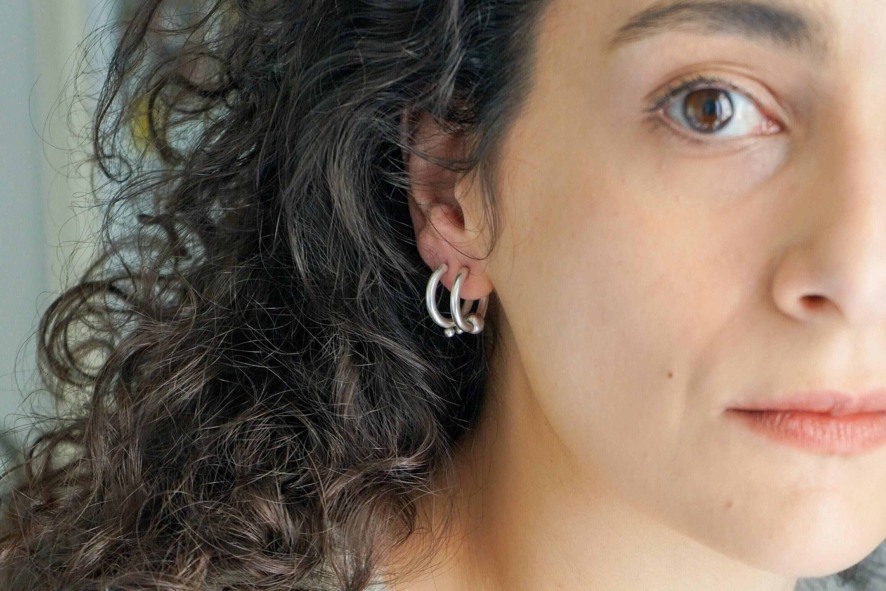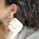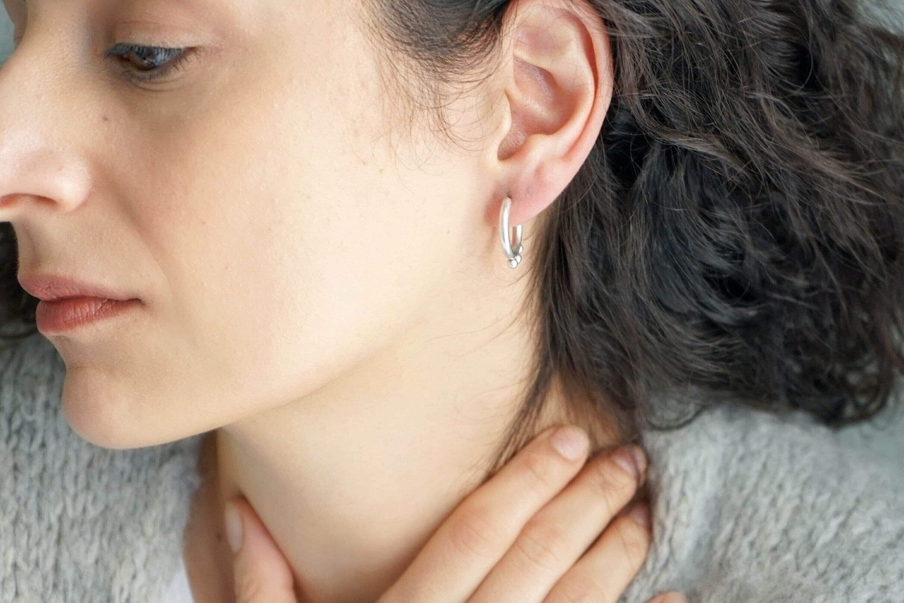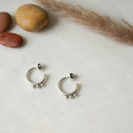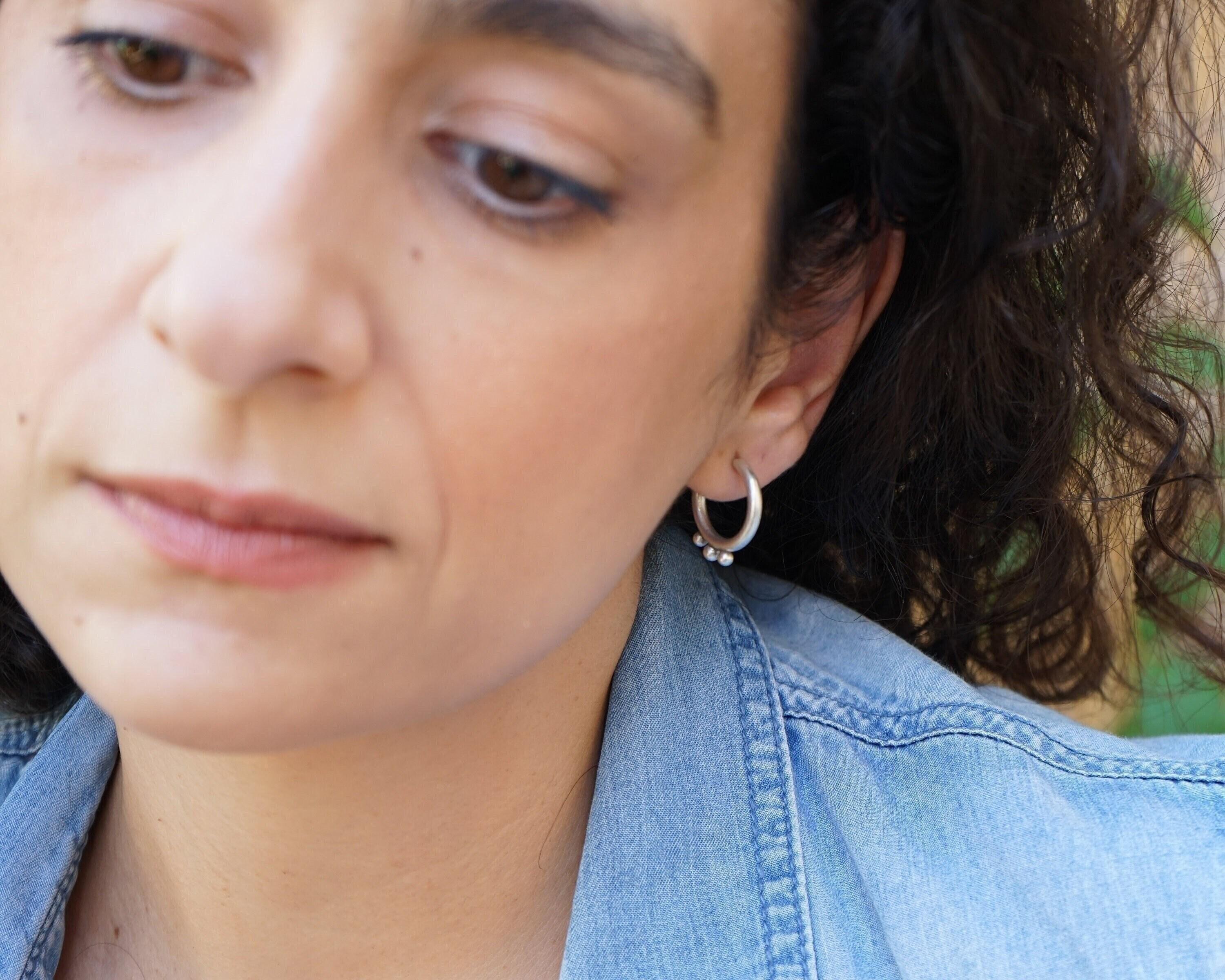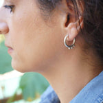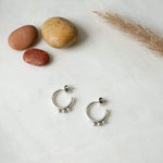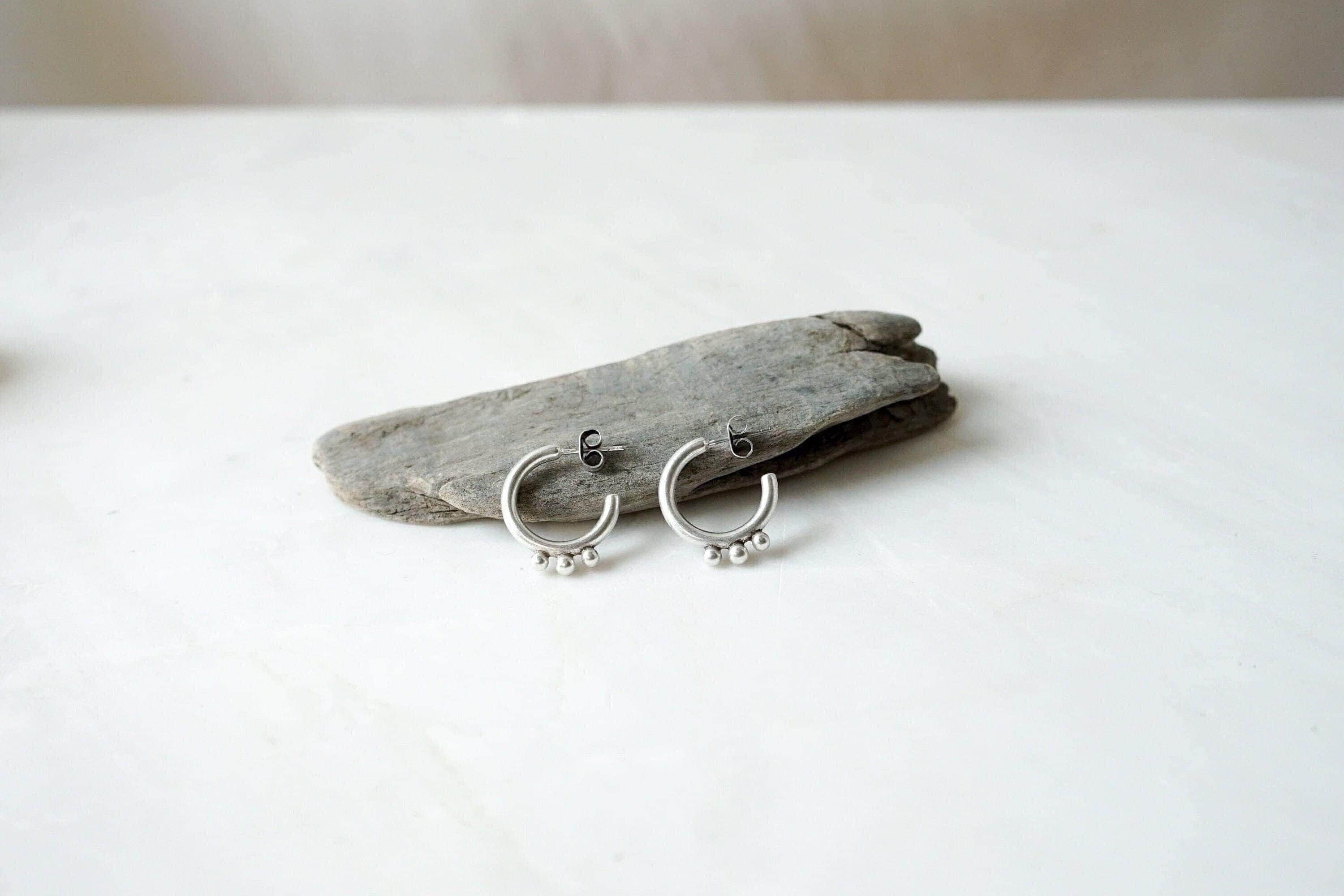 Discover the allure of these medium antique silver open hoop earrings, measuring 0.73 x 0.82 inches (18.6 x 21.2 mm). With their elegant 3/4 design and three delicate grains, these earrings offer a versatile accessory that can effortlessly transition from day to night. Wear them alone for a refined, timeless aesthetic, or stack them with other earrings to create a modern, layered look that showcases your personal style.