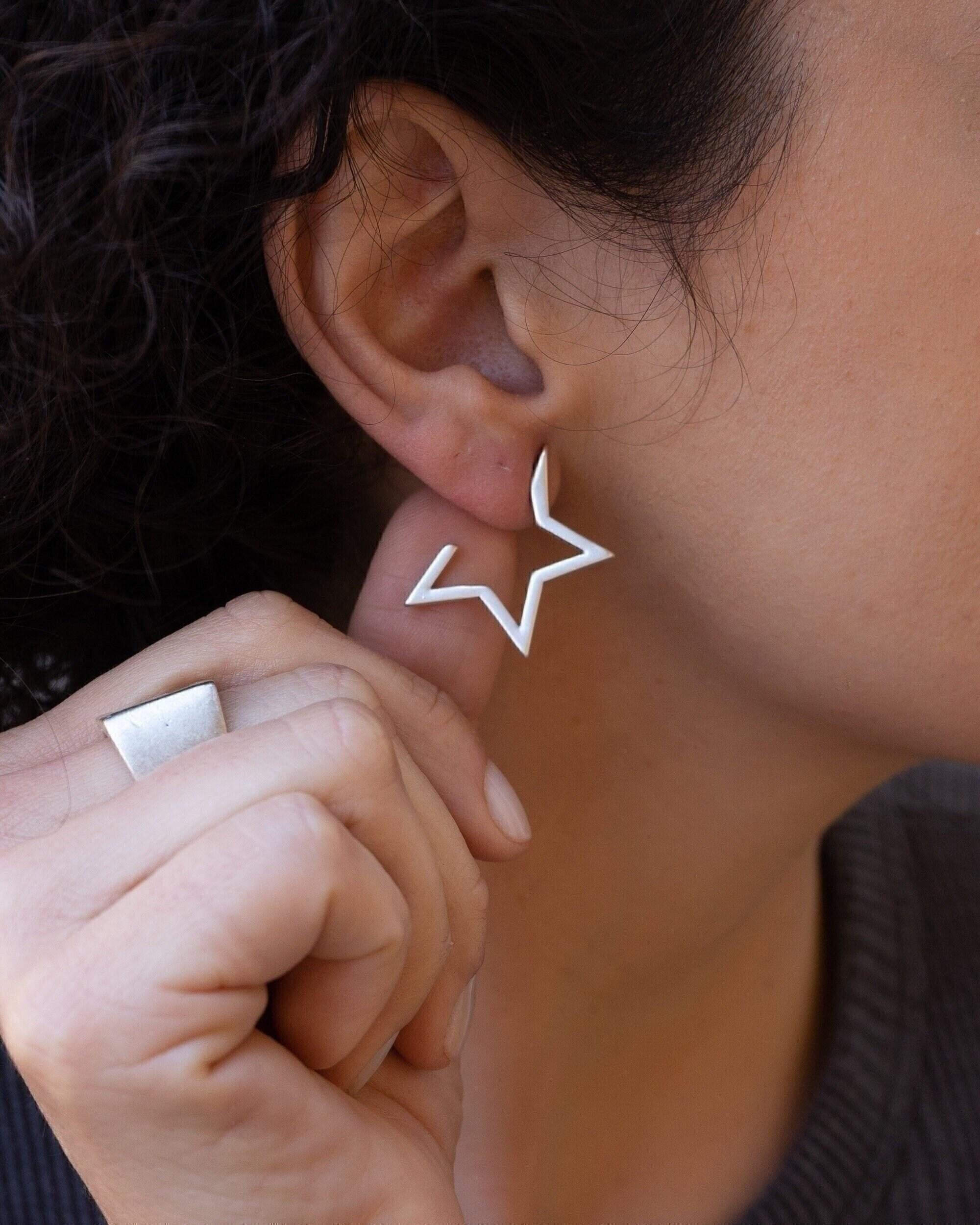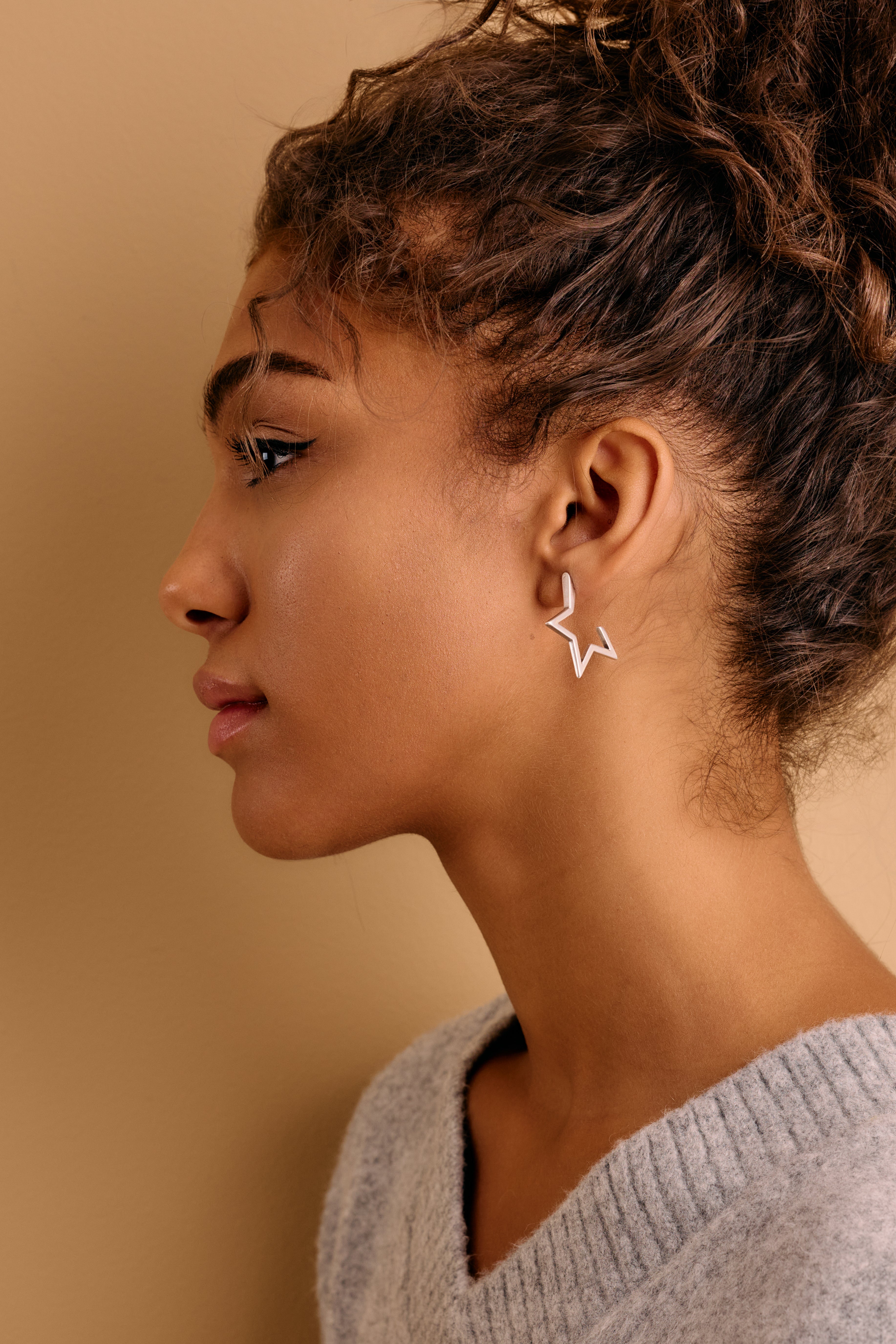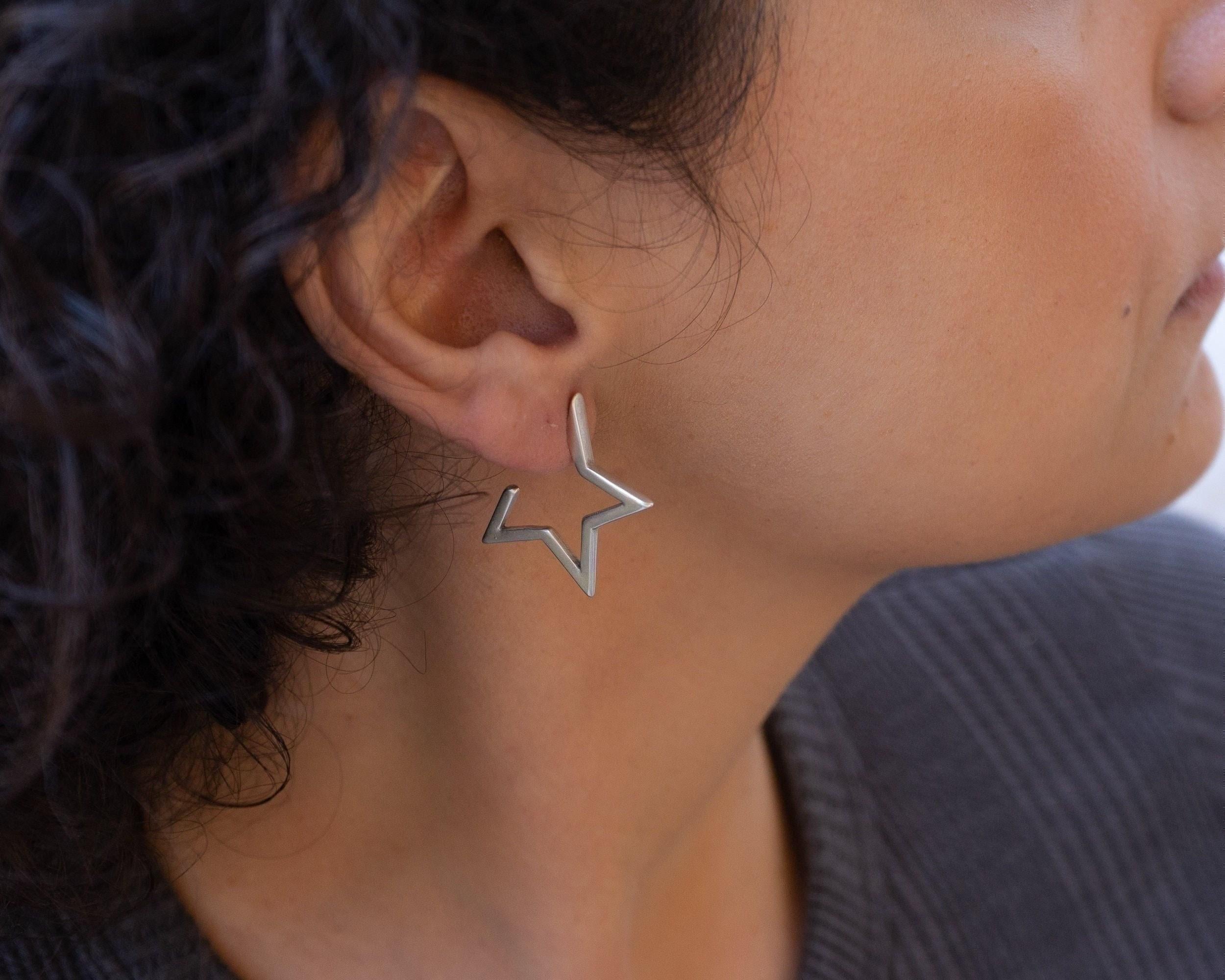 Discover the charm of these silver-plated zamak hoop earrings, featuring a distinctive open star design. Measuring 1.02 x 1.21 inches (26 x 30.9 mm), these 3/4 open hoops are a versatile addition to your jewelry collection, perfect for enhancing your contemporary style.