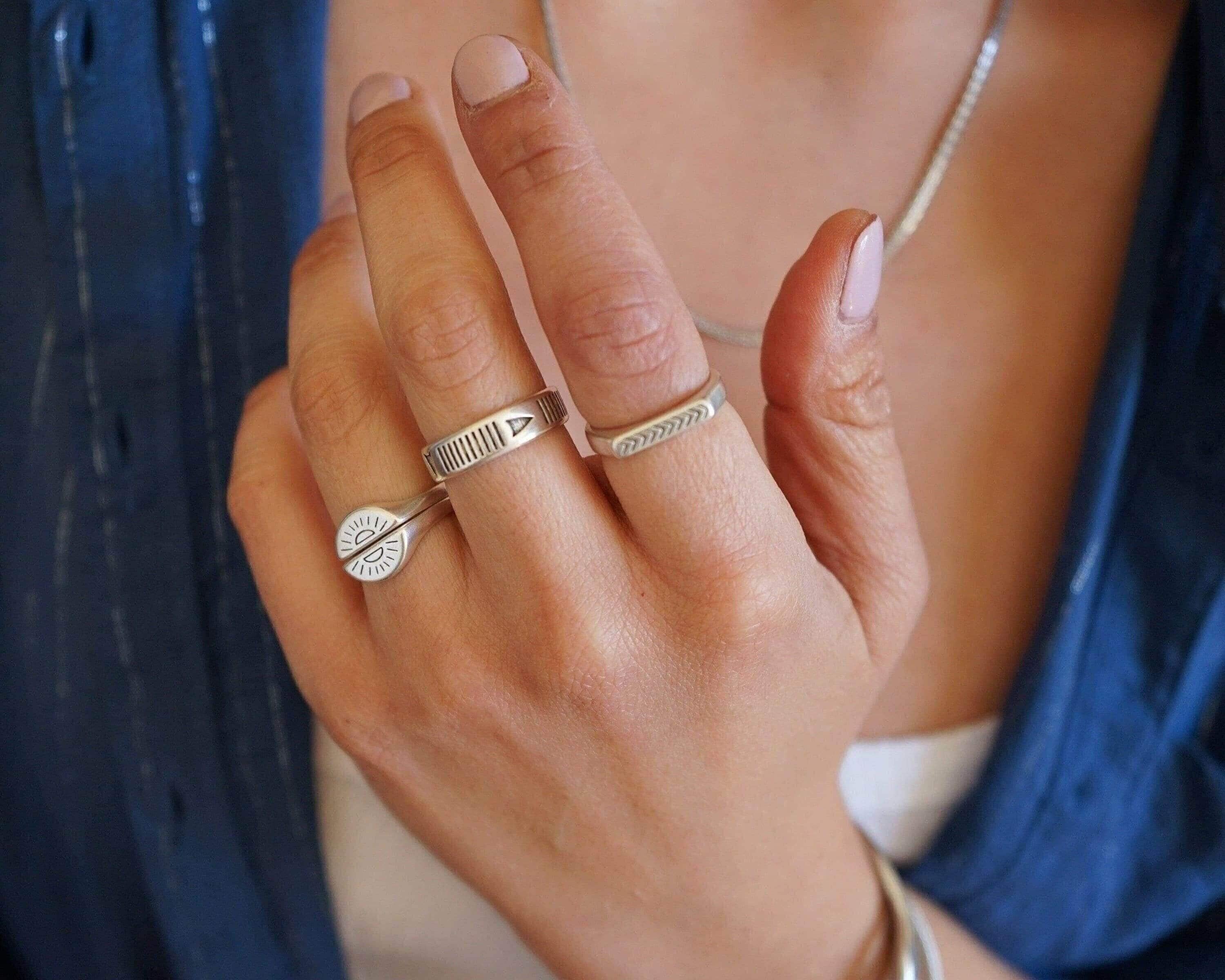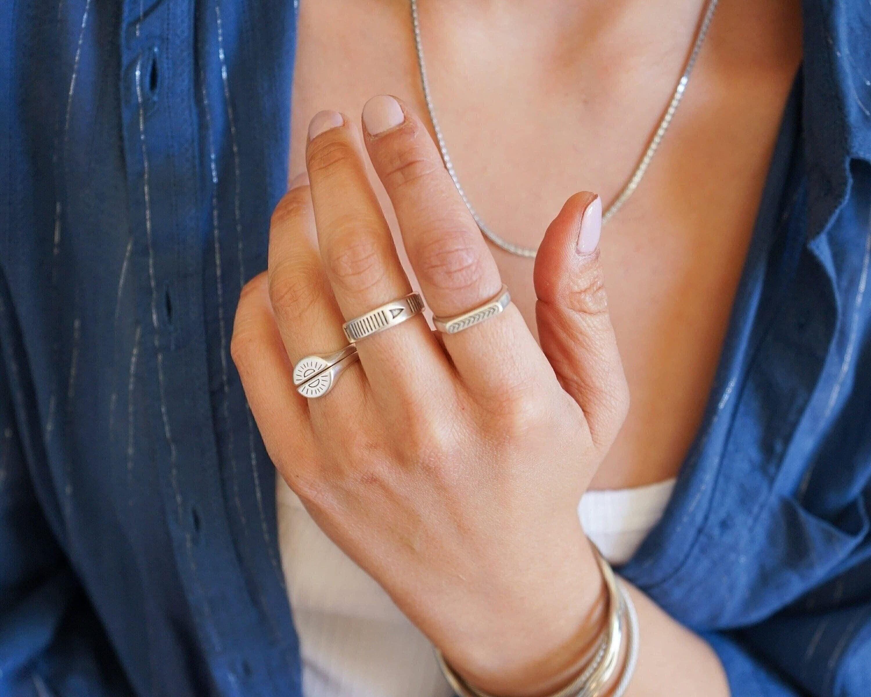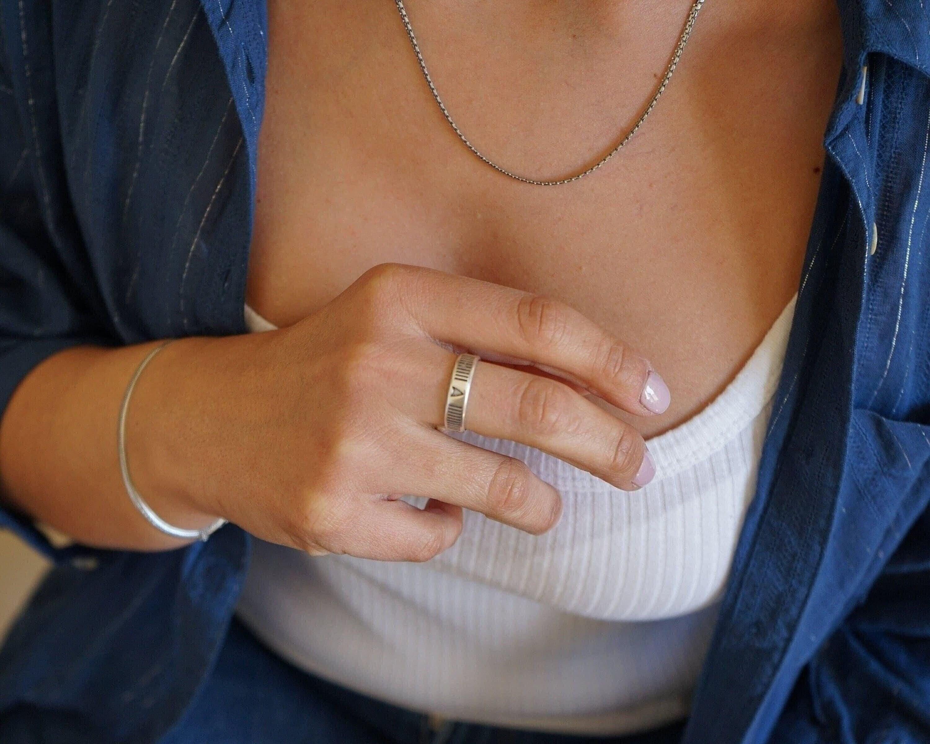 Discover the charm of our intricately designed silver-plated band ring featuring a detailed compass symbol pattern. This versatile ring can be comfortably worn on your index, middle, or ring finger, making it a perfect addition to any jewelry collection. Its unique design pairs beautifully with both casual outfits, such as a simple shirt and jeans, or dressier ensembles for a night out. Wear it alone for a subtle statement, or stack it with other rings to create a personalized look. Crafted from durable silver-plated zamak, this ring combines style with lasting quality.