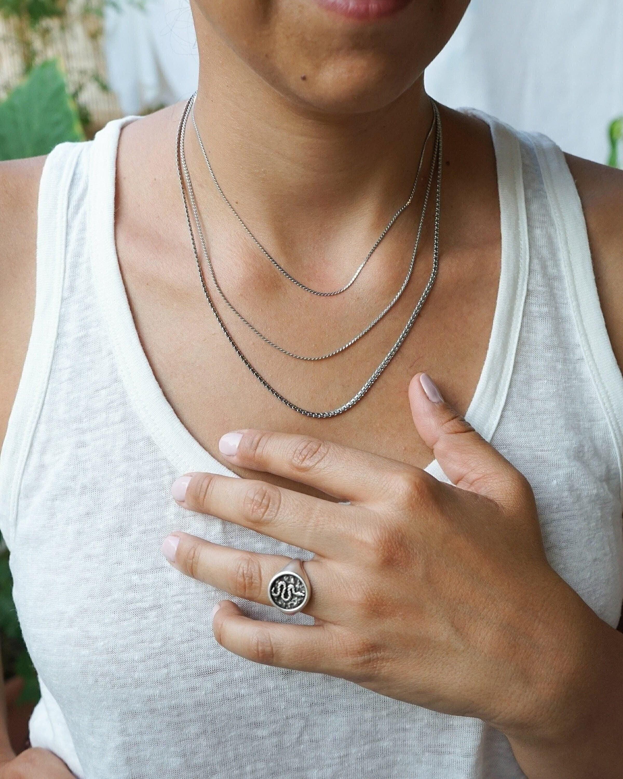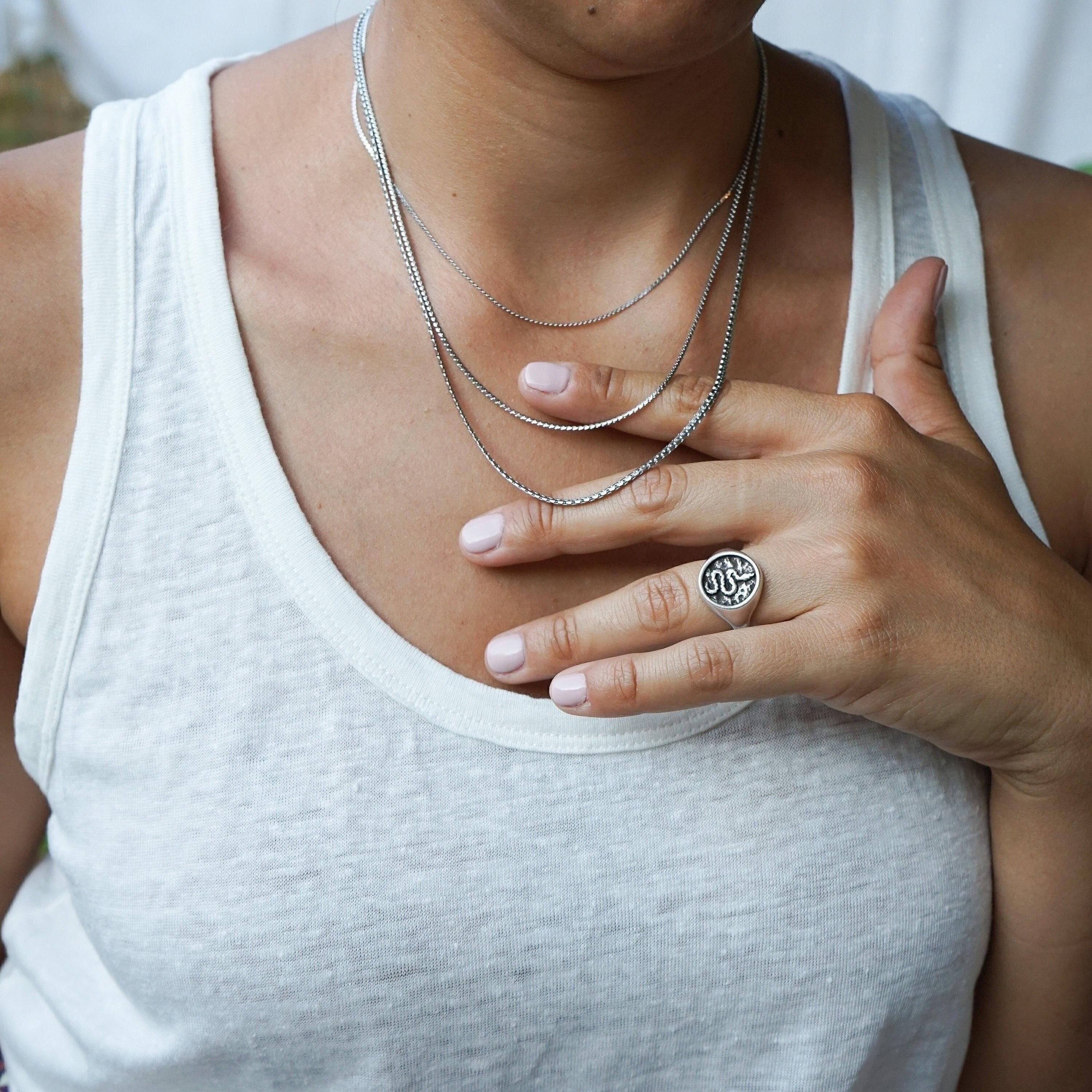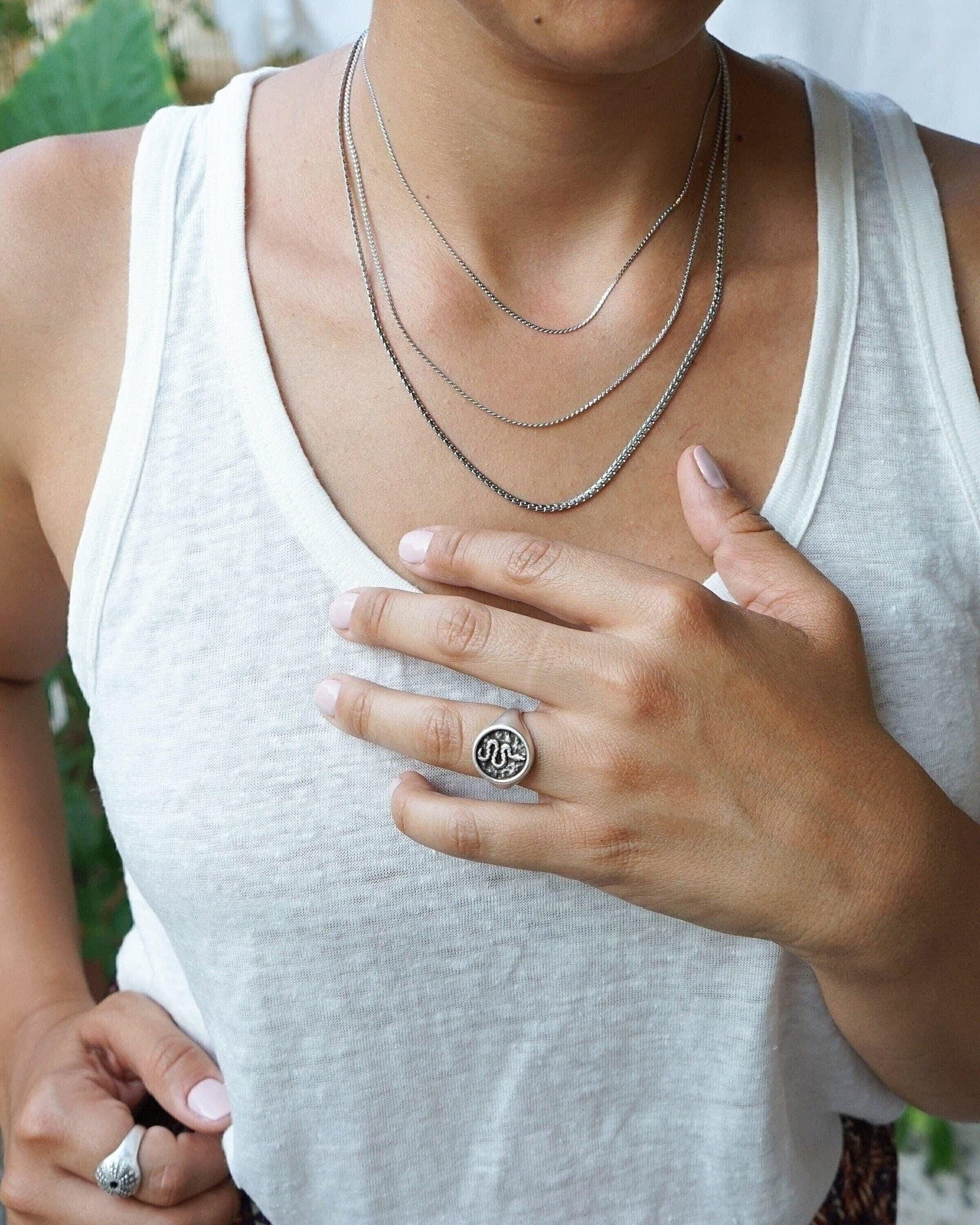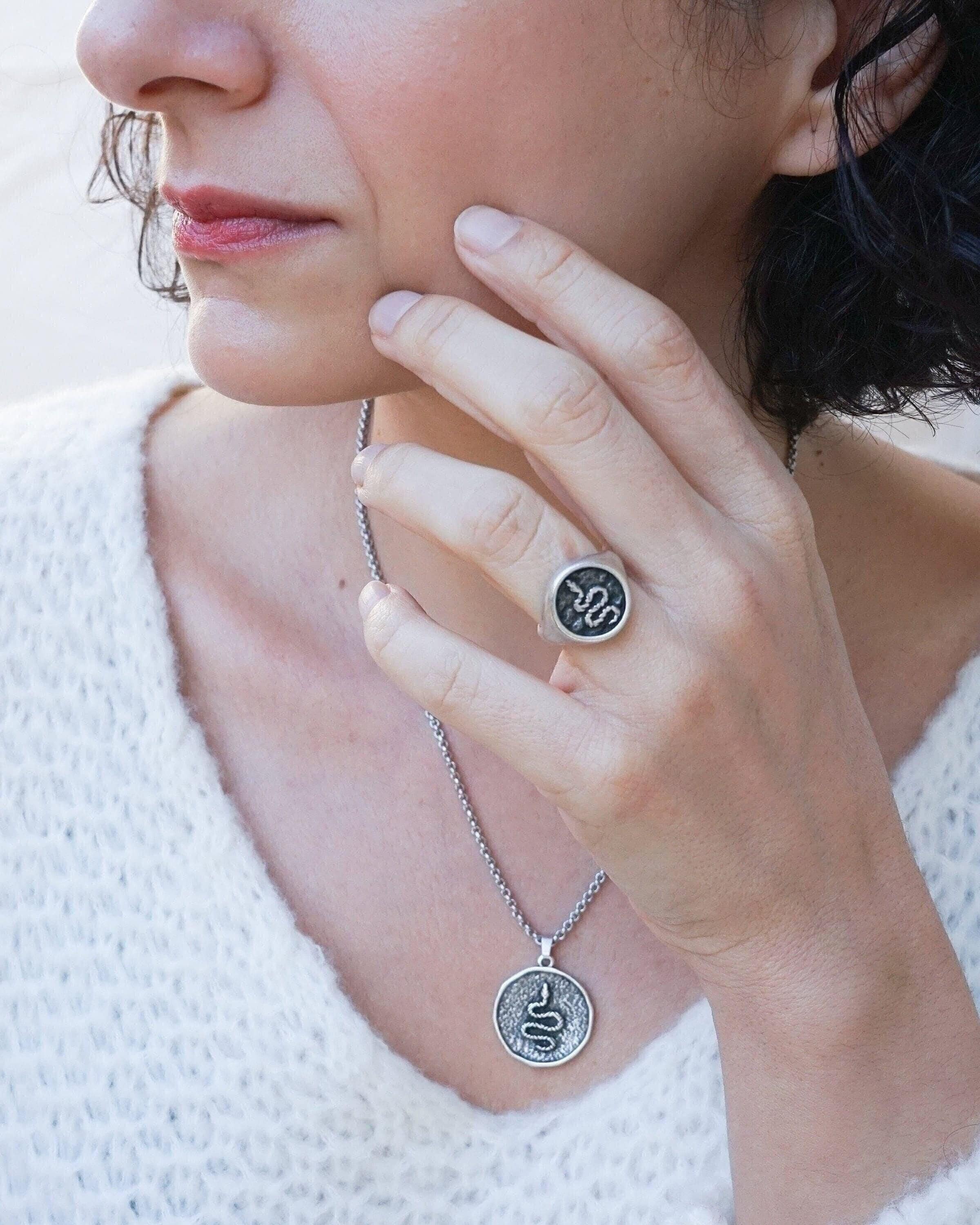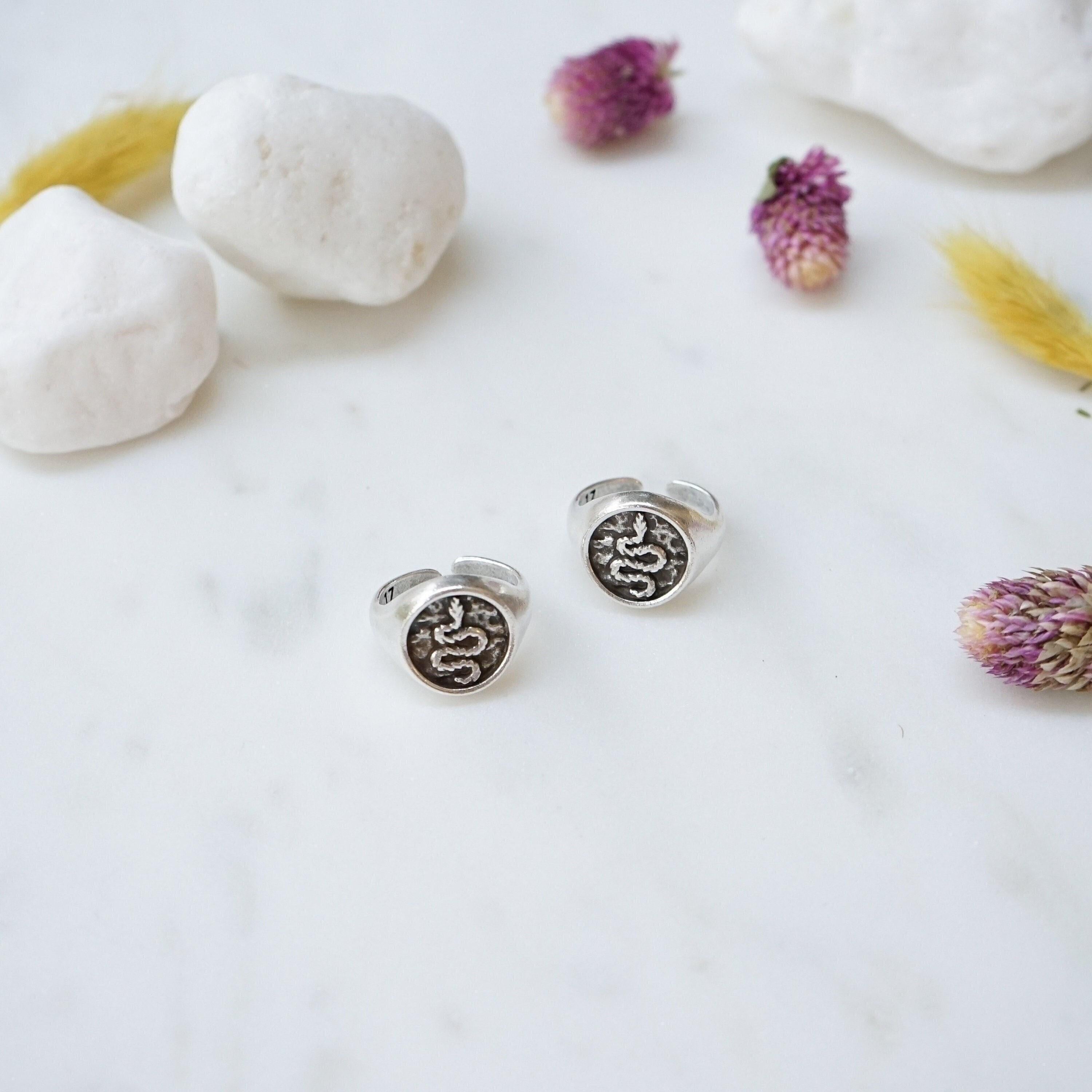 Crafted from silver-plated zamak, this snake stamp signet chevalier ring embodies a potent creative life force. Despite their often misunderstood reputation, snakes have been revered symbols of rebirth, transformation, immortality, and healing in Ancient Greece and Egypt. The Greek god Asclepius, known for his association with medicine, famously wielded a rod entwined with serpents, highlighting their significance. Not only does this ring serve as a meaningful emblem, but it also makes a striking addition to any style ensemble.