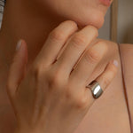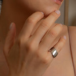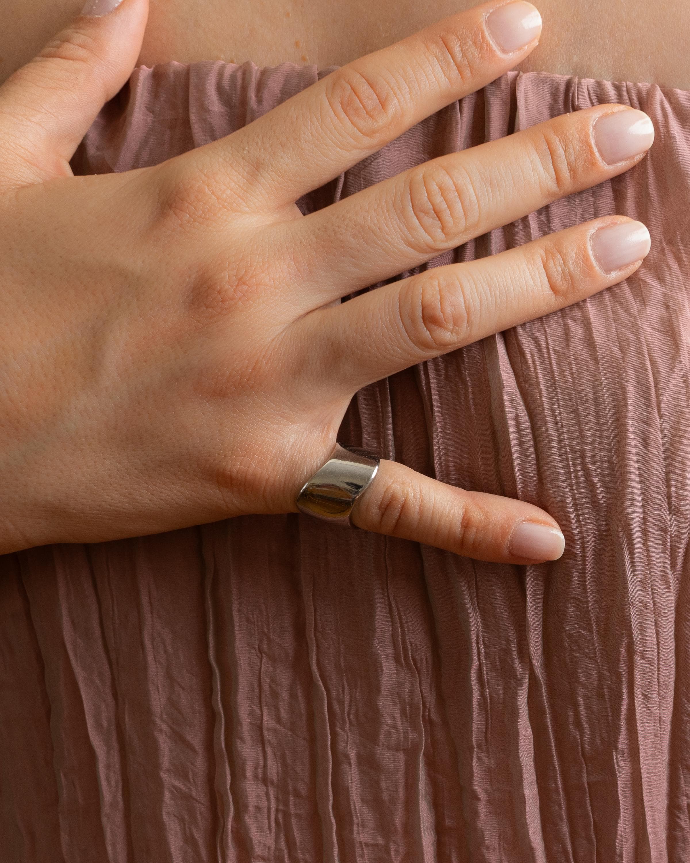 A bold chevalier ring reimagined for modern style lovers. Crafted from stainless steel with a high-polish finish, this wide silver band brings timeless elegance with a clean, sculptural form that elevates any look.