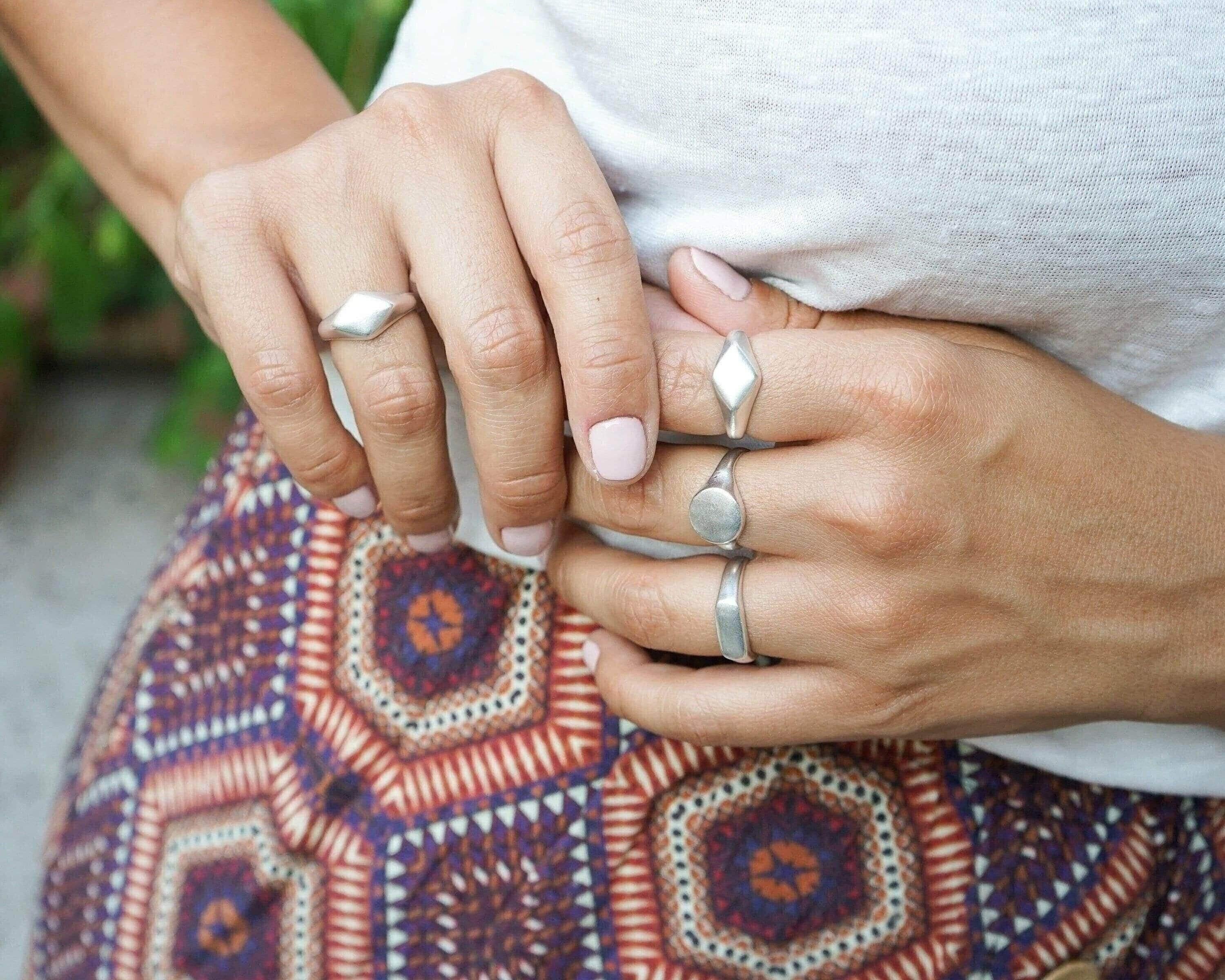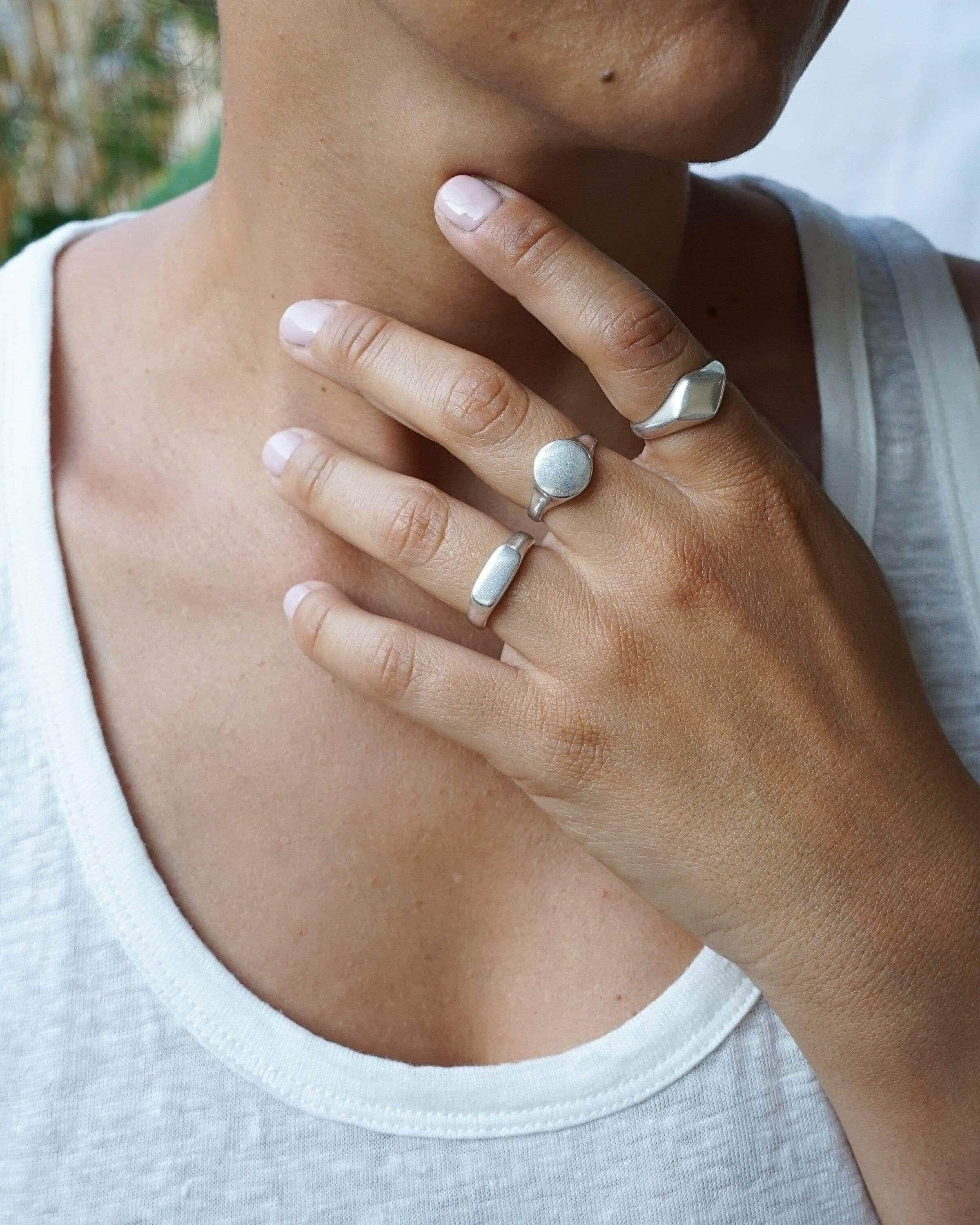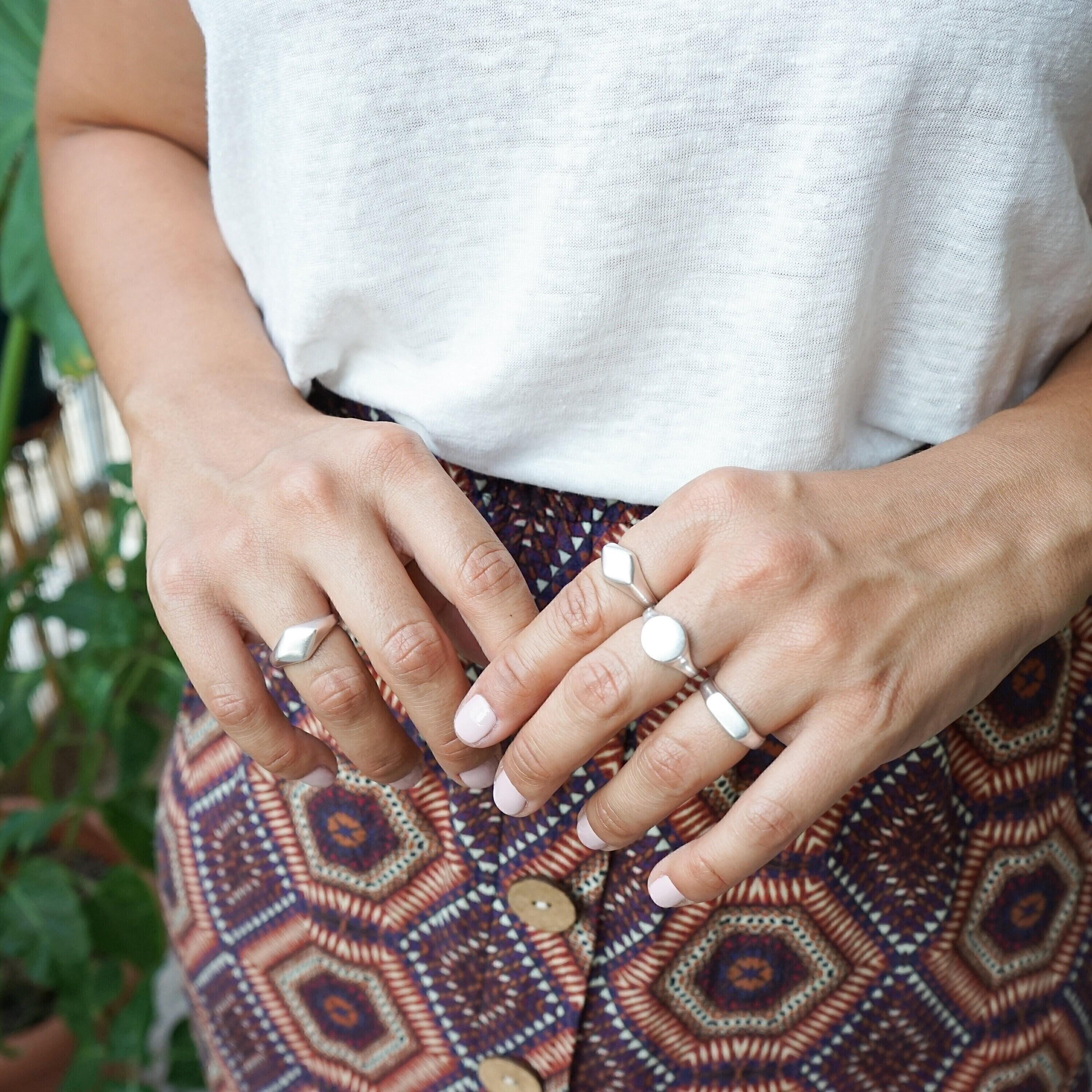 For a refined and sophisticated style, consider stacking this ring with our Round Signet Ring or Rectangle Signet Ring. Its versatile design allows it to be worn on various fingers, including the index, middle, thumb, or ring finger, making it an adaptable addition to your collection. The ring pairs beautifully with your existing pieces, adding an element of cohesion to your overall look.