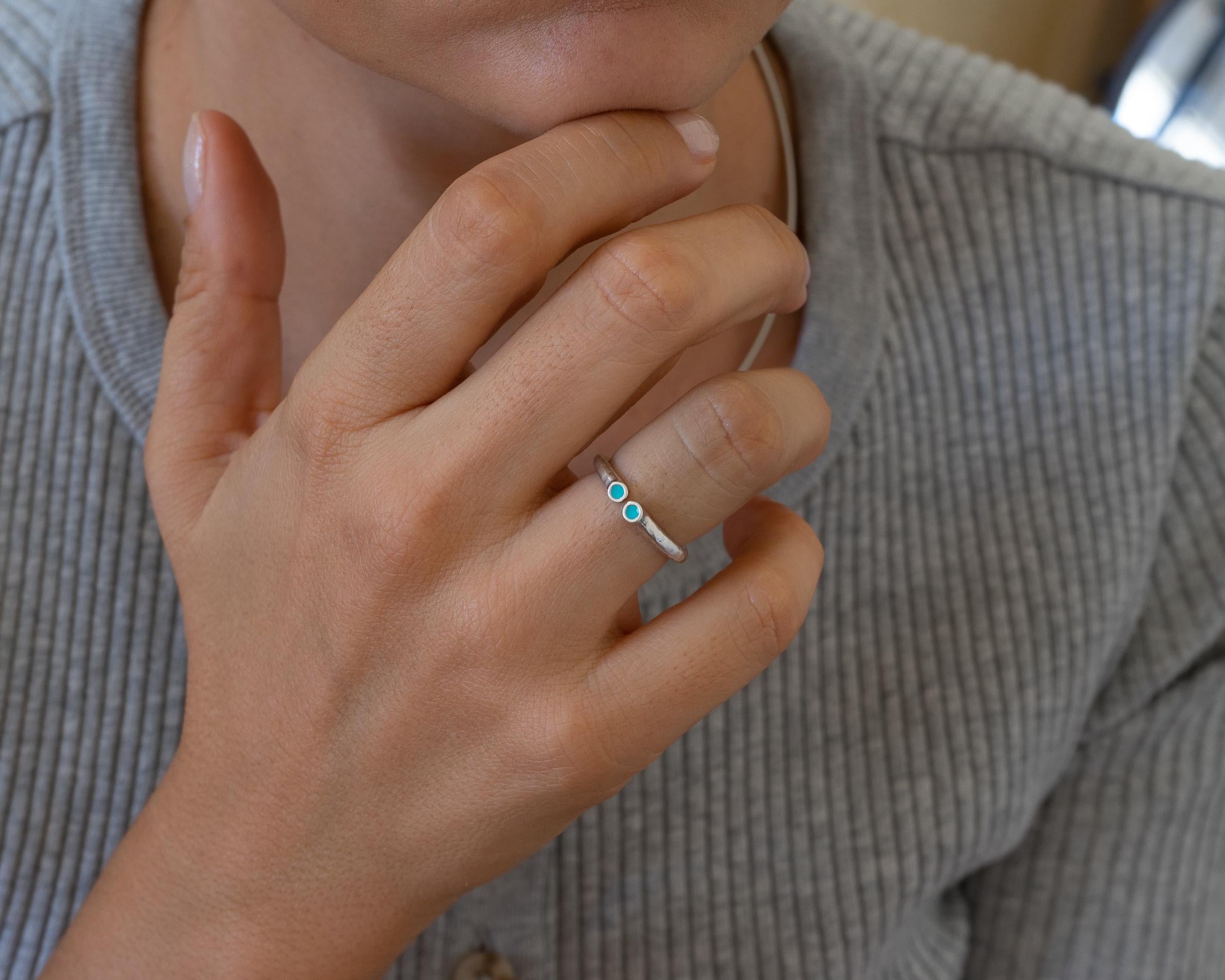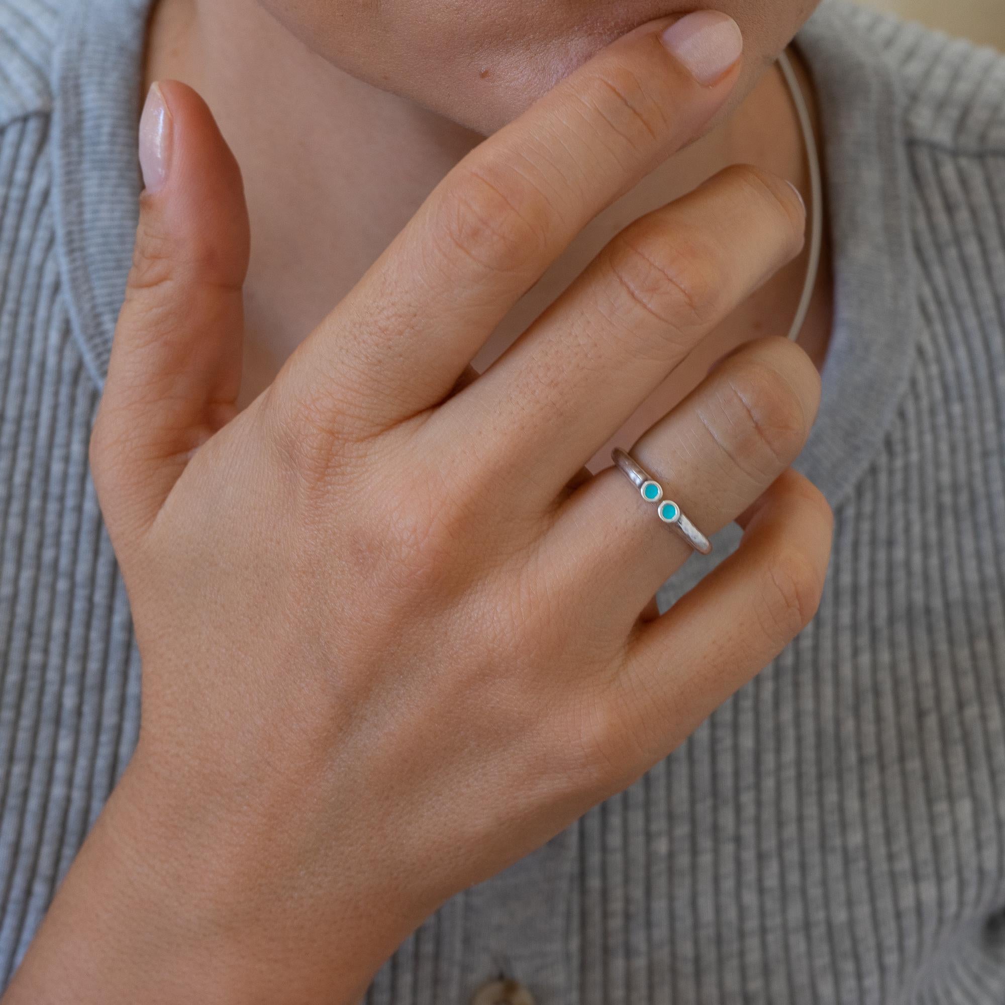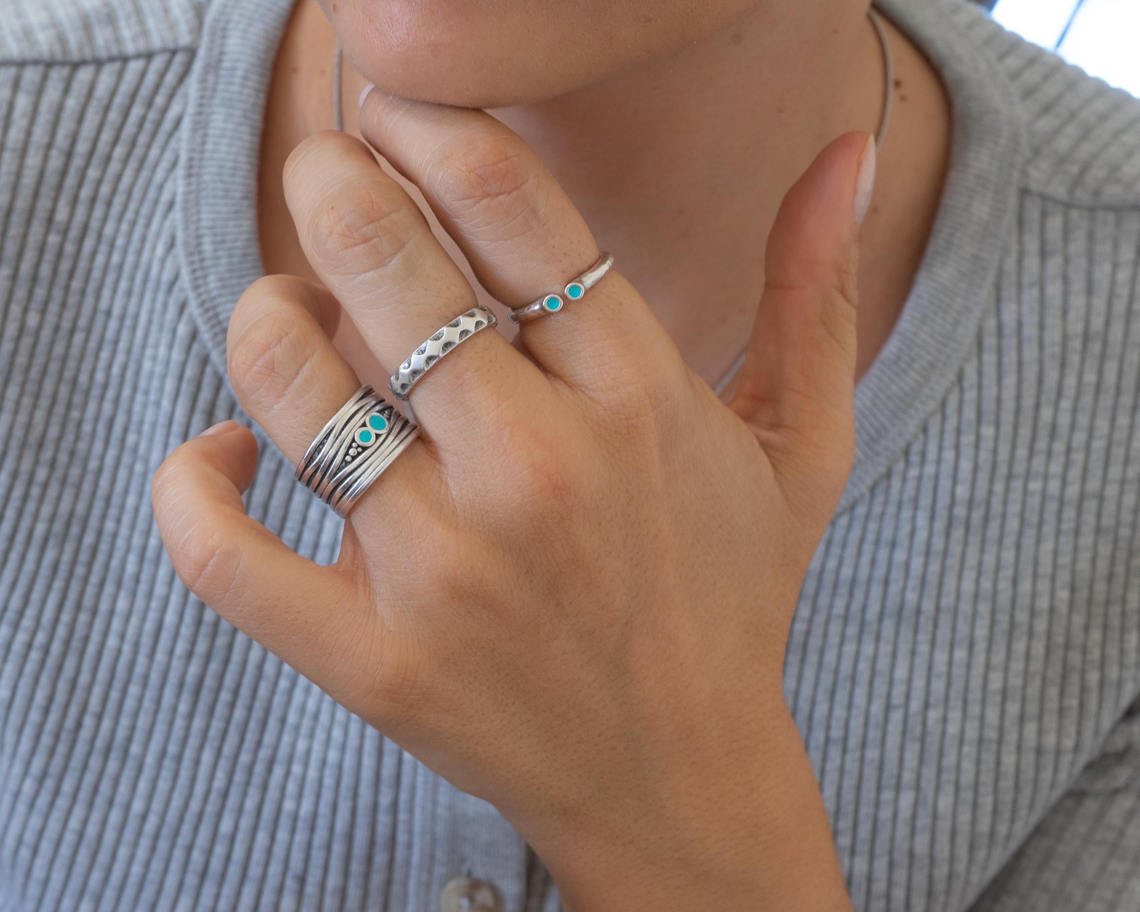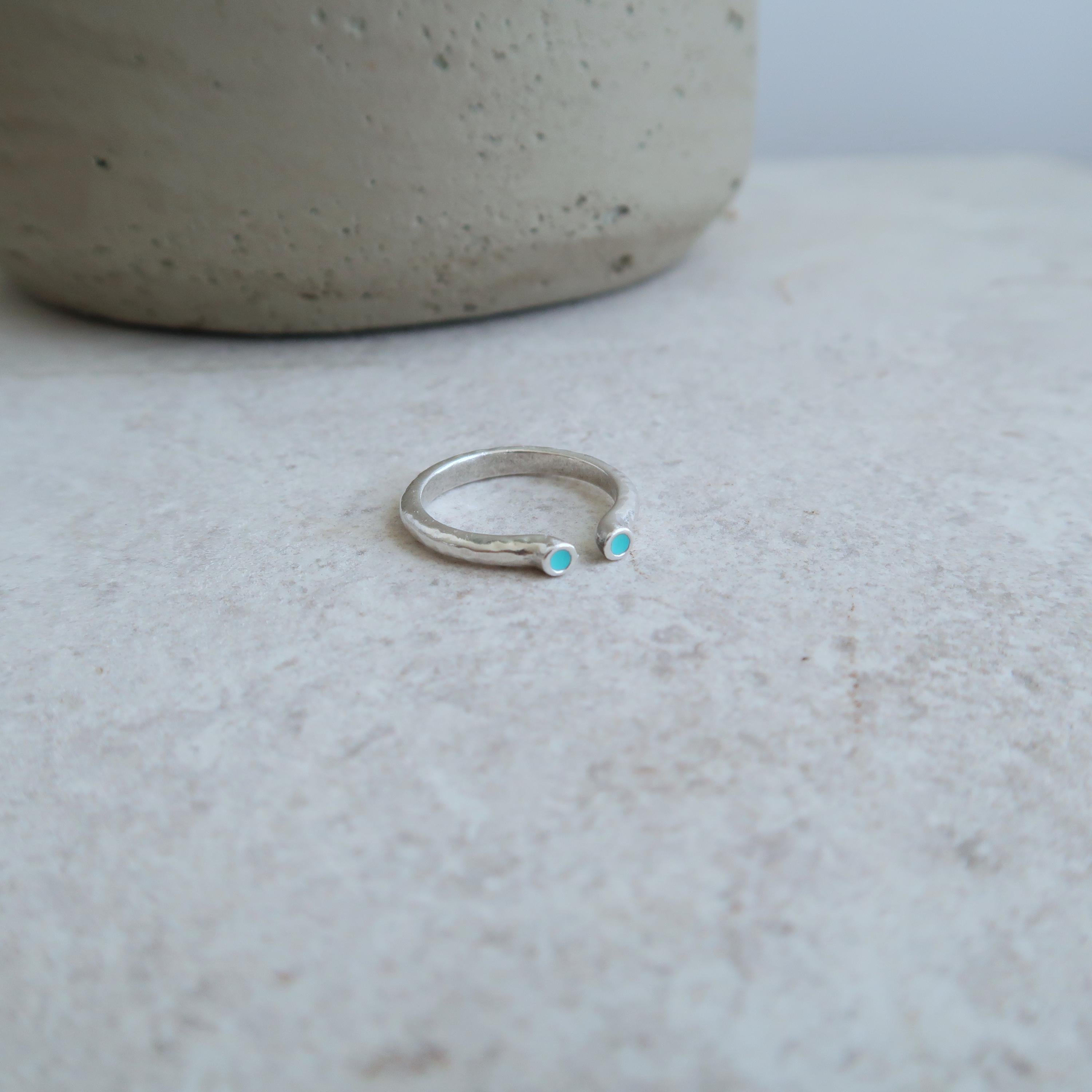 Meet your new favorite accessory! This charming silver ring features two delightful enamel dots: choose between sleek black or vibrant turquoise, that beautifully complement its hammered band. It's simple yet oh-so-chic, making it the perfect addition to your jewelry collection. Whether you're dressing up for a night out or keeping it casual, this unique ring will effortlessly enhance your look.