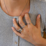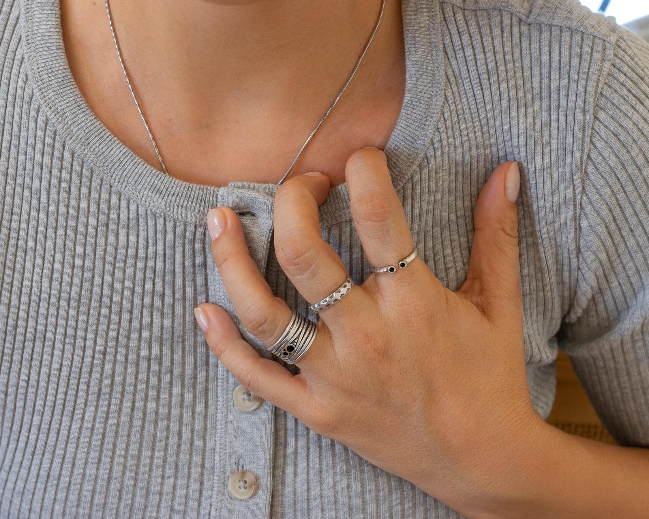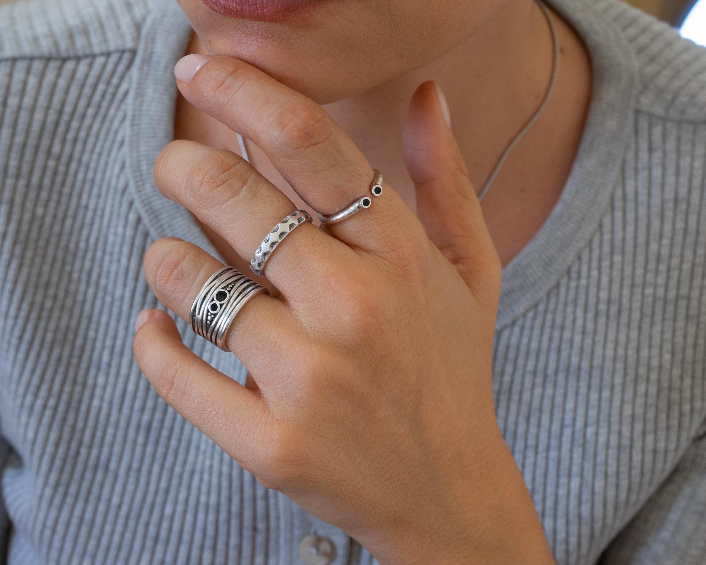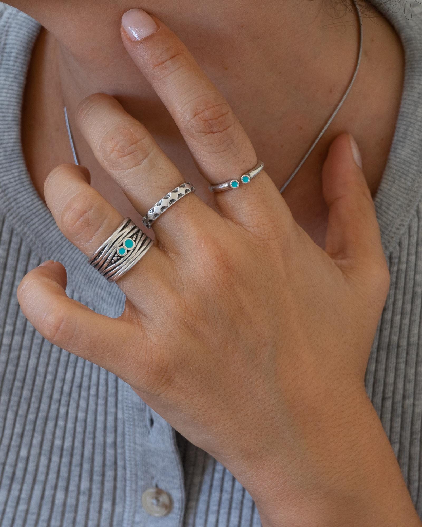 Meet your new favorite accessory! This charming silver ring features two delightful enamel dots: choose between sleek black or vibrant turquoise, that beautifully complement its hammered band. It's simple yet oh-so-chic, making it the perfect addition to your jewelry collection. Whether you're dressing up for a night out or keeping it casual, this unique ring will effortlessly enhance your look.