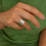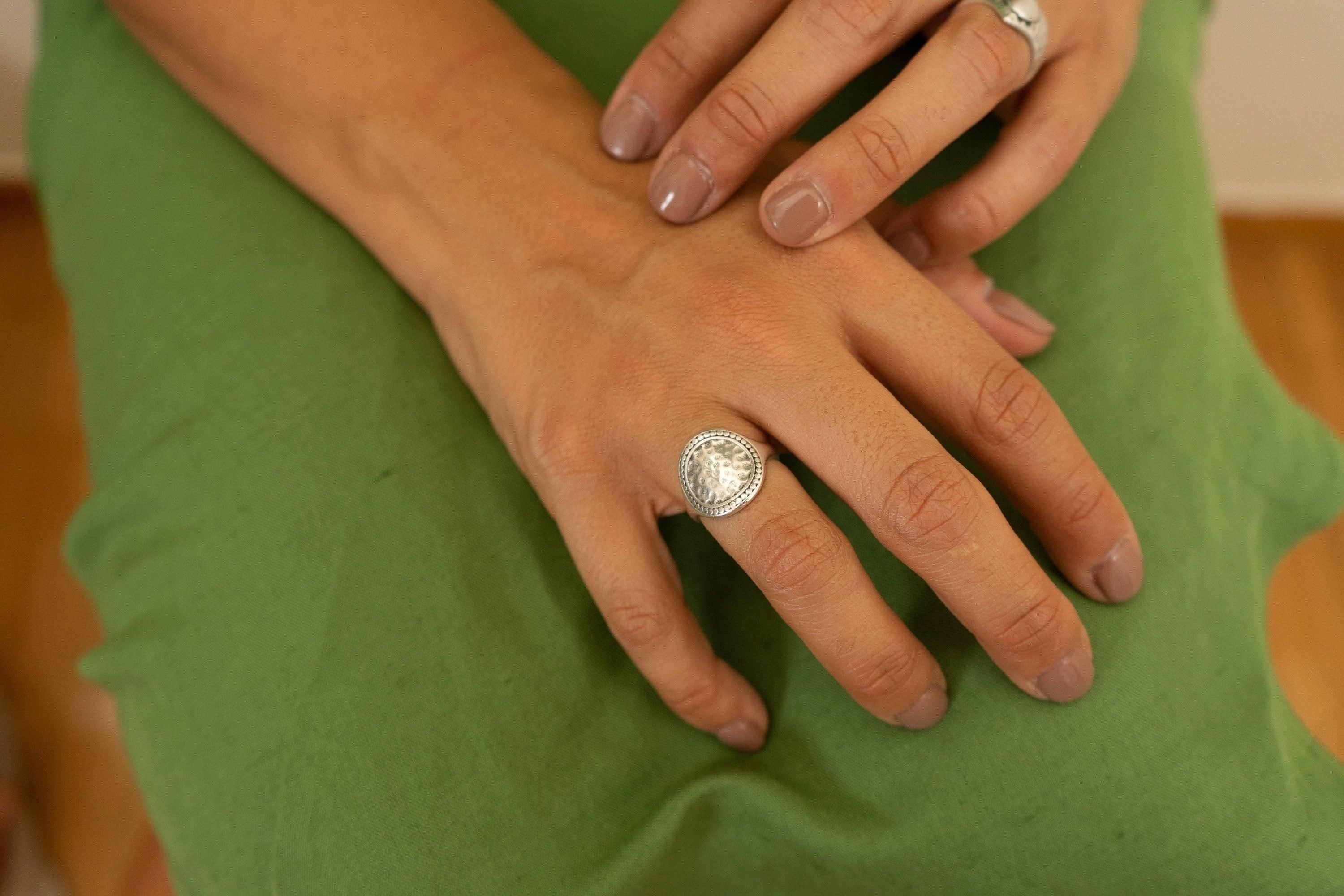 Discover the elegance of our silver-plated hammered round ring, designed to be worn comfortably on your index, middle, or ring finger. With its unique texture and modern design, this ring is sure to become a cherished addition to your jewelry collection, effortlessly enhancing your style with its distinctive presence.