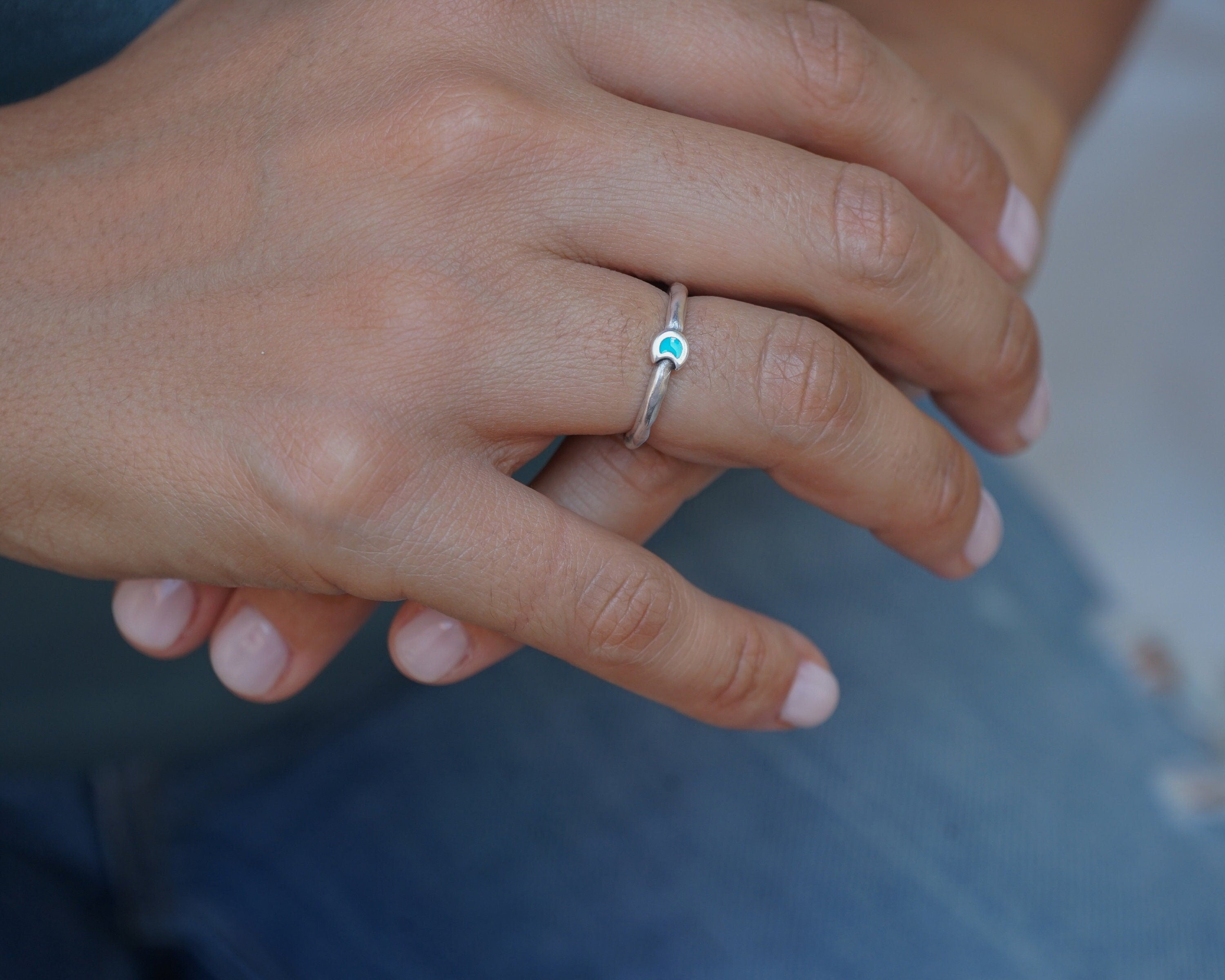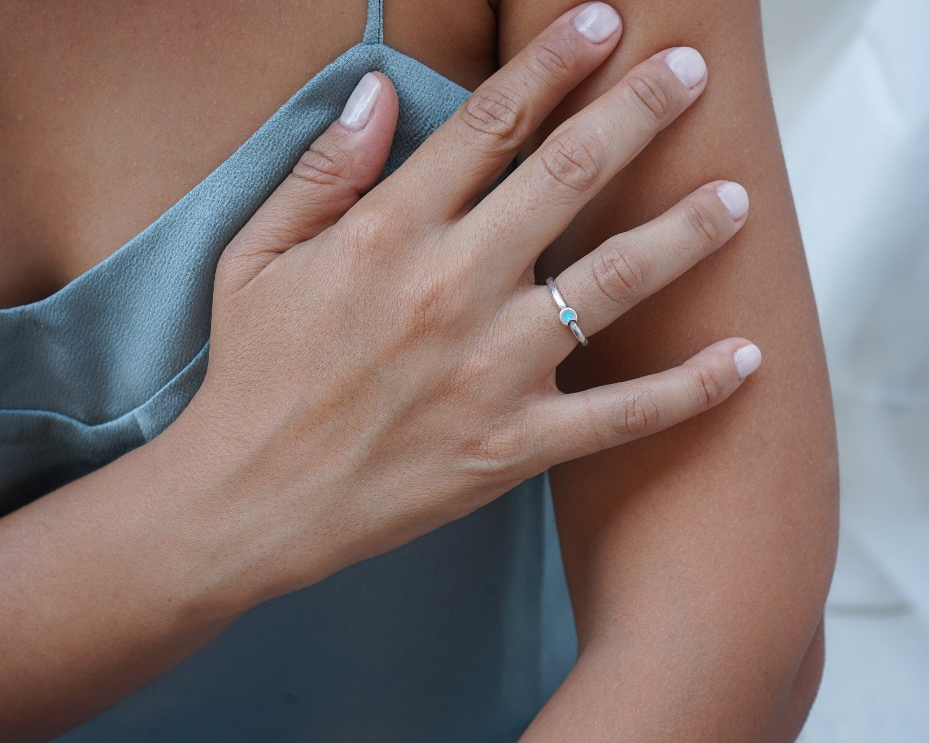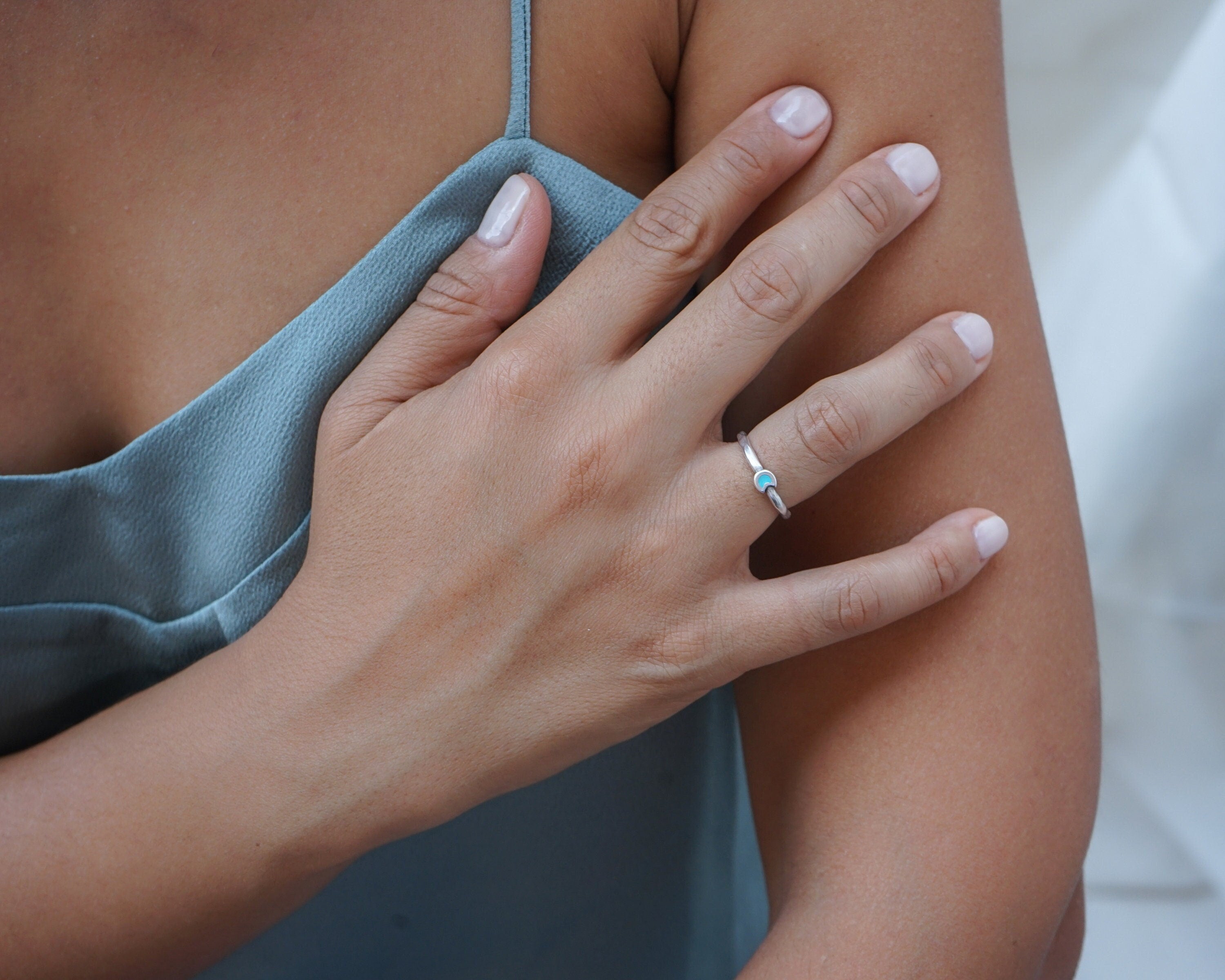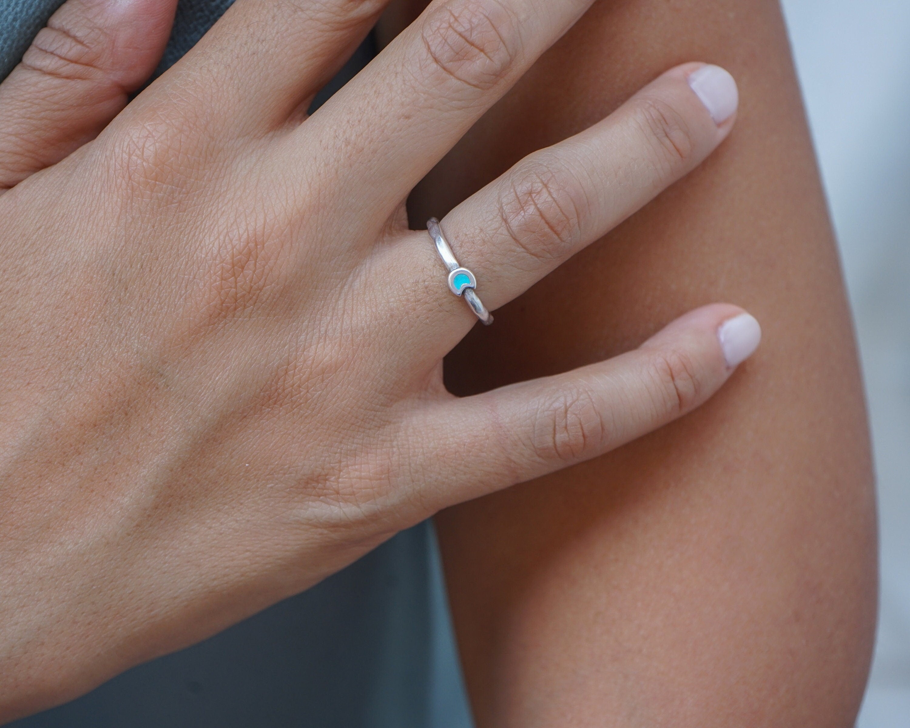 An amazing, simple but chic solitaire ring with a turquoise MOON enamel setting and a hammered band. Add this unique ring to your collection today and complement your outfits. It can be worn as a pinky or as a midi ring.