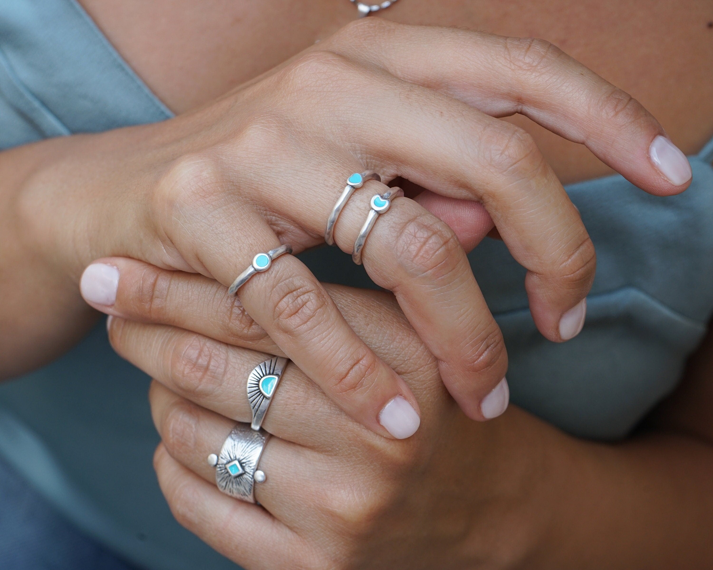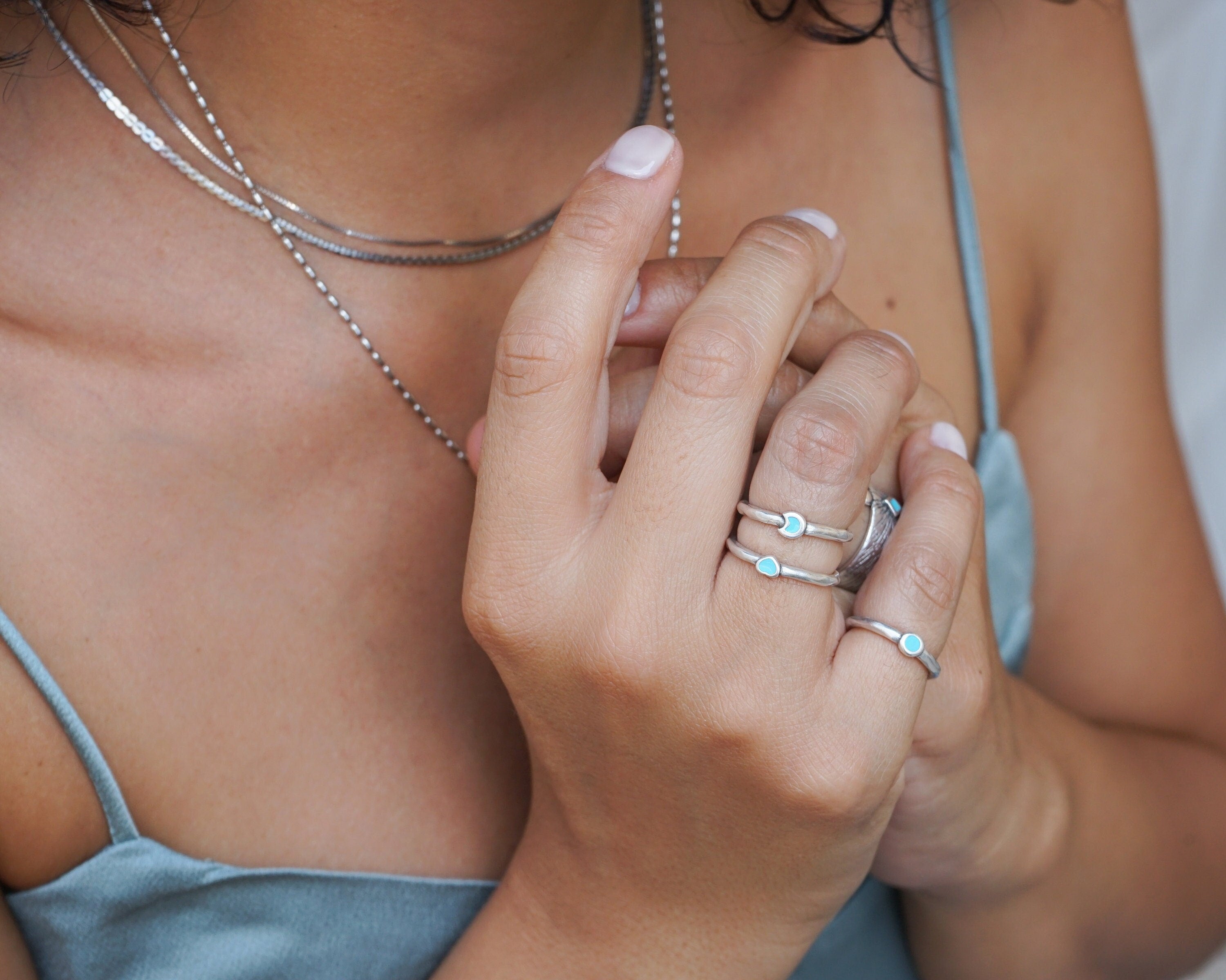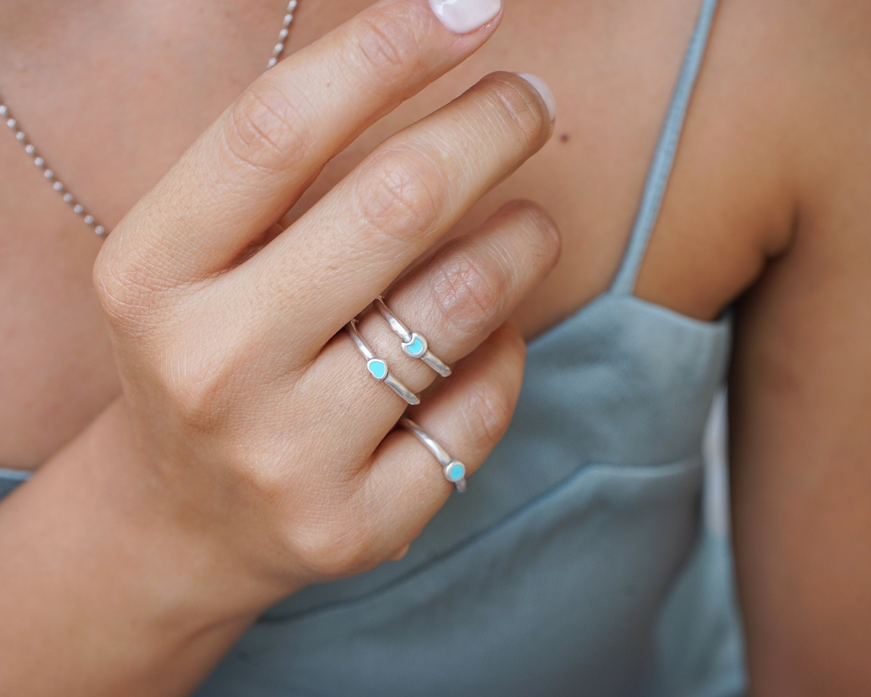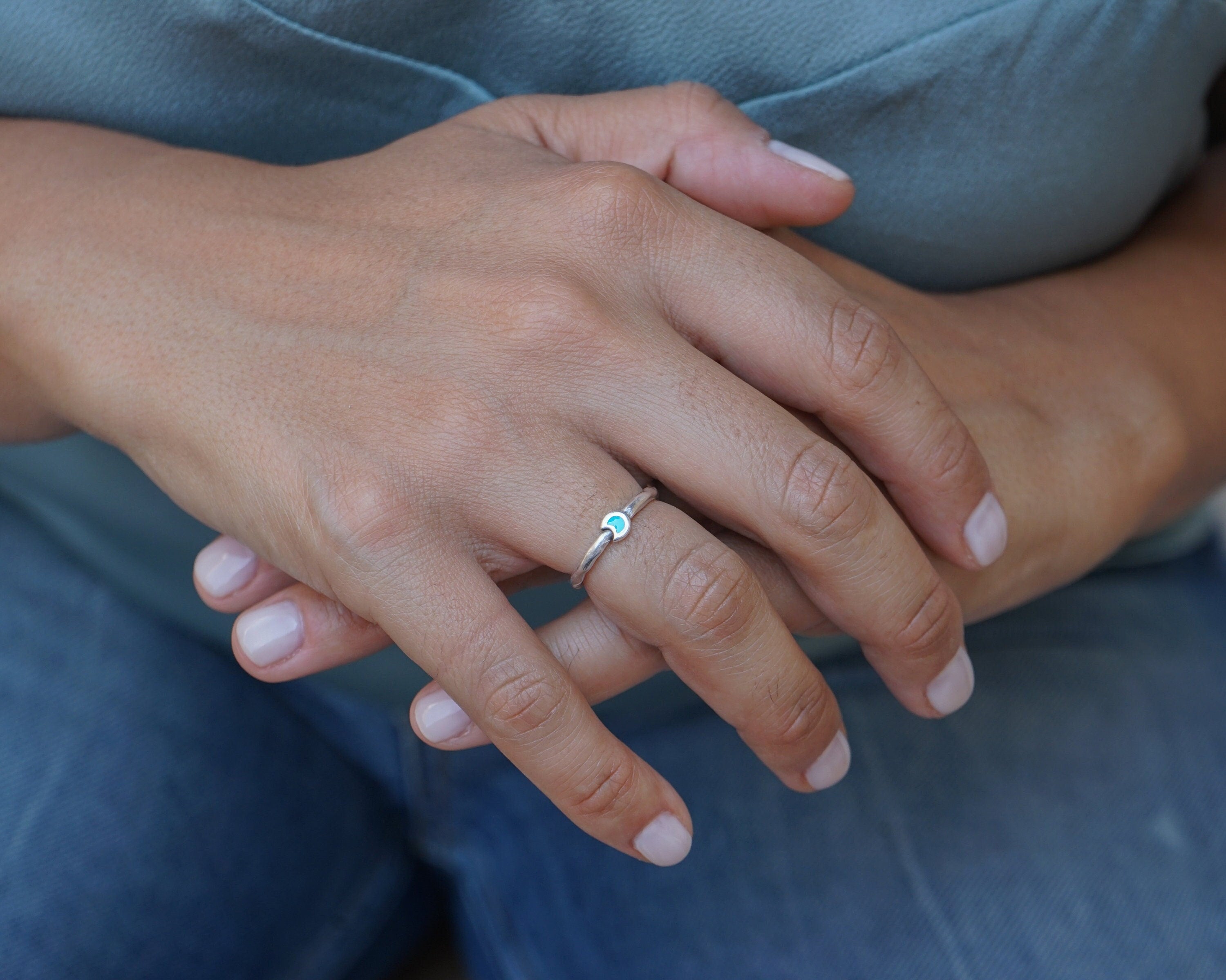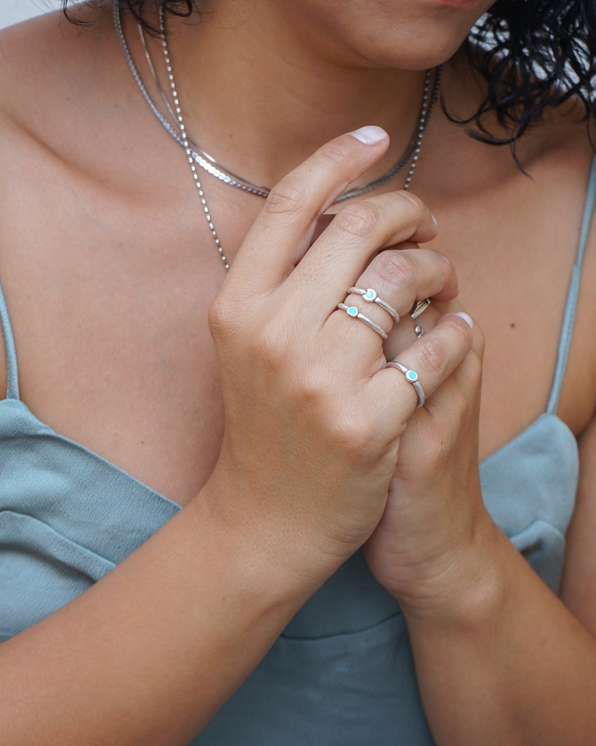 An amazing, simple but chic solitaire ring with a turquoise MOON enamel setting and a hammered band. Add this unique ring to your collection today and complement your outfits. It can be worn as a pinky or as a midi ring.
