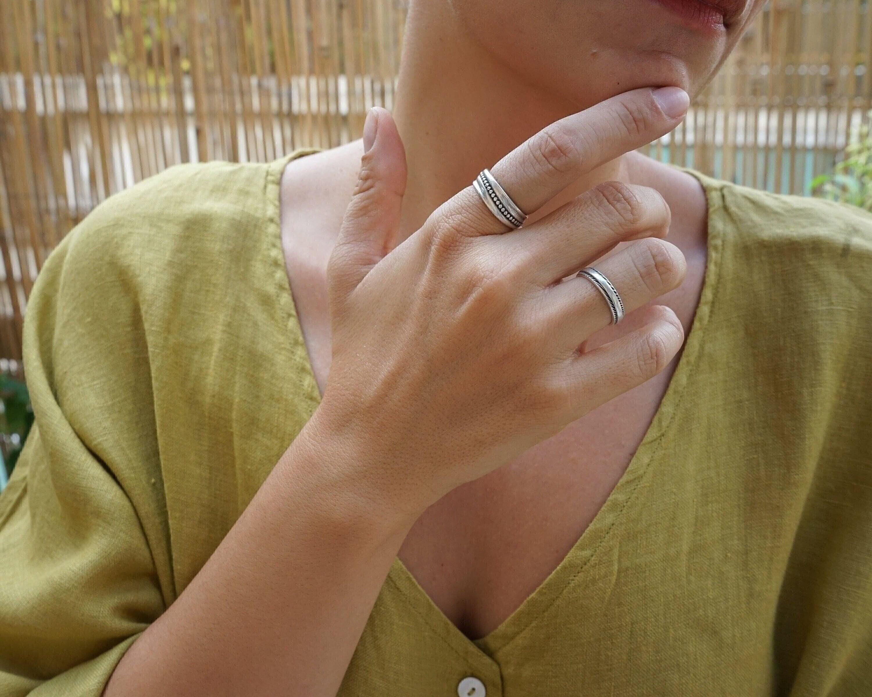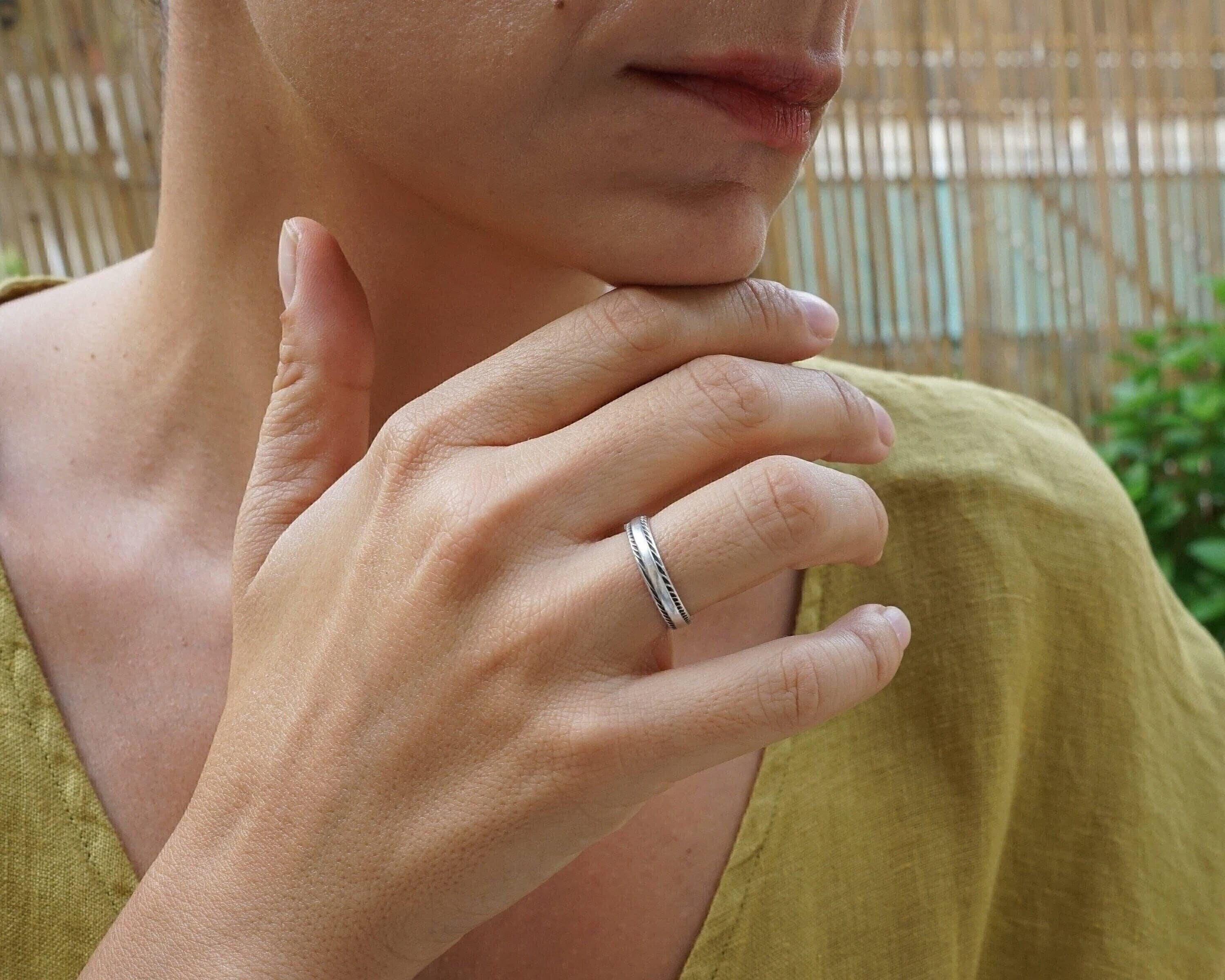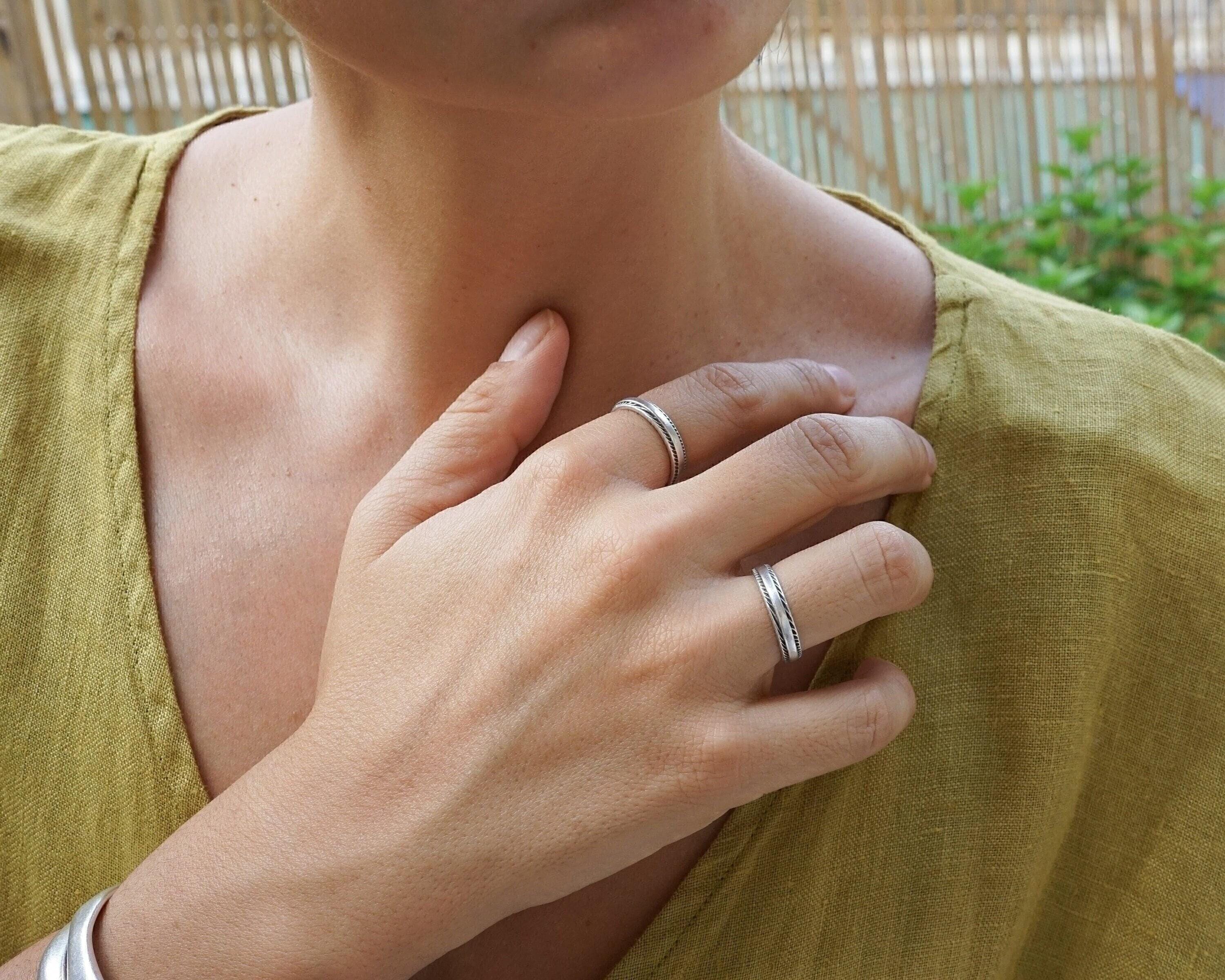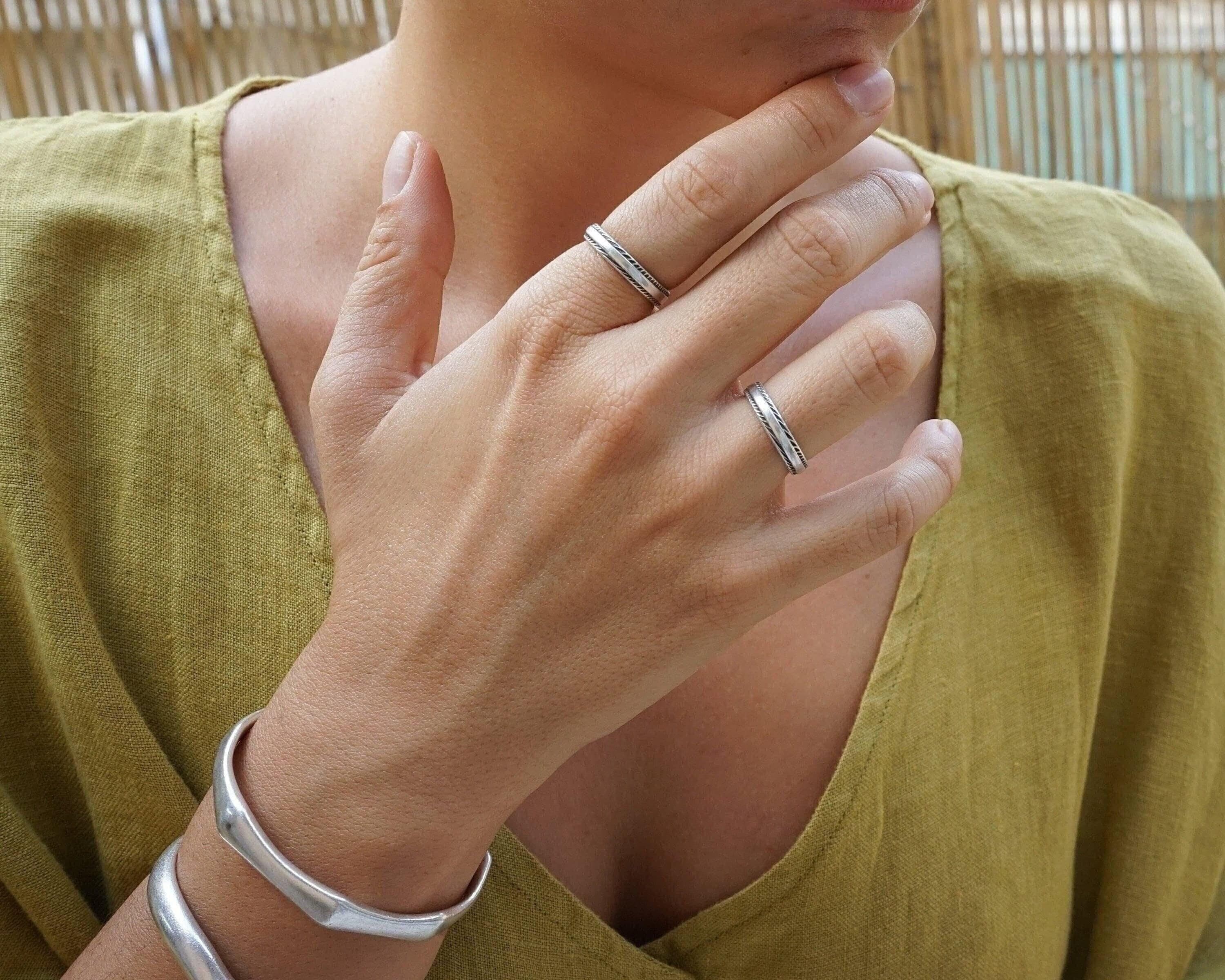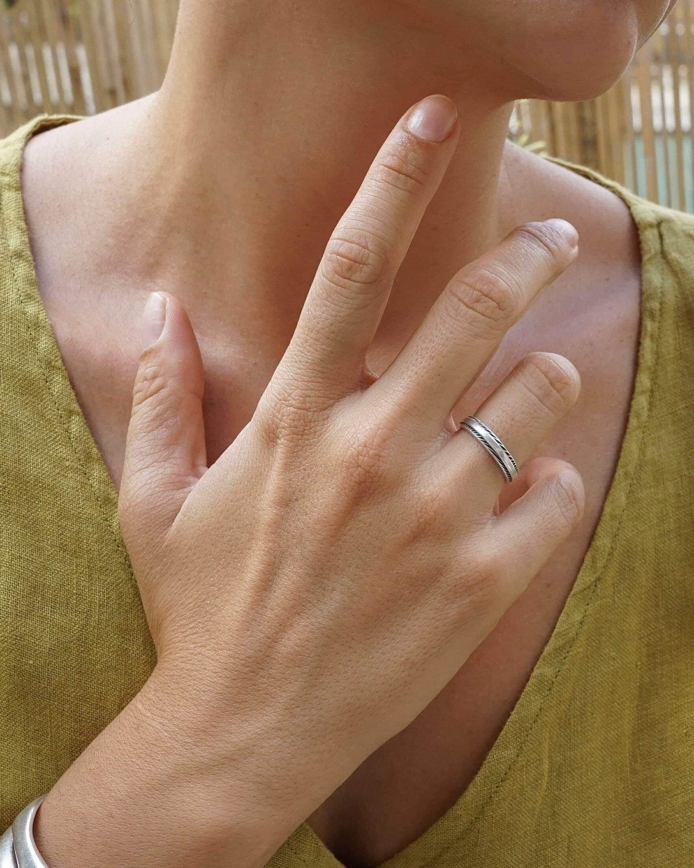 his antique silver-plated ethnic band ring showcases a beautifully detailed braided lines pattern, making it a versatile addition to your jewelry collection. Designed to be worn on the index, middle, or ring finger, this piece seamlessly complements both casual outfits, like a simple shirt and jeans, and dressier ensembles. Wear it alone for a refined look, or combine it with other rings to create a unique stack.</p><br><p>Crafted from durable silver-plated zamak, this ring is not only stylish but also well-made to withstand daily wear.