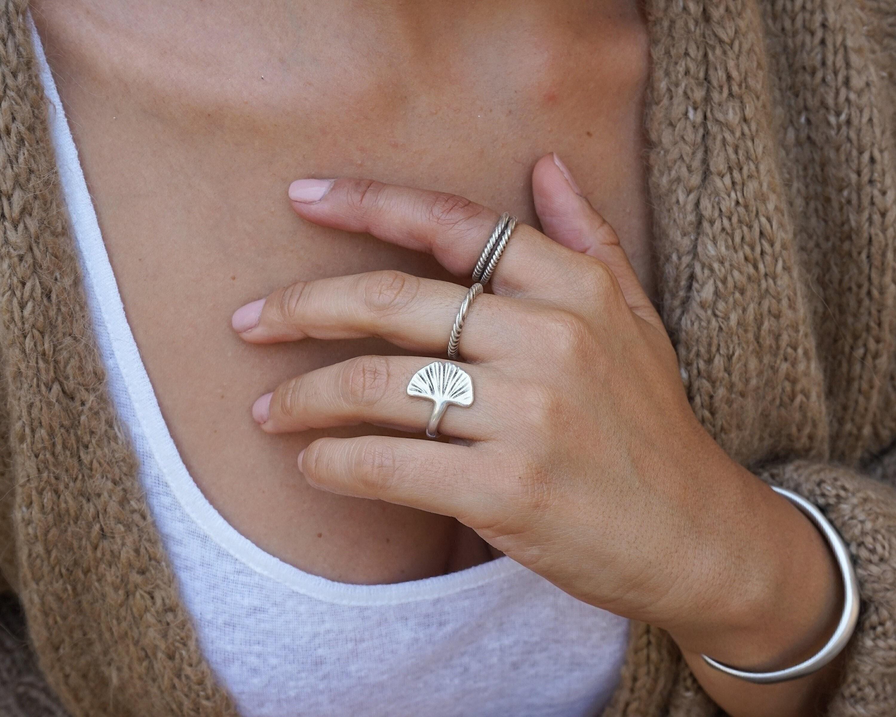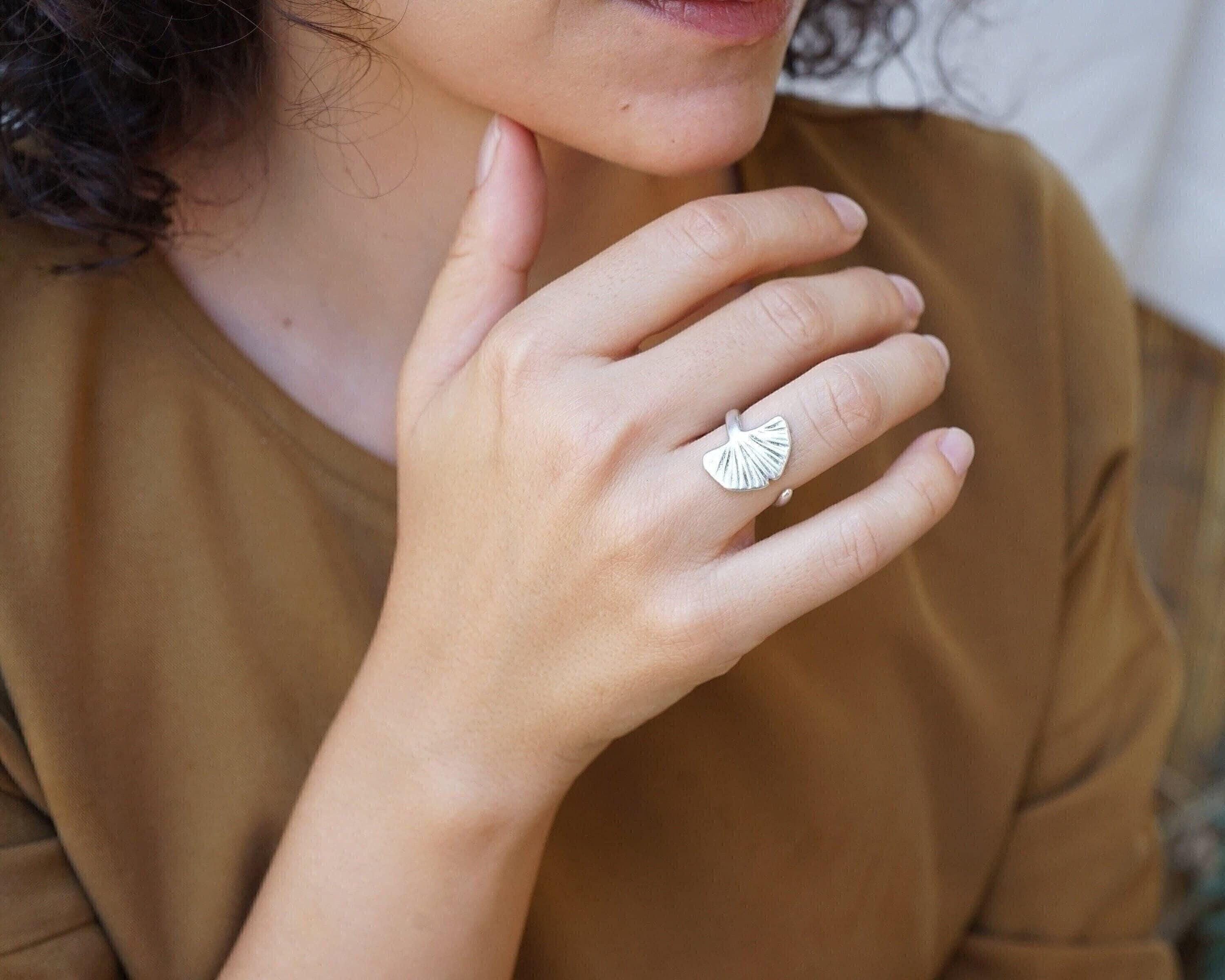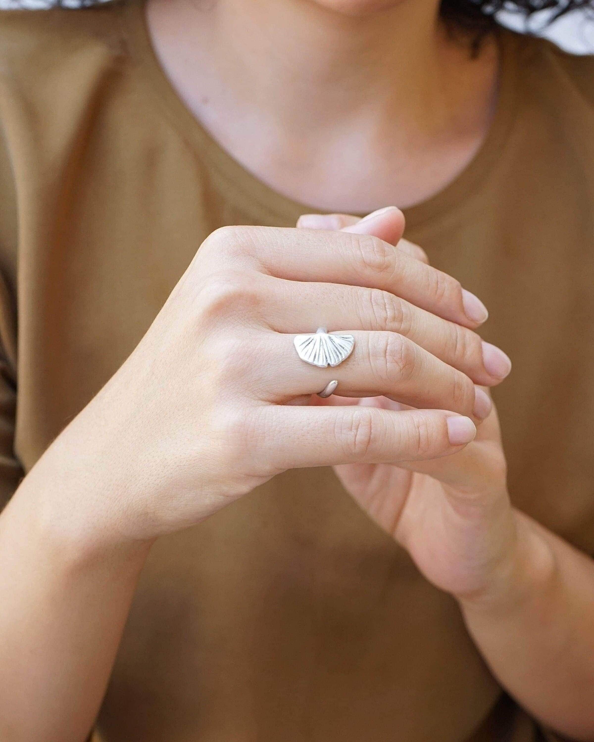 This bohemian-inspired ring features a beautifully detailed, hammered silver design of a Ginkgo Biloba leaf. Its versatile style allows it to be worn on the index, middle, or ring finger, making it a perfect accessory for any occasion.
