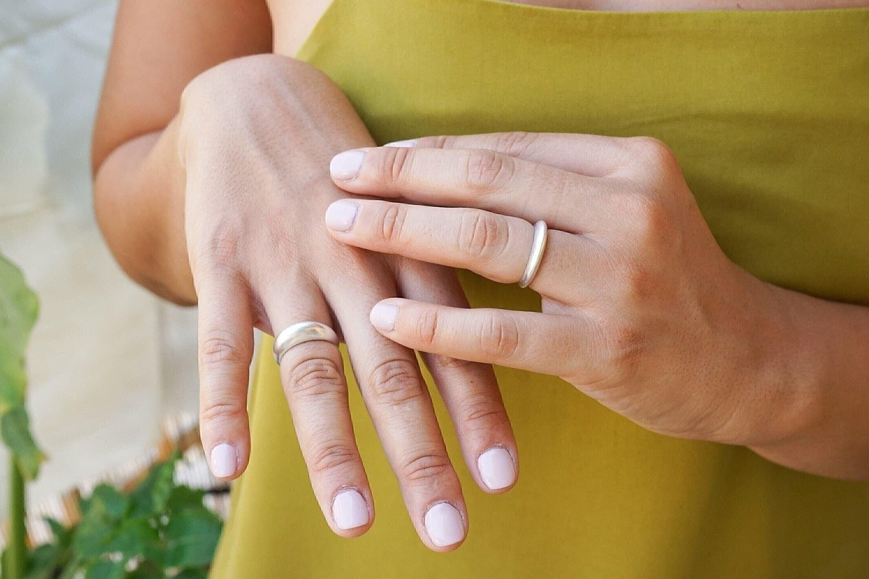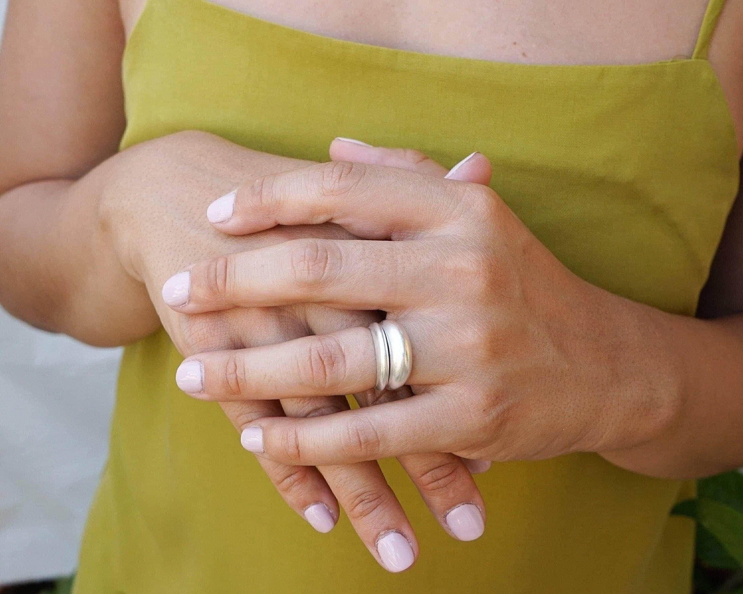 Discover a charming antique silver-plated soft dome ring that beautifully complements both solo wear and ring stacking for those who appreciate layered looks. This design comes in two distinctive styles: Wide Bold and Narrow, allowing you to choose the perfect fit for your personal aesthetic.