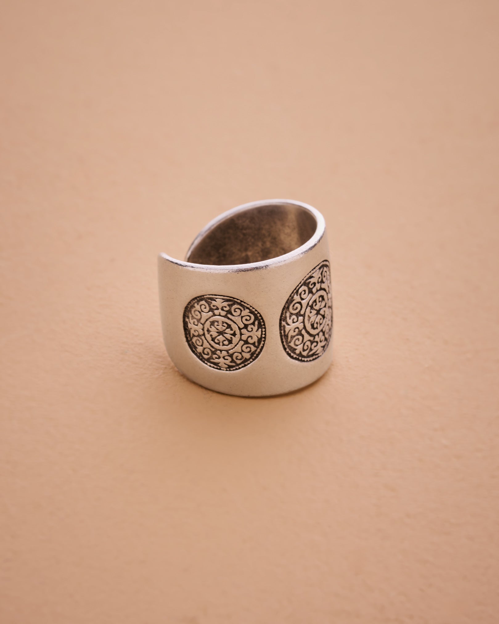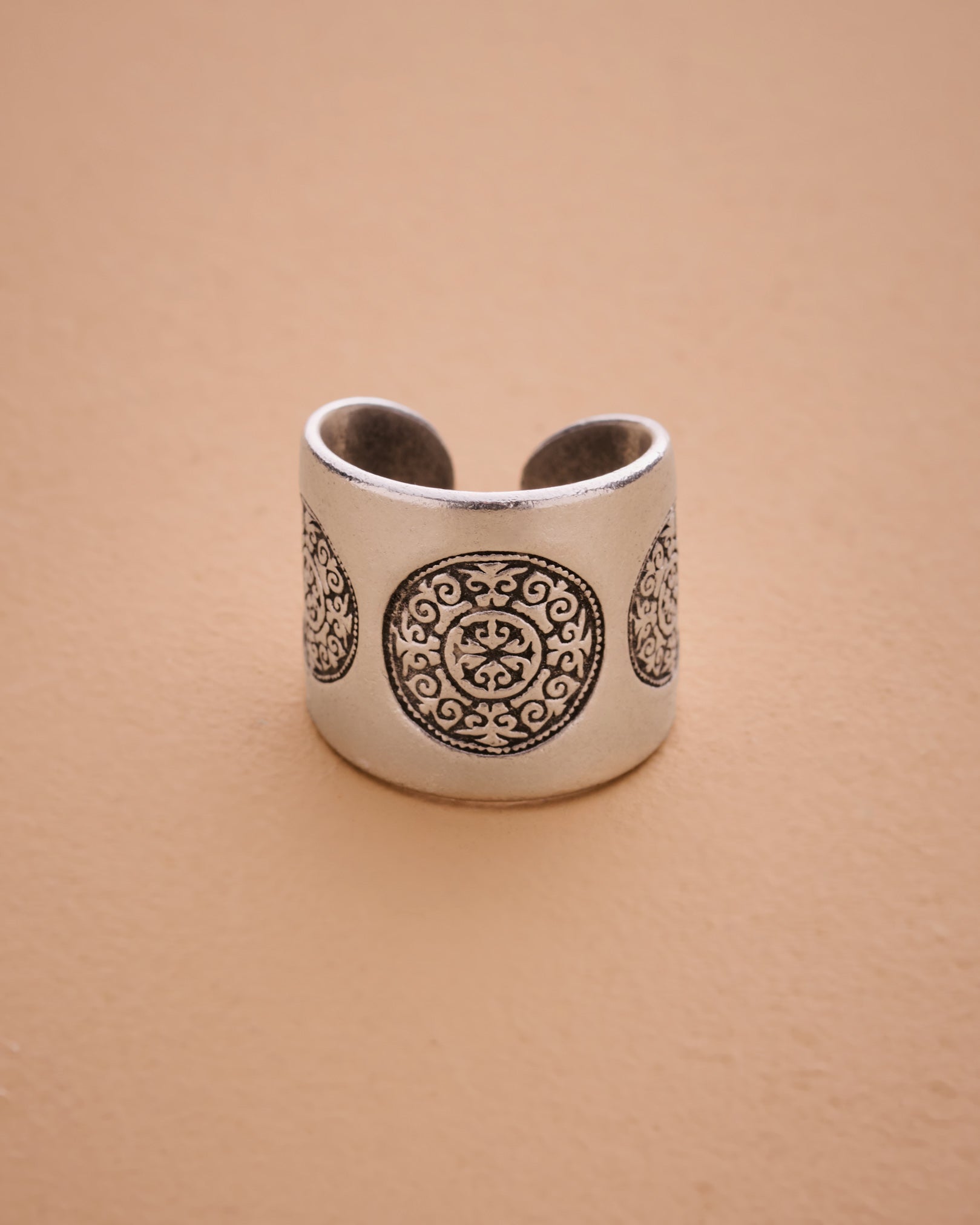 This exquisite large band ring features intricately engraved mandala circles, offering a refined and ethnic aesthetic that evokes a sense of spirituality. The design is both simple and profound, making it a stylish statement piece that complements various outfits.