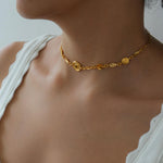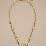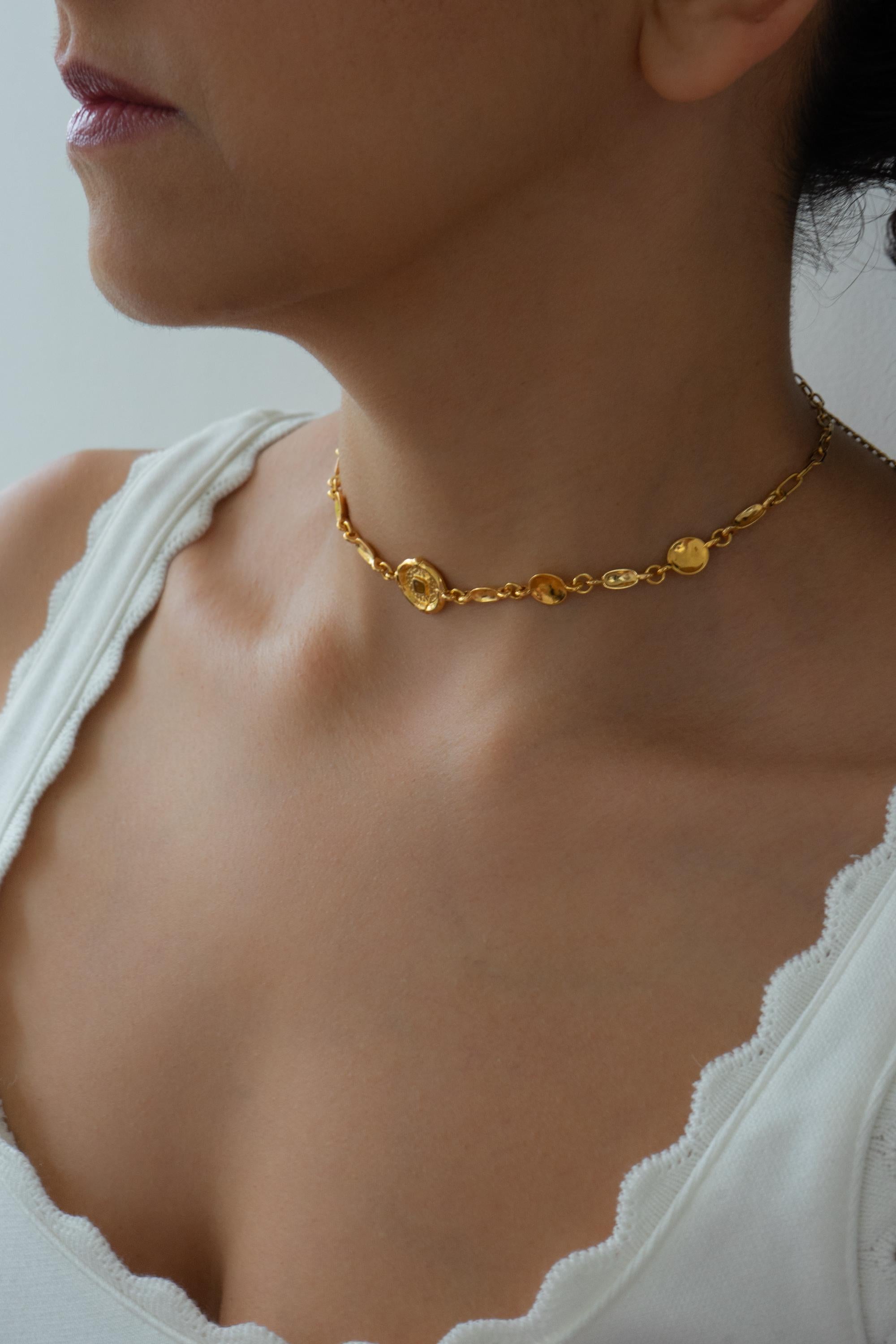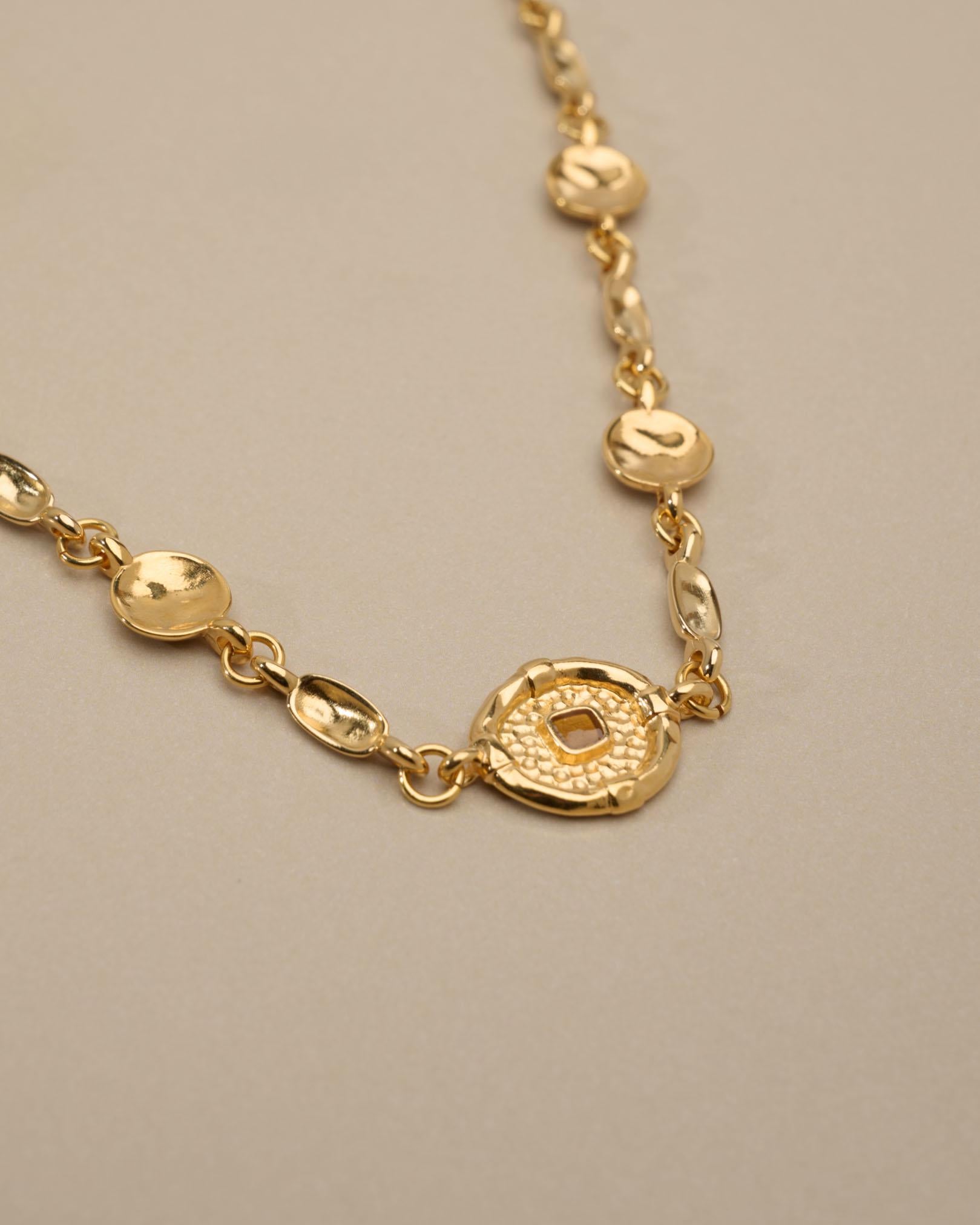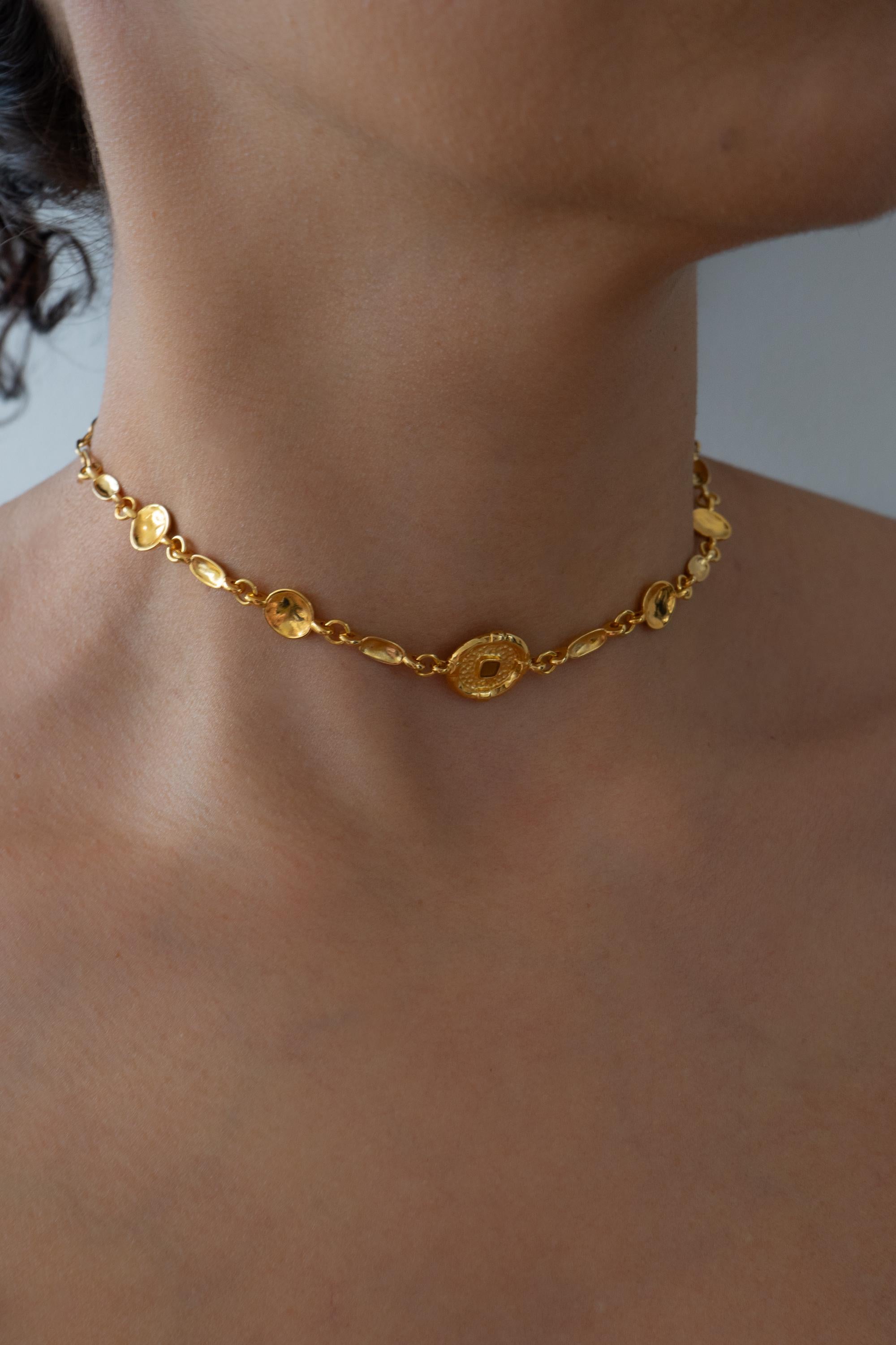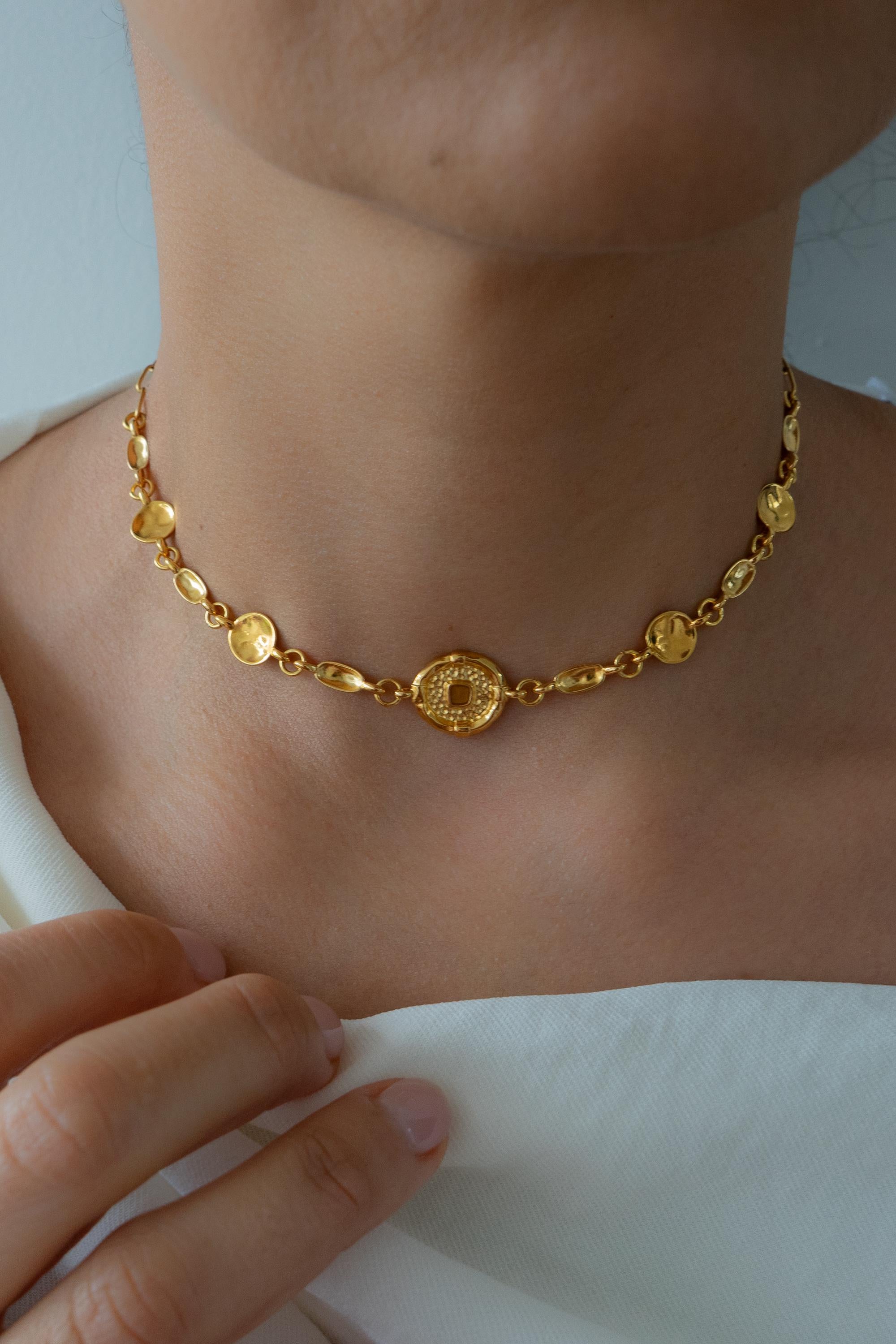 Ο συνδυασμός των ανάγλυφων δίσκων με τα λείοτερα στοιχεία δίνει στο κόσμημα μια γλυπτική και ισορροπημένη αισθητική. Το κολιέ εφαρμόζει κοντά στον λαιμό και ταιριάζει ιδανικά με ανοιχτά ντεκολτέ ή σε layered συνδυασμούς.