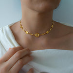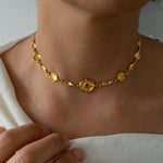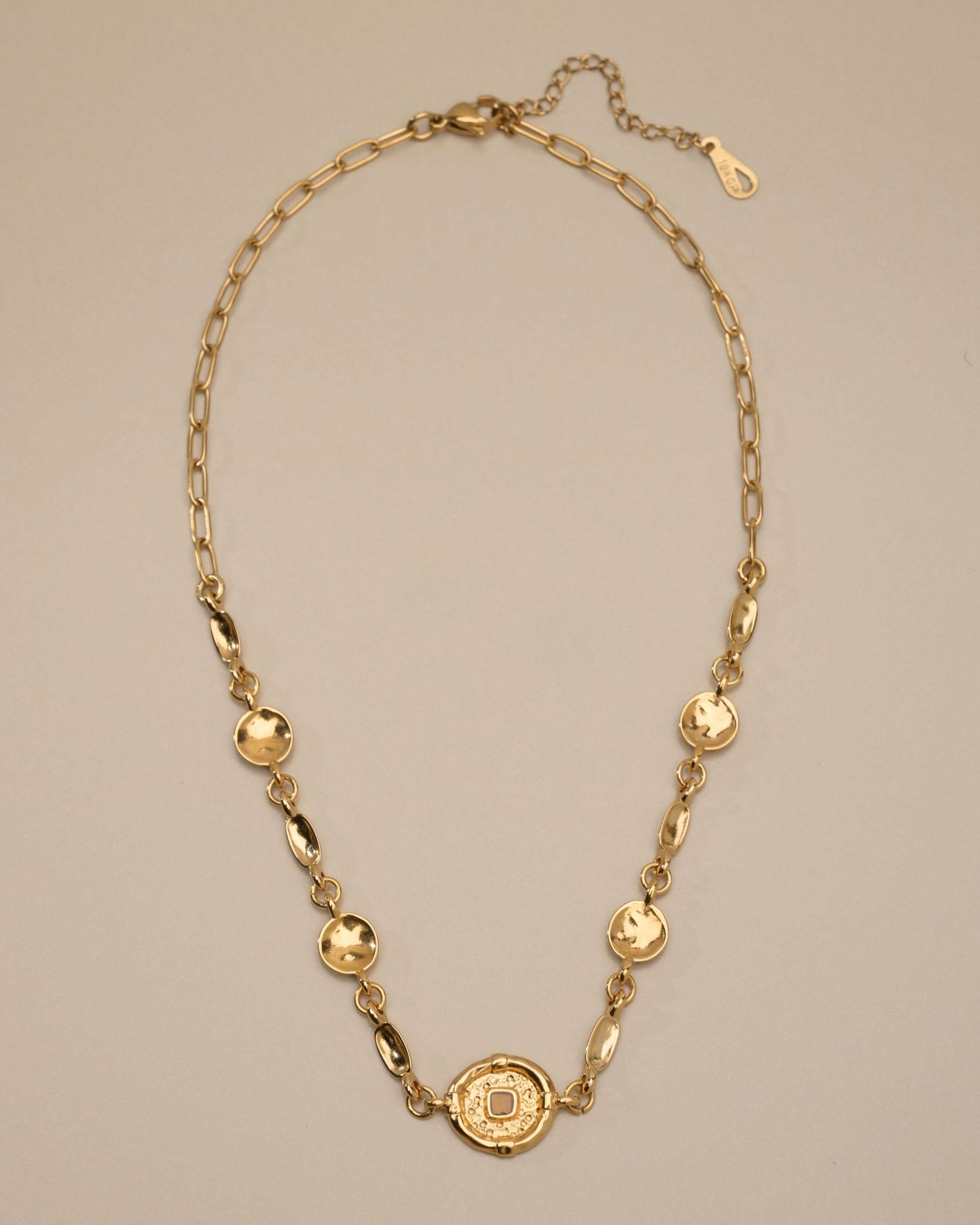 Αυτό το χρυσό κοντό κολιέ διαθέτει αλυσίδα διακοσμημένη με μικρούς στρογγυλούς δίσκους και ένα κεντρικό στοιχείο με σμάλτο που δημιουργεί ένα ιδιαίτερο σημείο εστίασης.