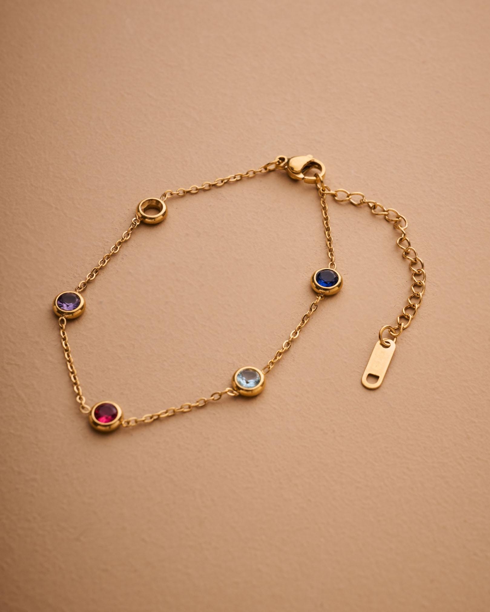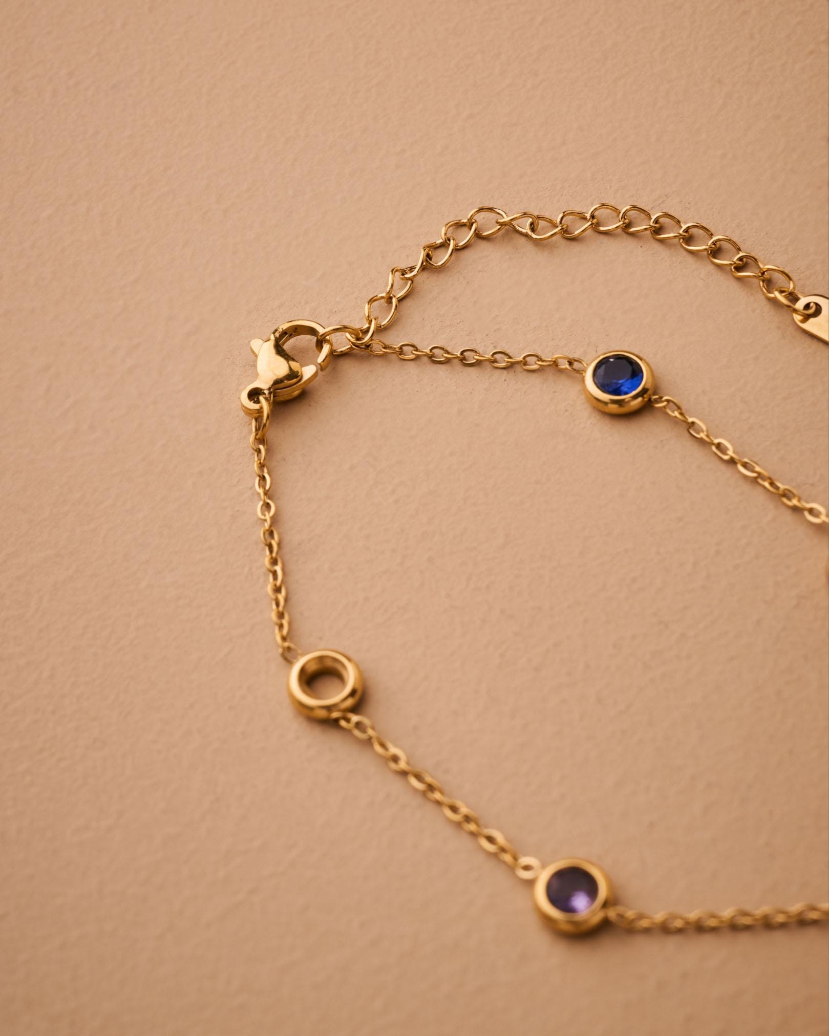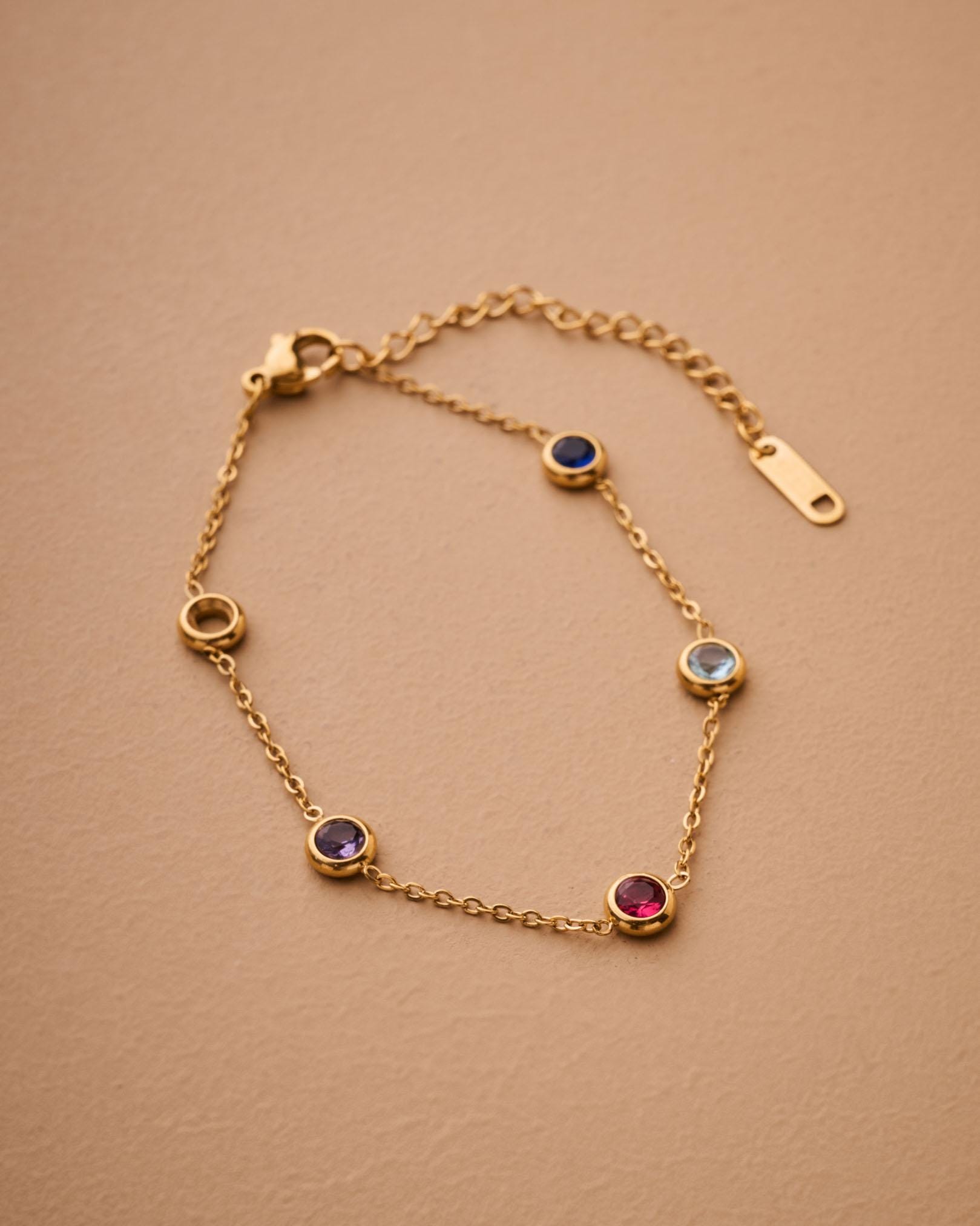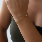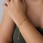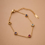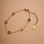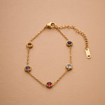 Αυτό το λεπτεπίλεπτο βραχιόλι διαθέτει χρυσή αλυσίδα από ανοξείδωτο ατσάλι διακοσμημένη με μικρές πολύχρωμες πέτρες που δημιουργούν ένα παιχνιδιάρικο και κομψό αποτέλεσμα.