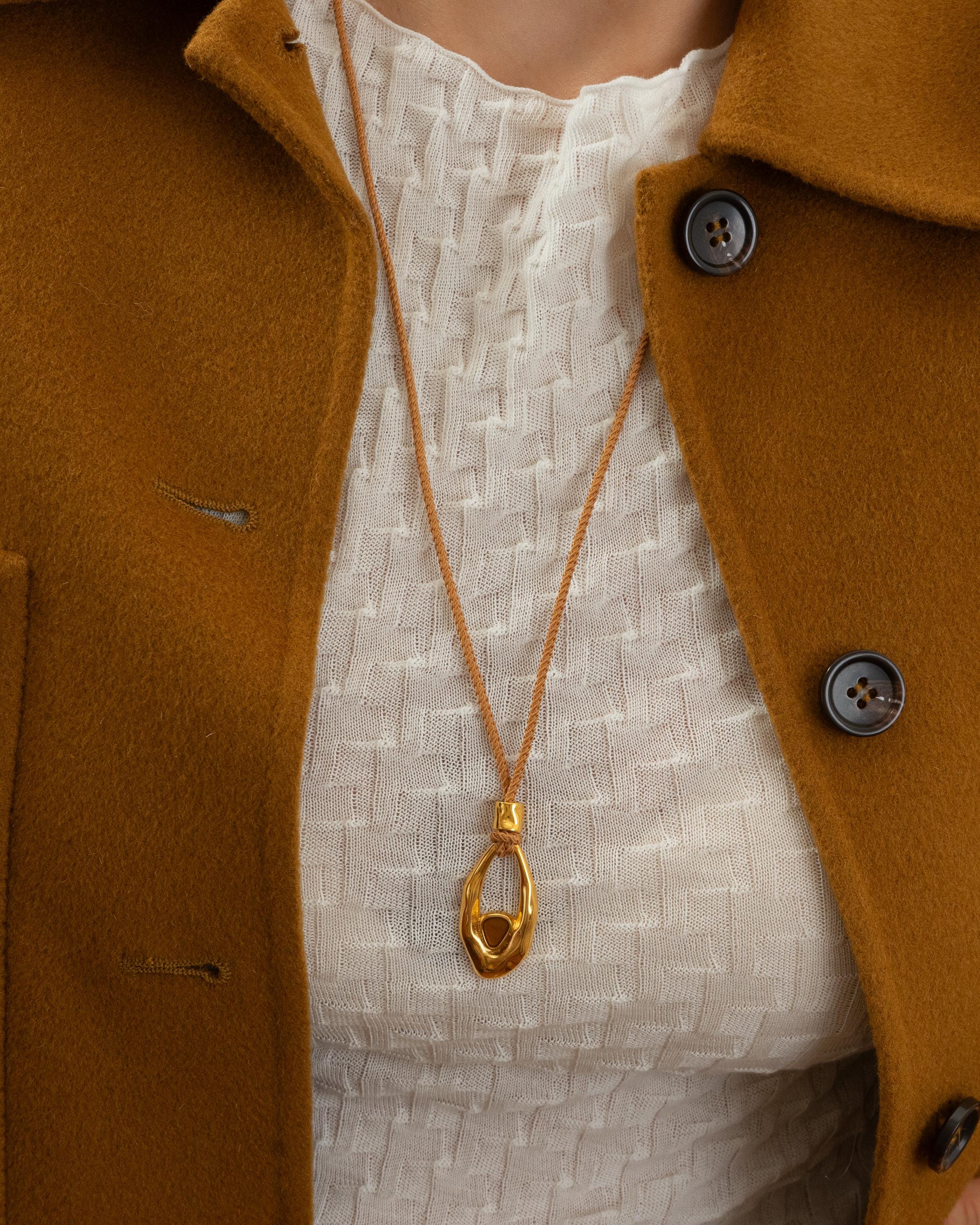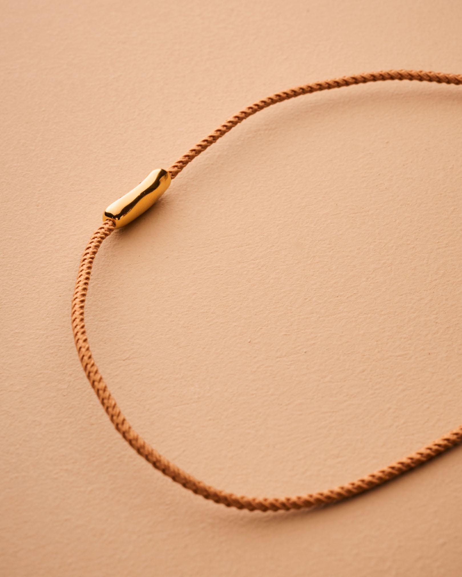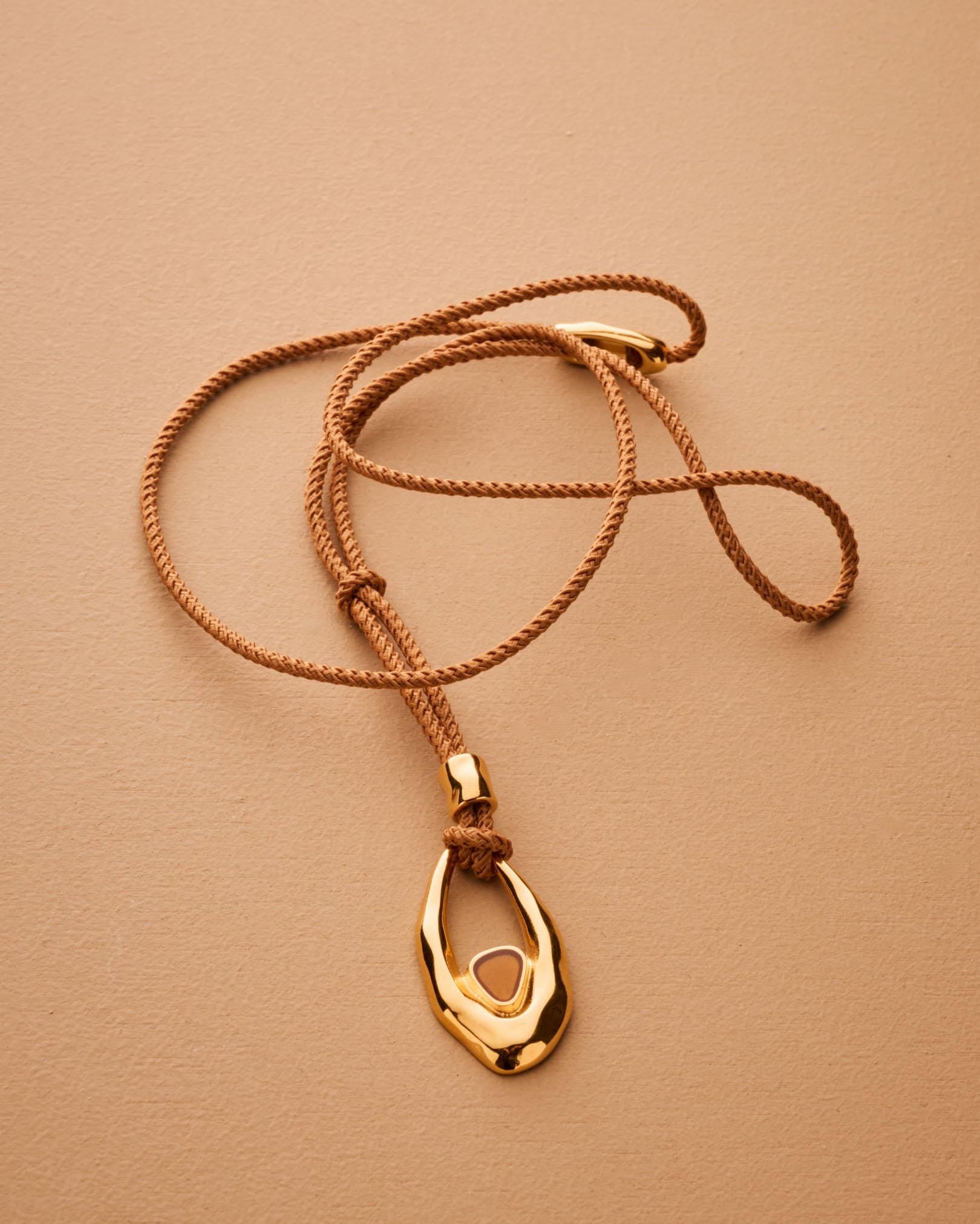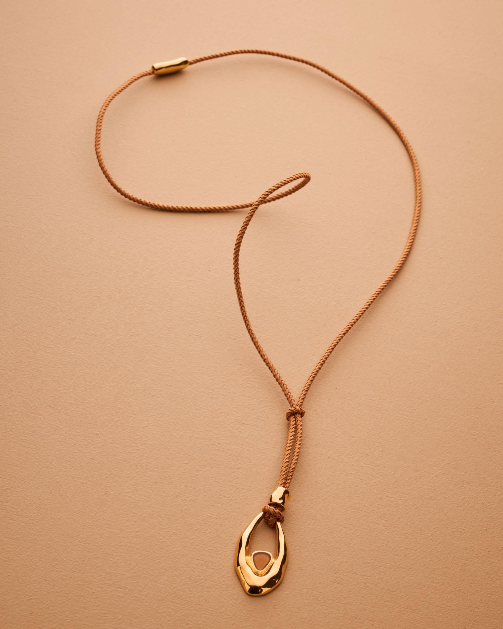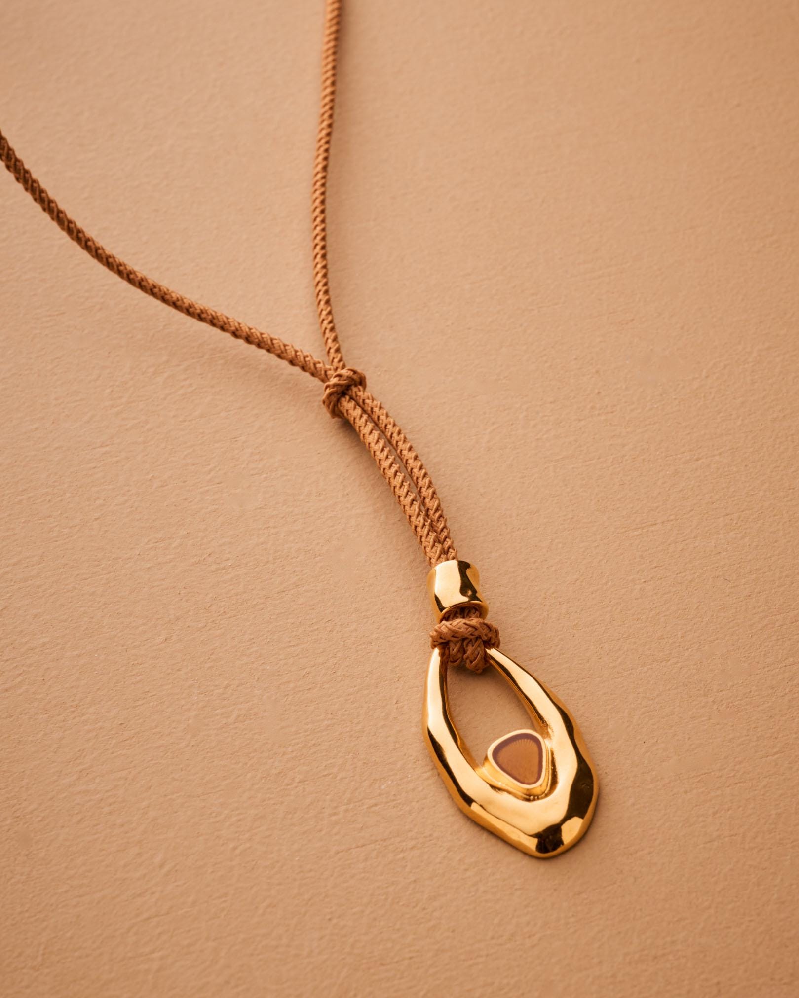 This sculptural oval pendant necklace features a warm brown enamel set in a gold-plated zamak charm. It’s strung on an earthy twisted rope cord and finished with a zamak bead to elegantly conceal the knot. The mix of texture, tone, and clean lines makes it an ideal choice for effortless, minimalist styling with an organic touch.