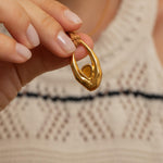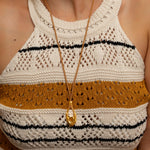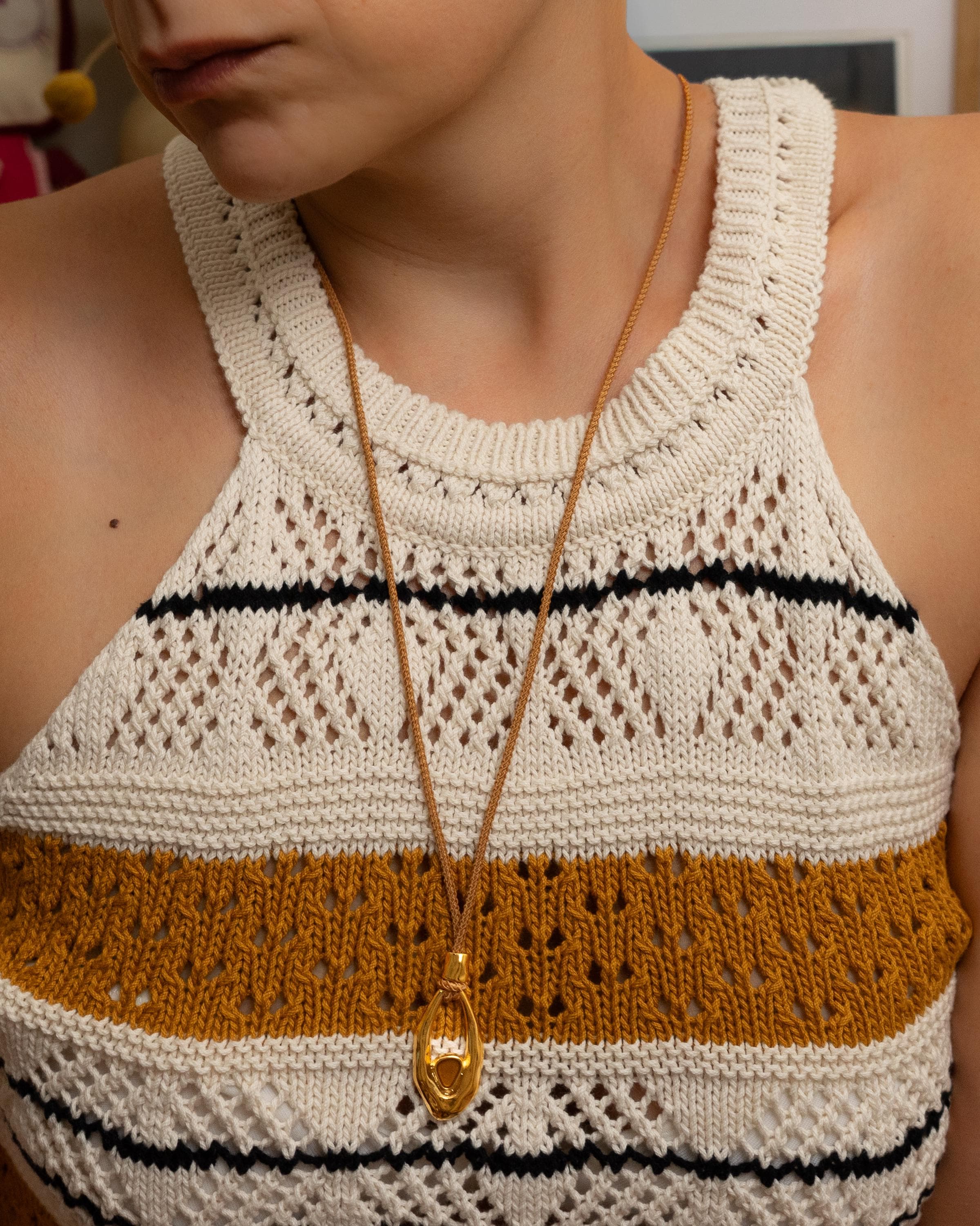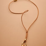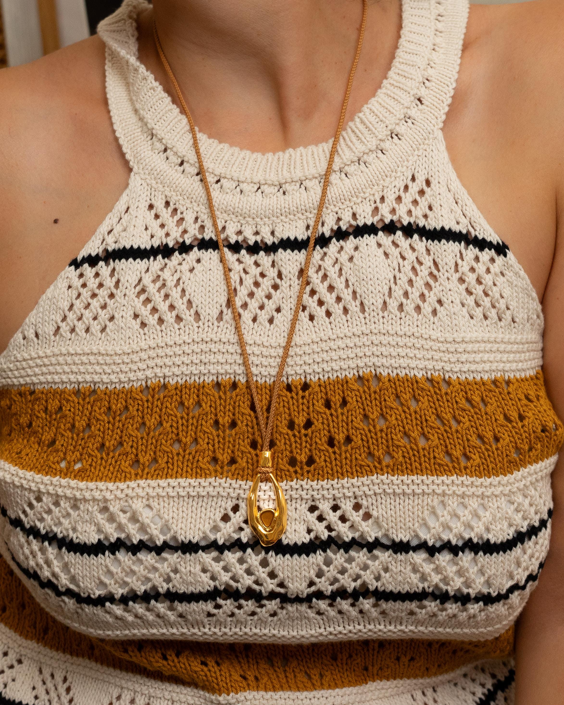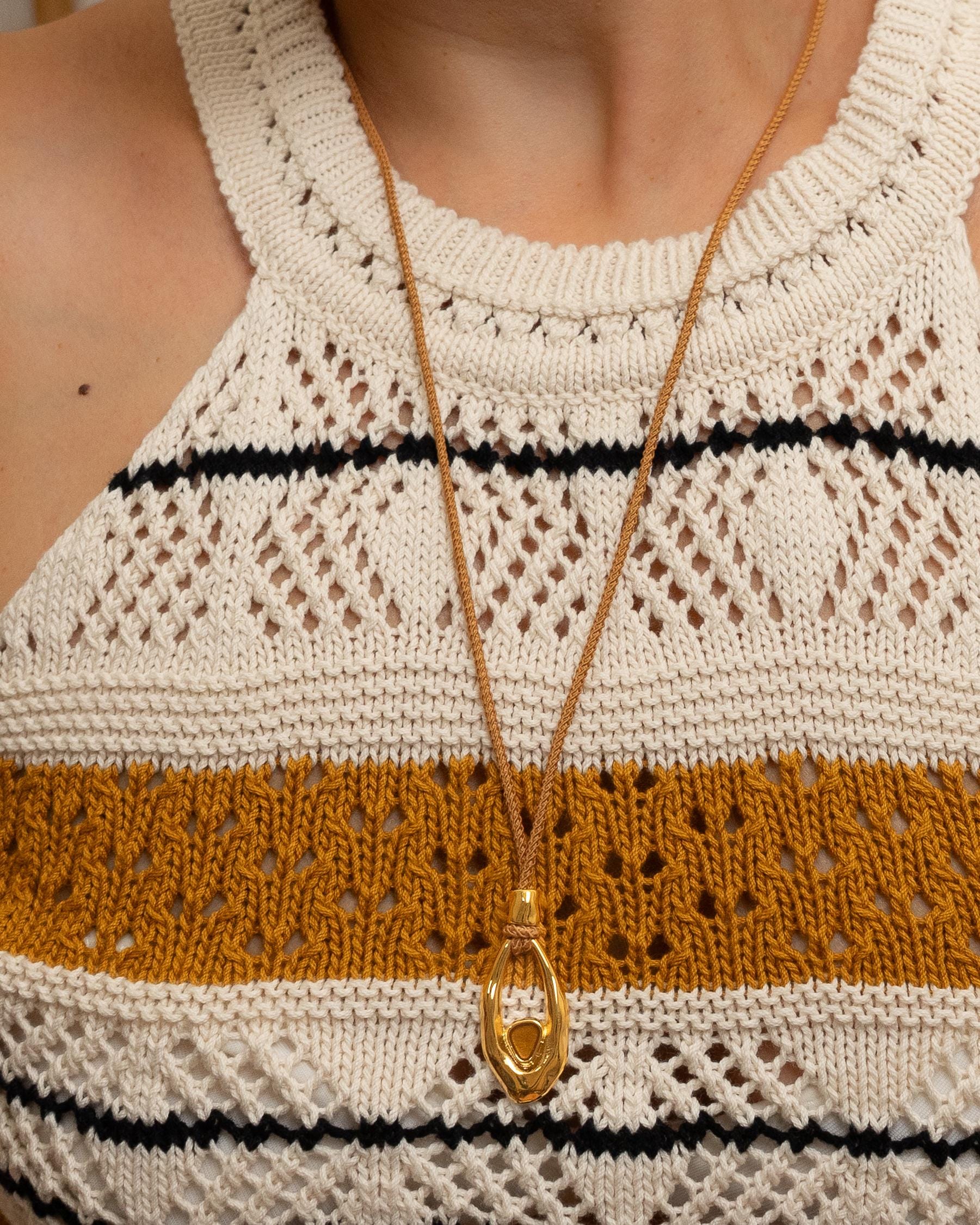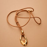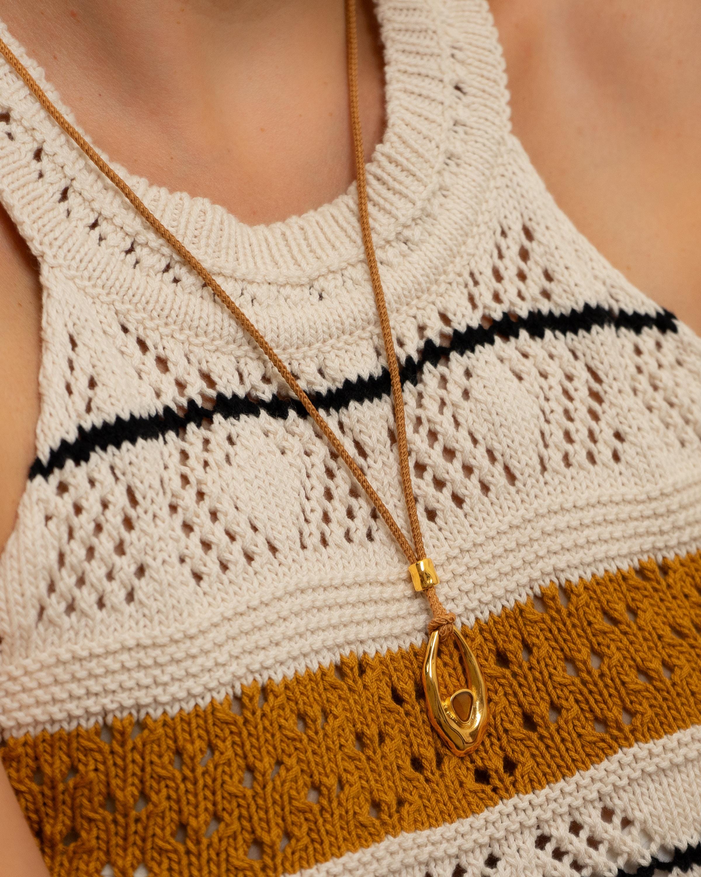 This sculptural oval pendant necklace features a warm brown enamel set in a gold-plated zamak charm. It’s strung on an earthy twisted rope cord and finished with a zamak bead to elegantly conceal the knot. The mix of texture, tone, and clean lines makes it an ideal choice for effortless, minimalist styling with an organic touch.