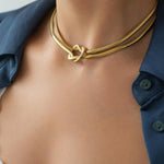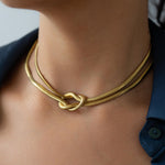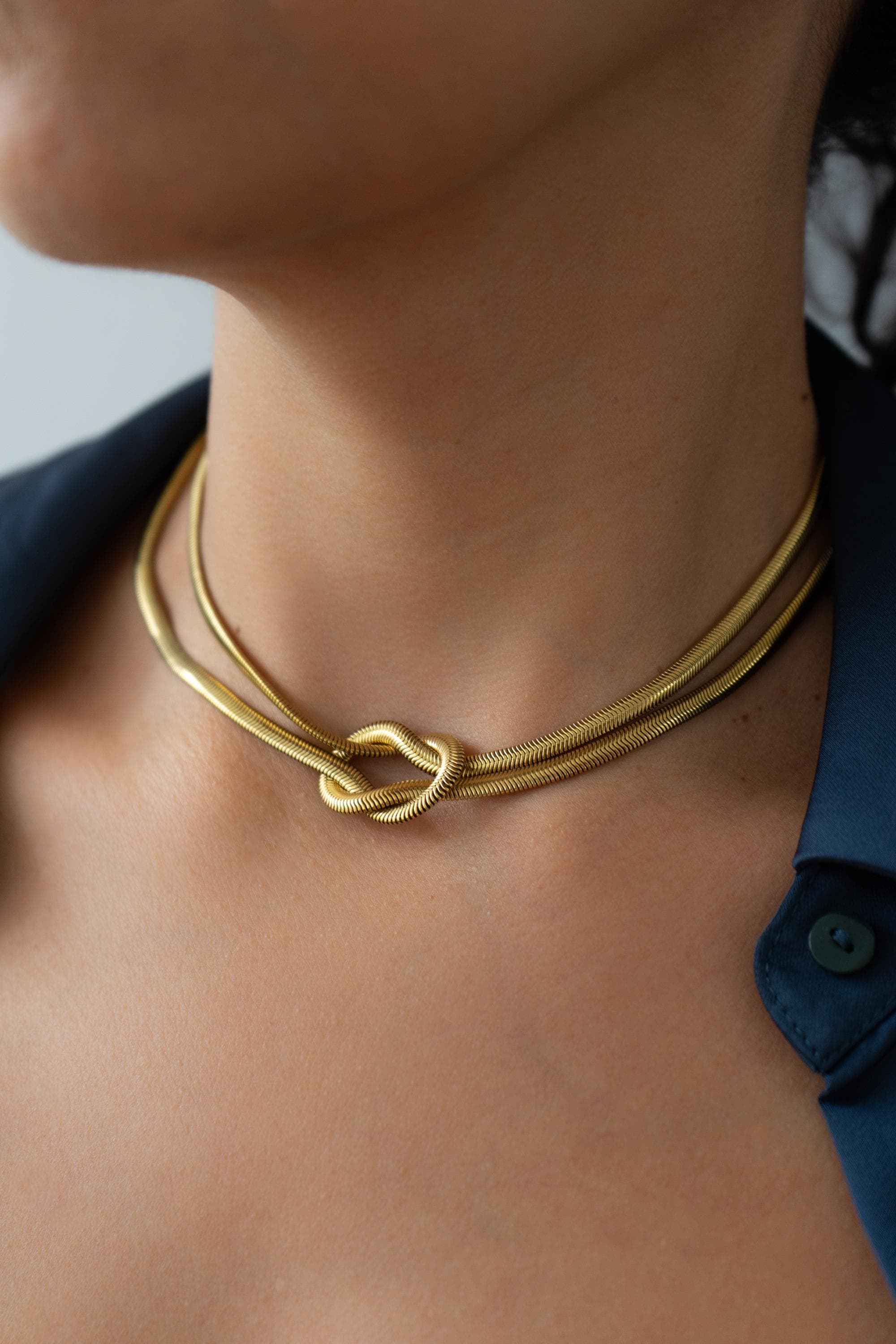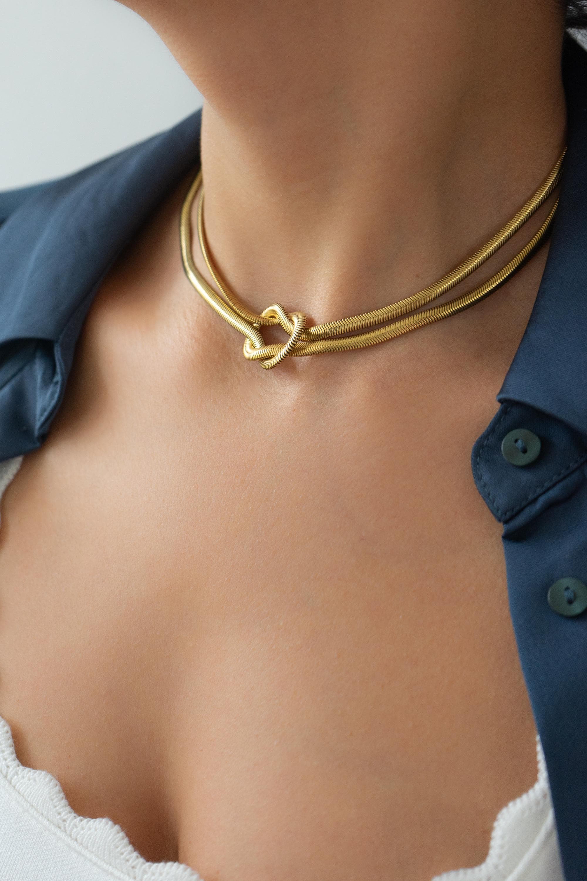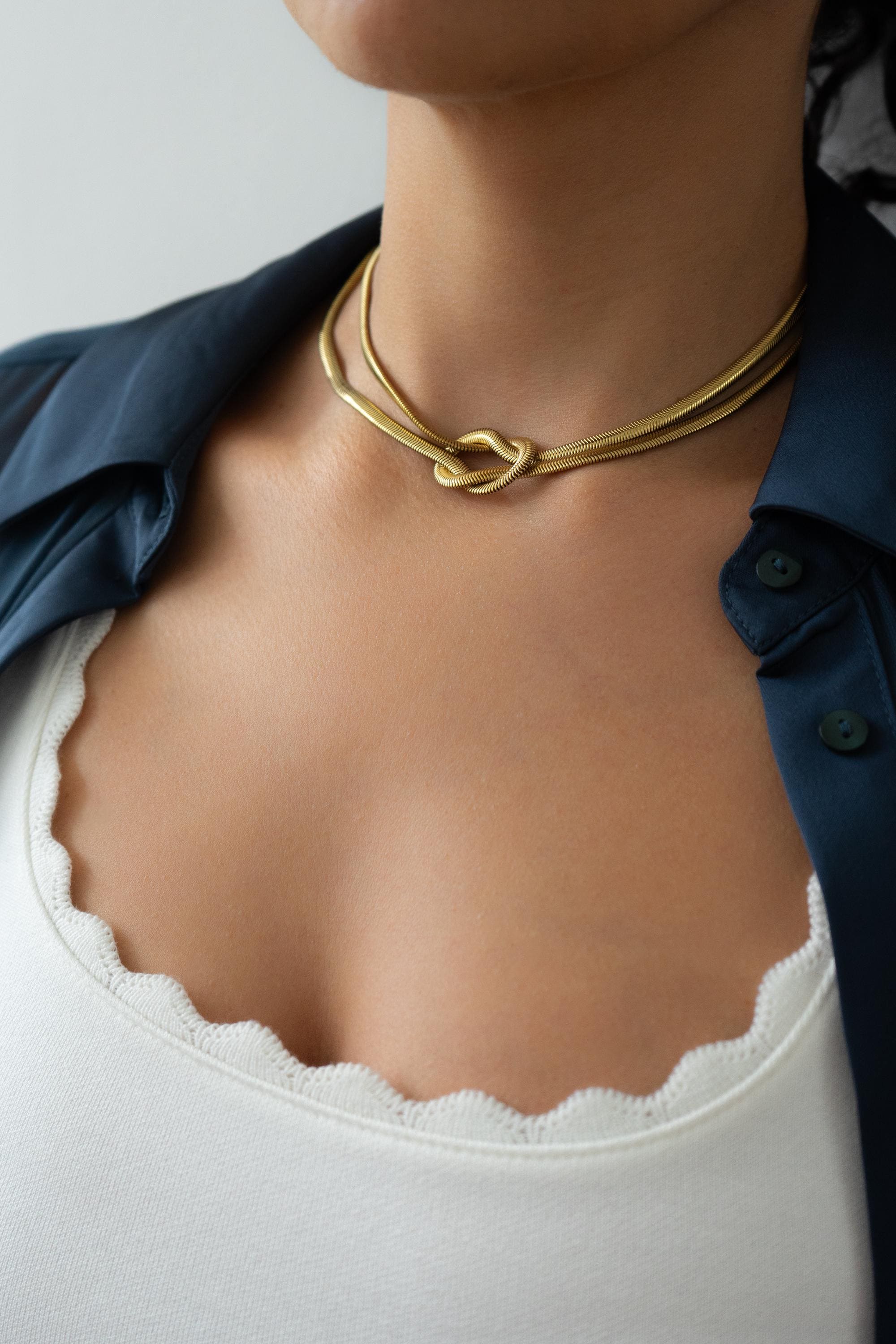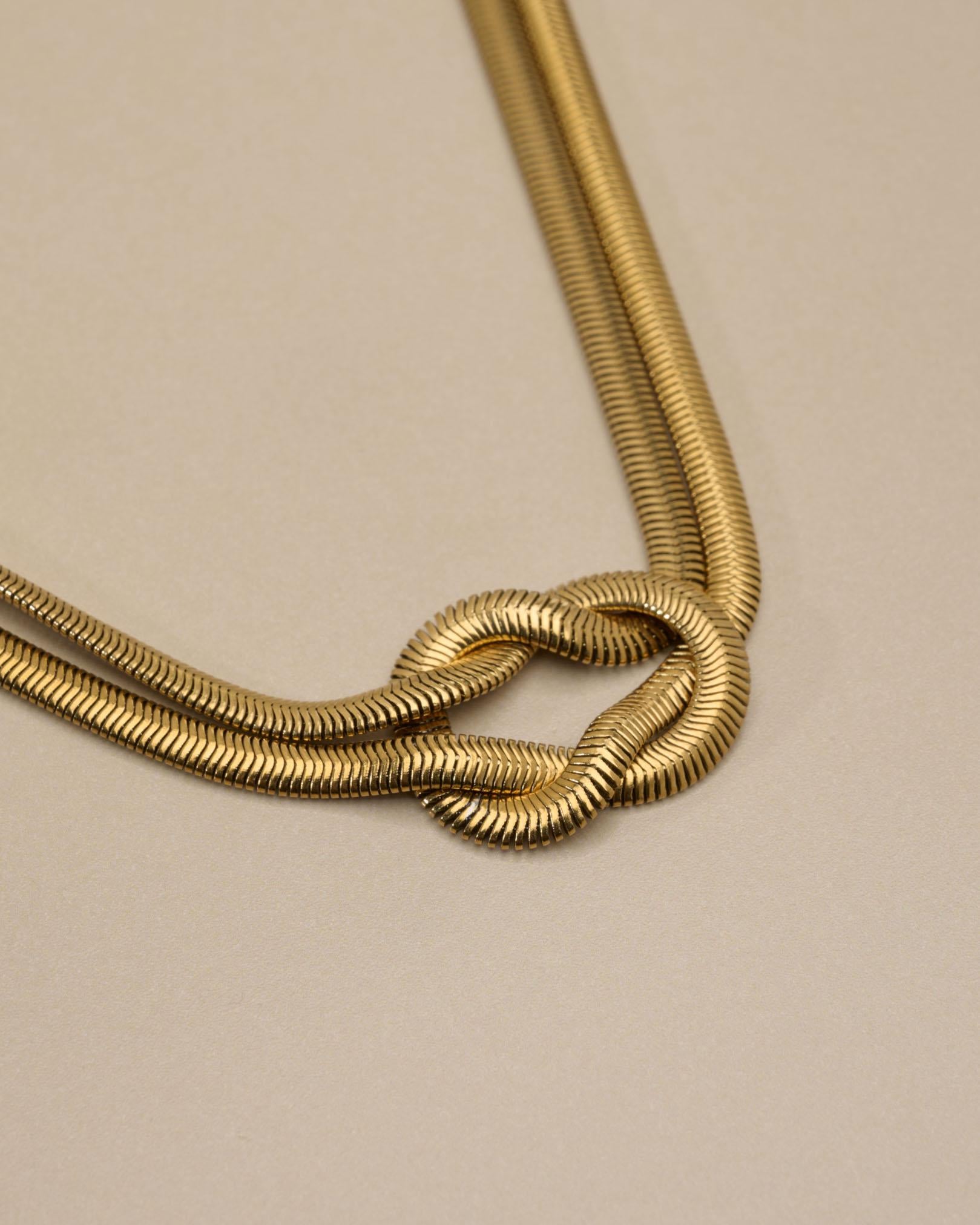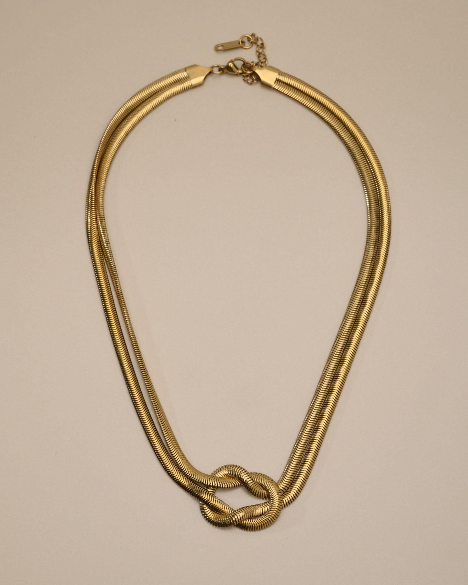 Αυτό το κολιέ από ανοξείδωτο ατσάλι με χρυσό φινίρισμα αποτελείται από πολλαπλές snake αλυσίδες που ενώνονται σε έναν γλυπτικό κόμπο στο κέντρο. Το αποτέλεσμα είναι ένα έντονο αλλά ισορροπημένο σχέδιο που αγκαλιάζει όμορφα το ντεκολτέ.