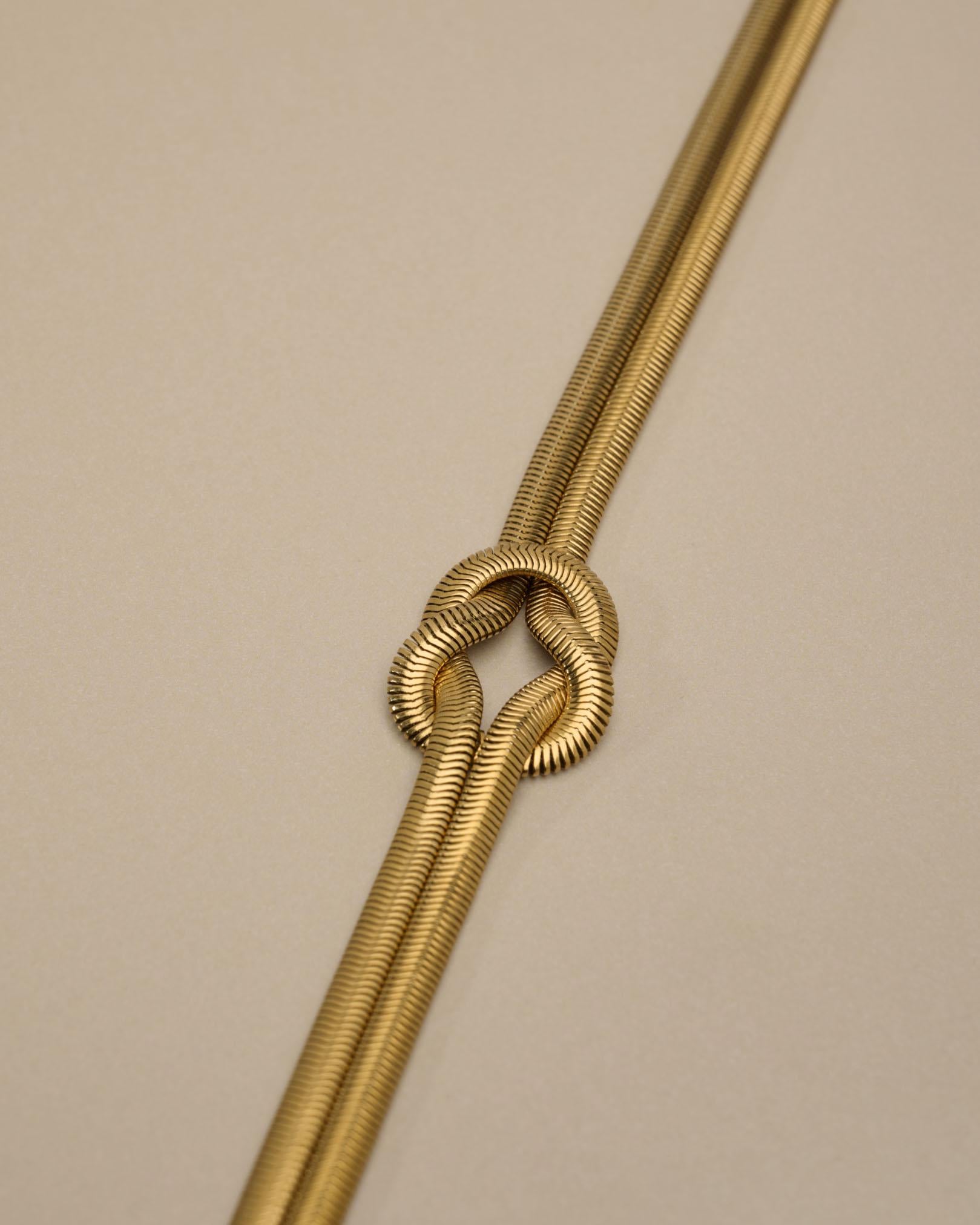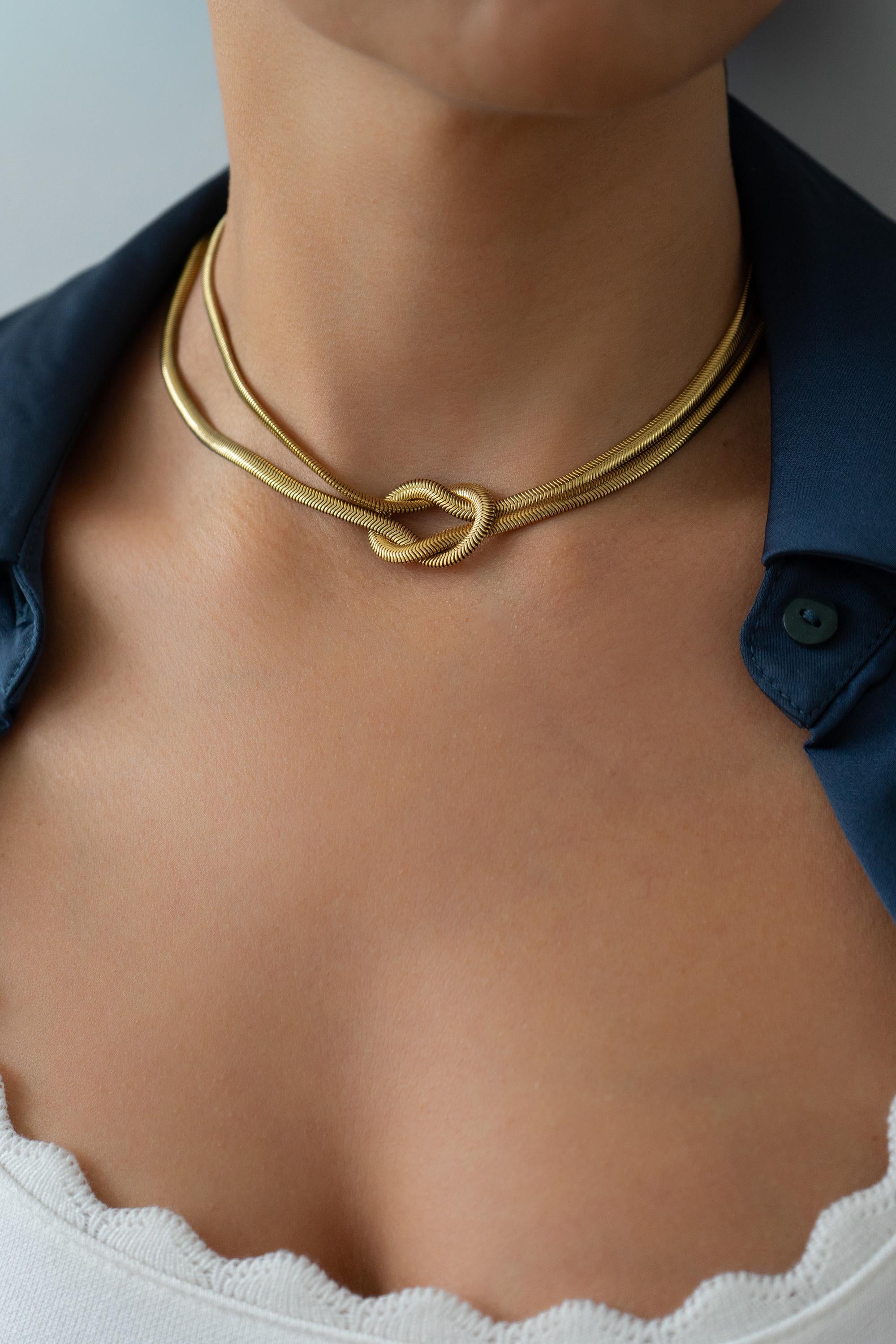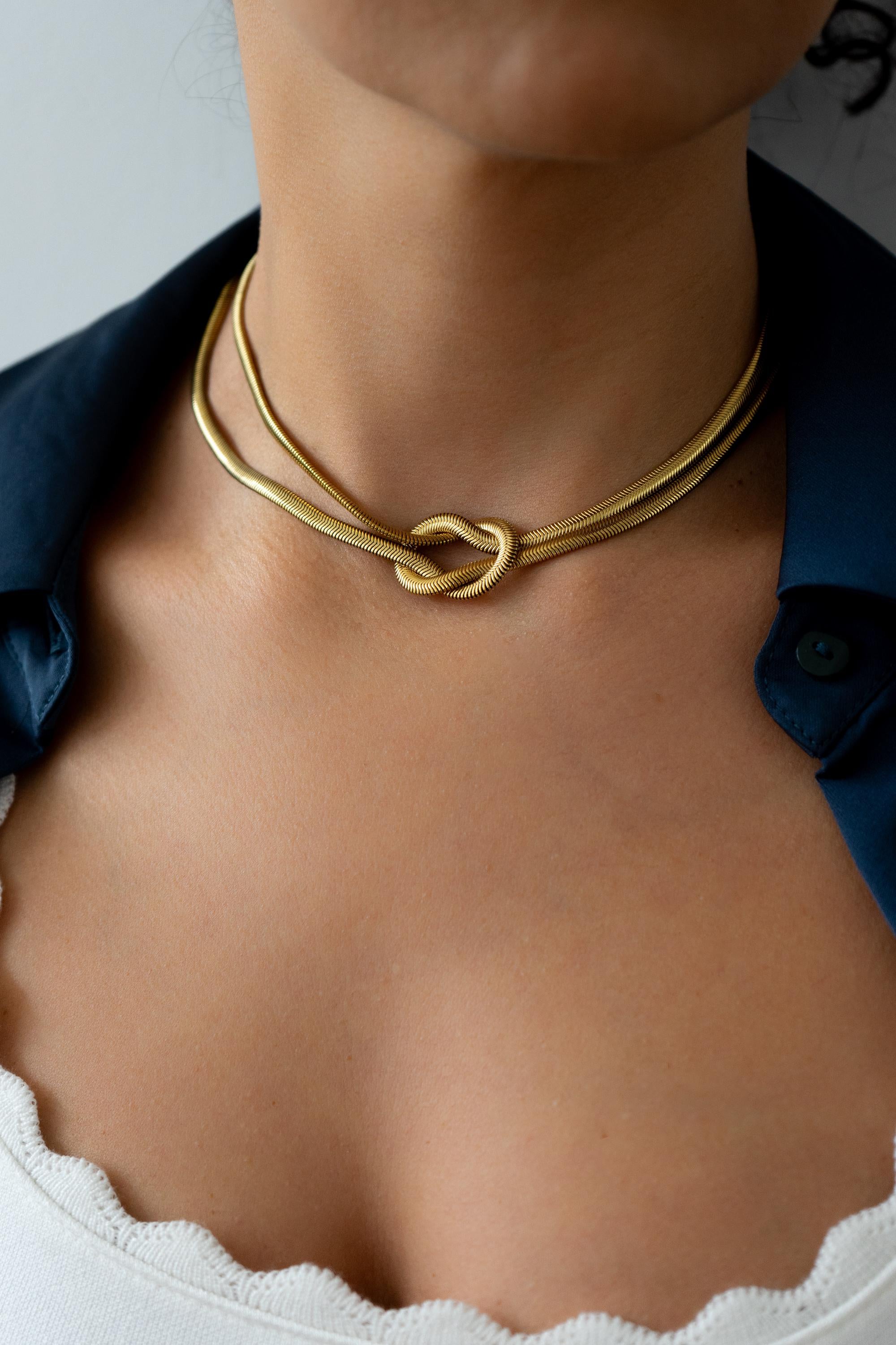 Η λεία υφή της snake αλυσίδας αντανακλά το φως δημιουργώντας μια κομψή λάμψη, ενώ ο κόμπος προσθέτει χαρακτήρα και δομή στο κόσμημα. Ένα statement κομμάτι που μπορεί να μεταμορφώσει ακόμη και το πιο απλό outfit.