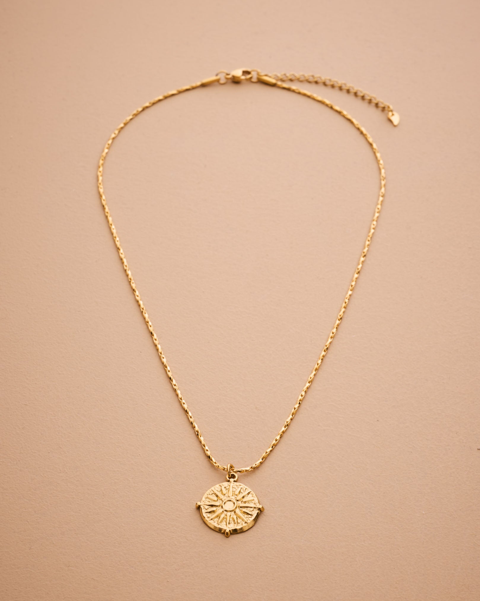 This Gold Vergina Sun Necklace celebrates ancient Greek symbolism with a modern, minimalist twist. Featuring the iconic 16-ray sun motif of the Greek Macedonian star, this 18 mm pendant is paired with a polished gold-tone stainless steel snake chain for a timeless silhouette.