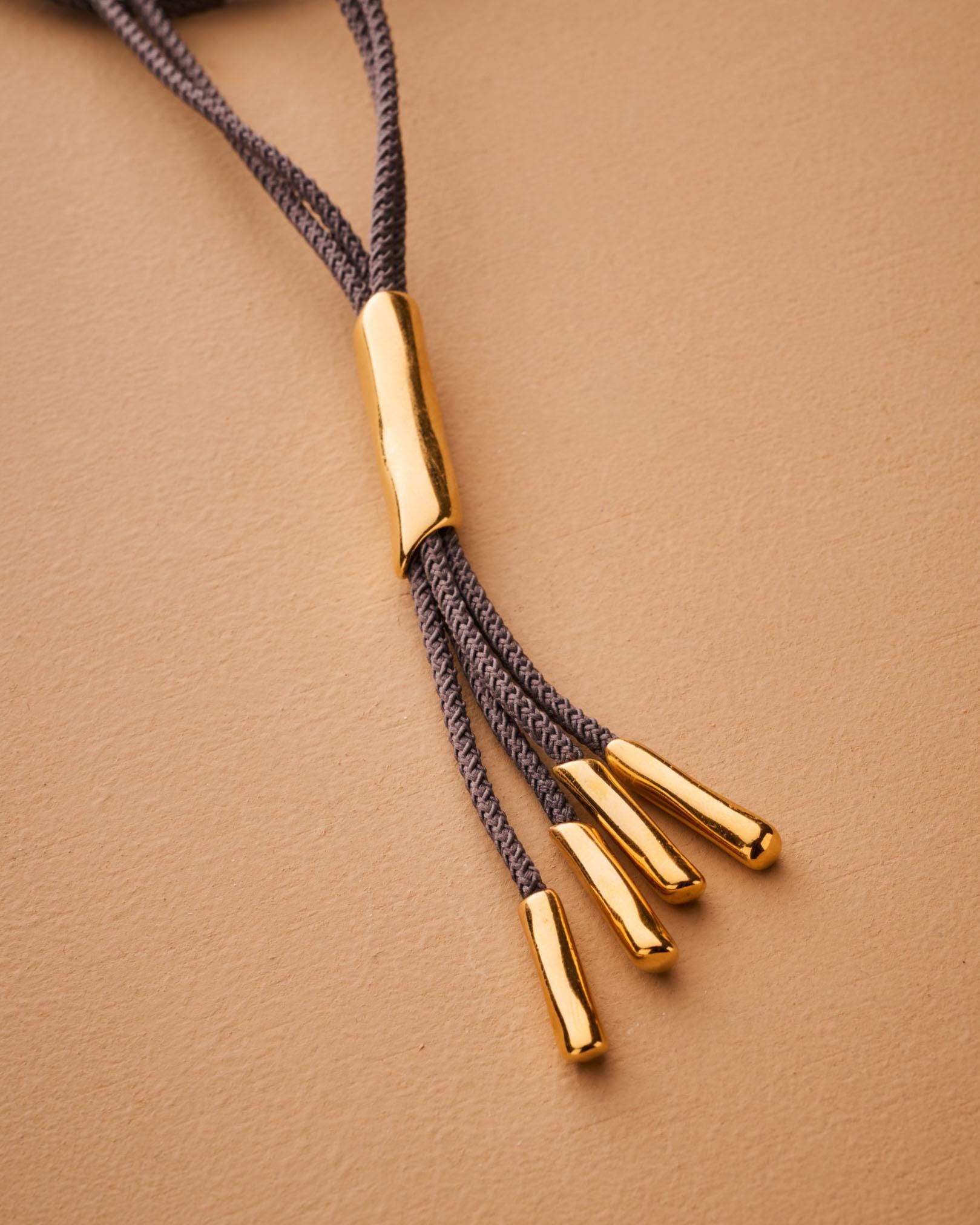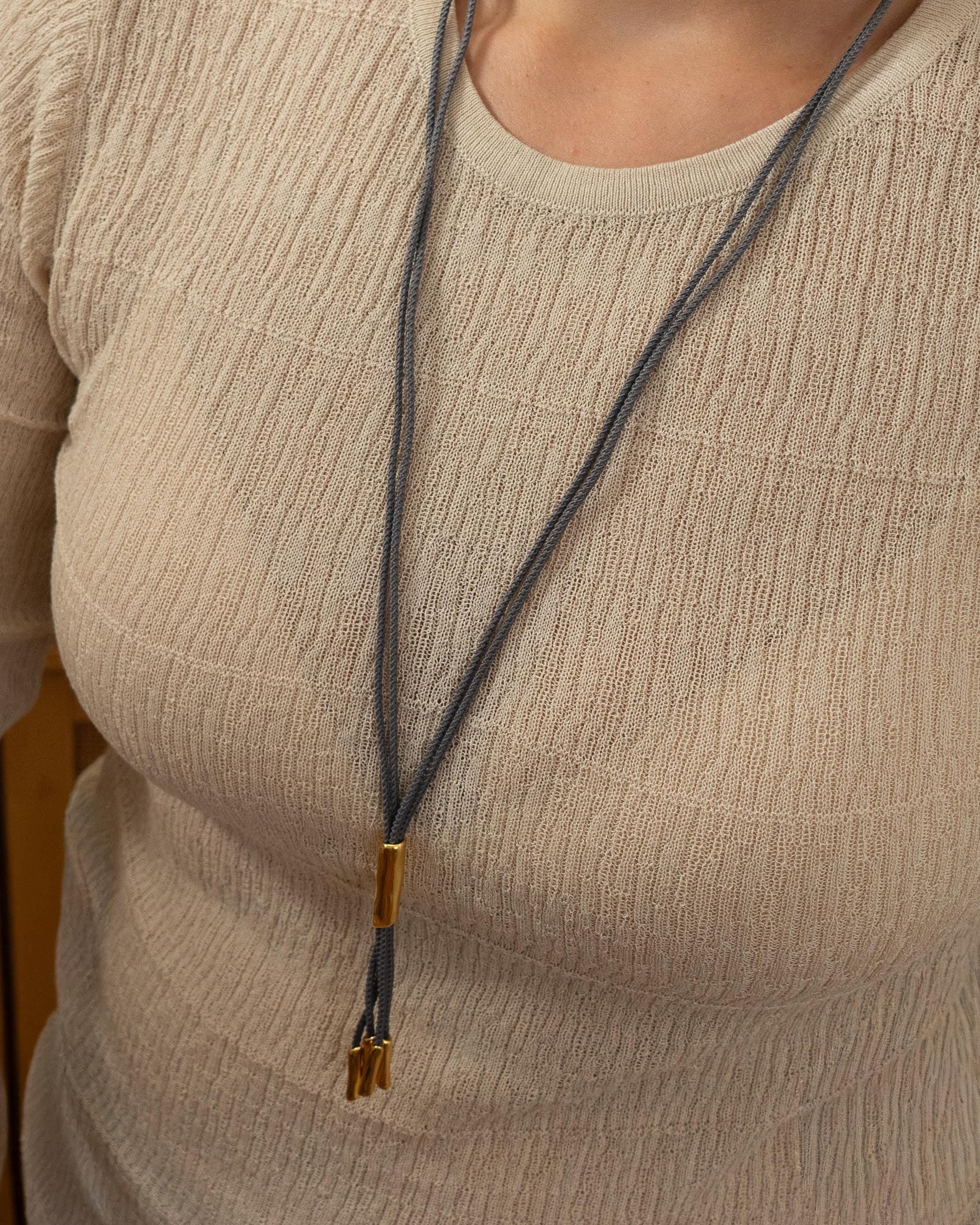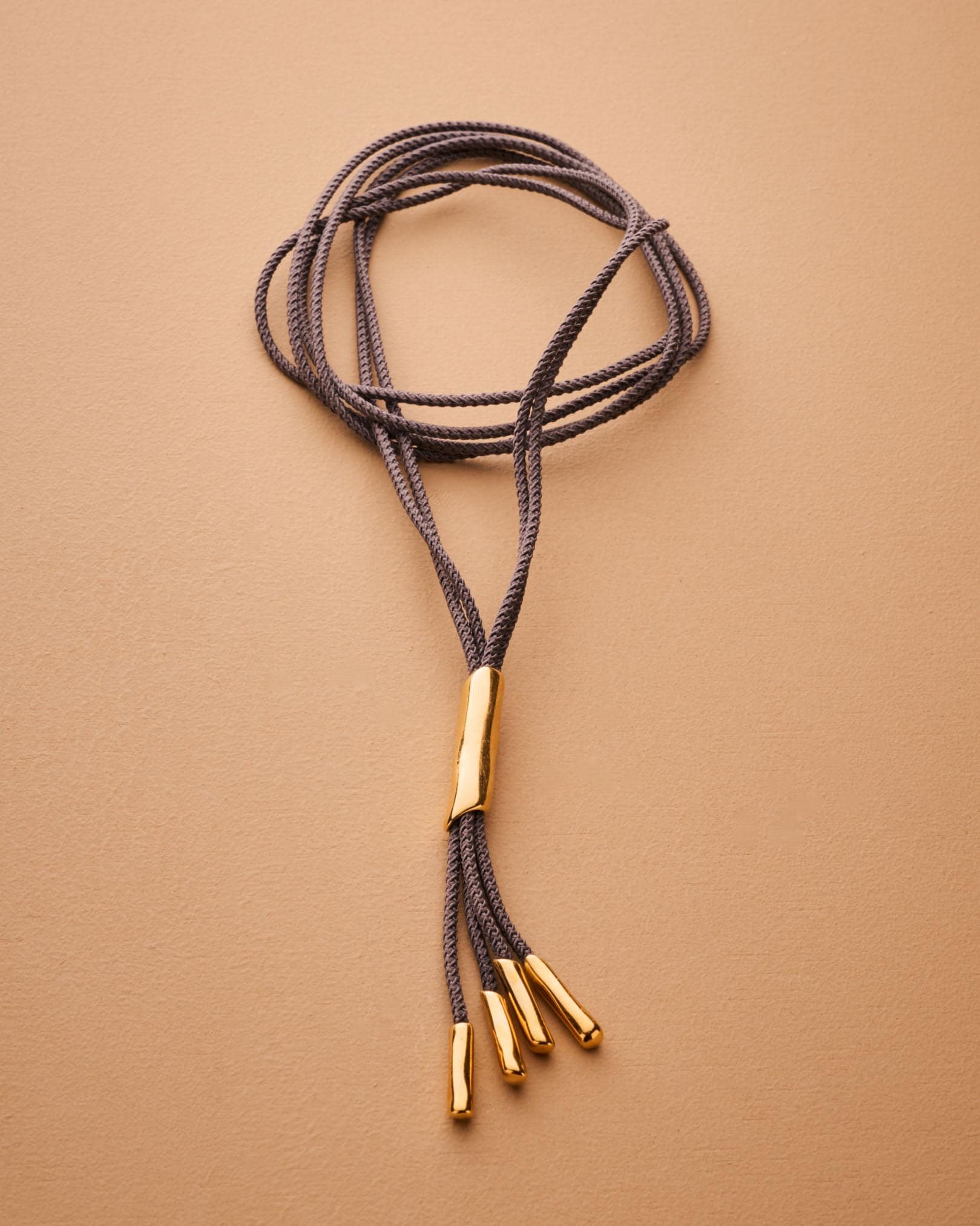 A modern reimagining of the classic bolo tie. This statement necklace is made from a twisted 3mm grey cord and finished with a long hammered gold-plated slider. At each end, sleek gold-plated bead tubes add a polished edge to the soft texture of the cord.