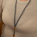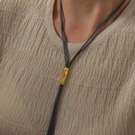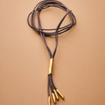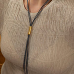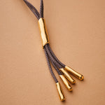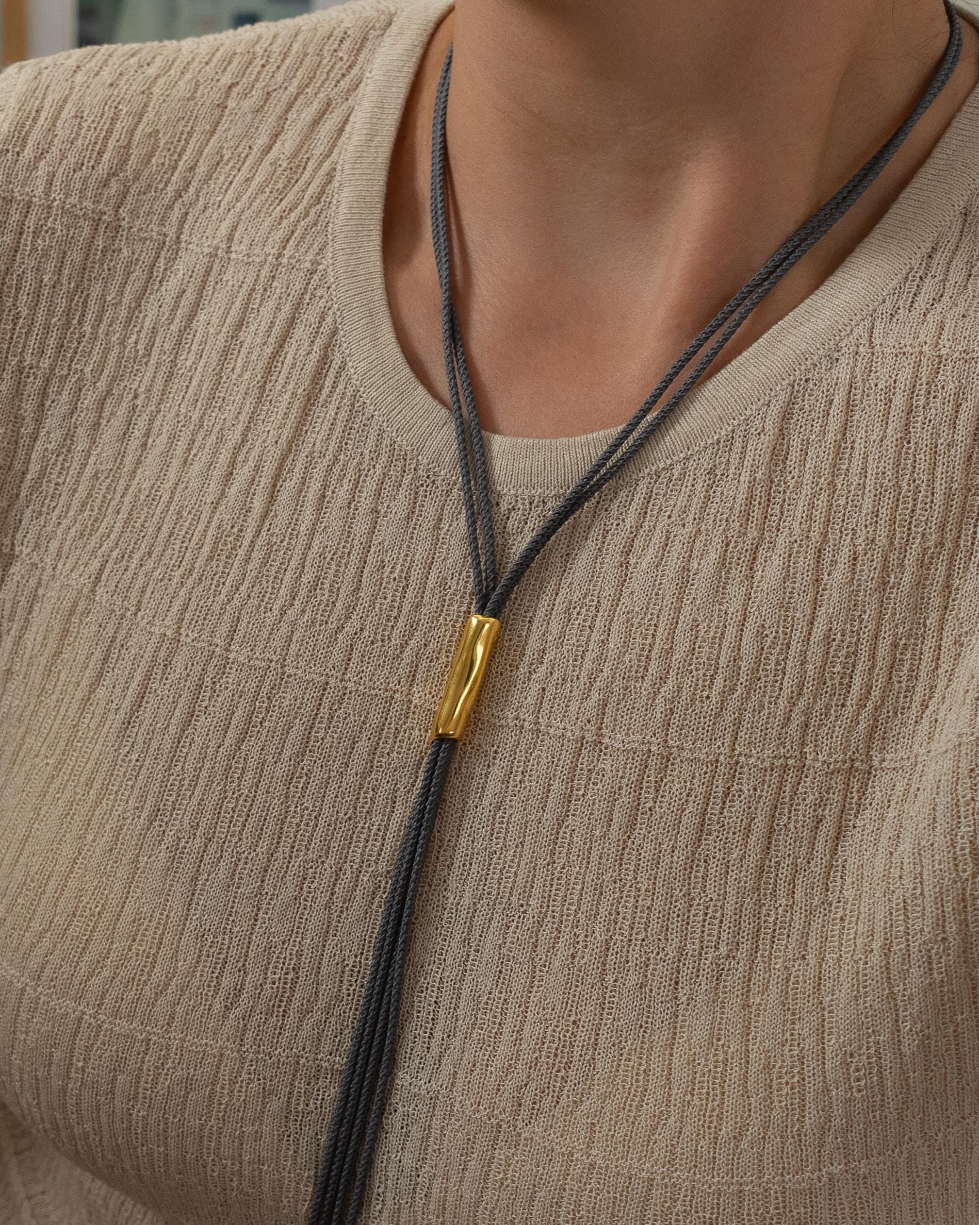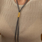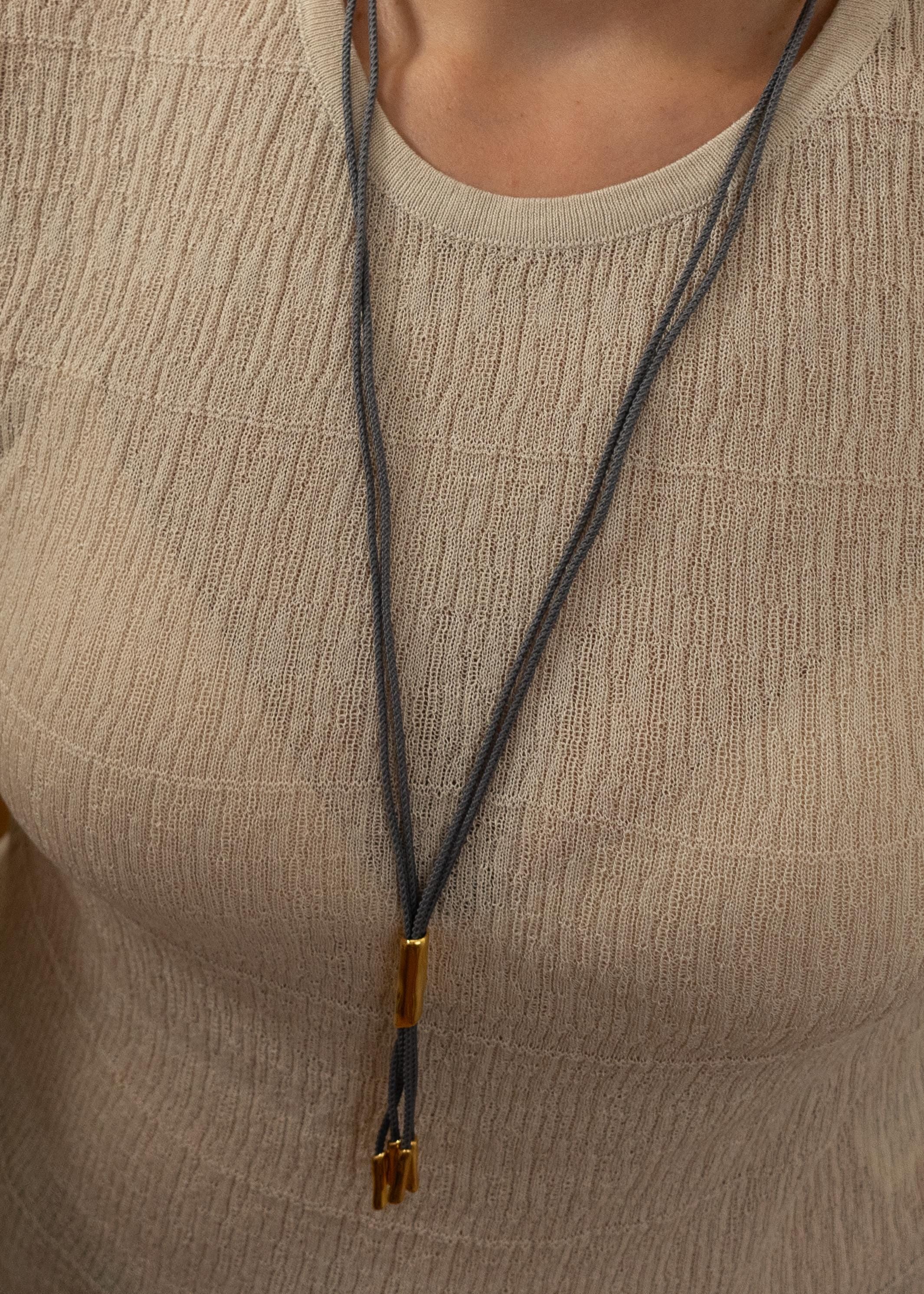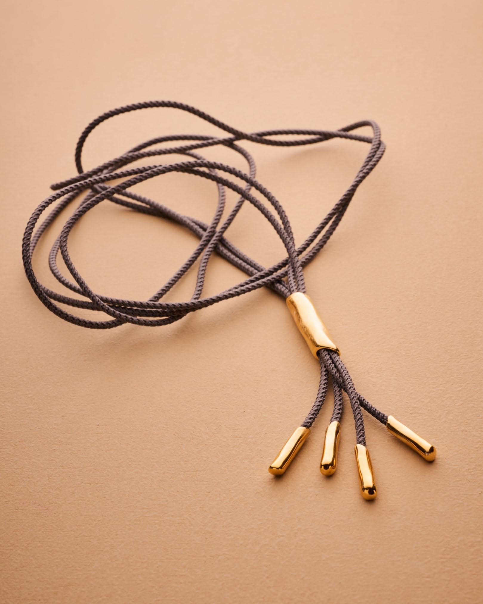 A modern reimagining of the classic bolo tie. This statement necklace is made from a twisted 3mm grey cord and finished with a long hammered gold-plated slider. At each end, sleek gold-plated bead tubes add a polished edge to the soft texture of the cord.