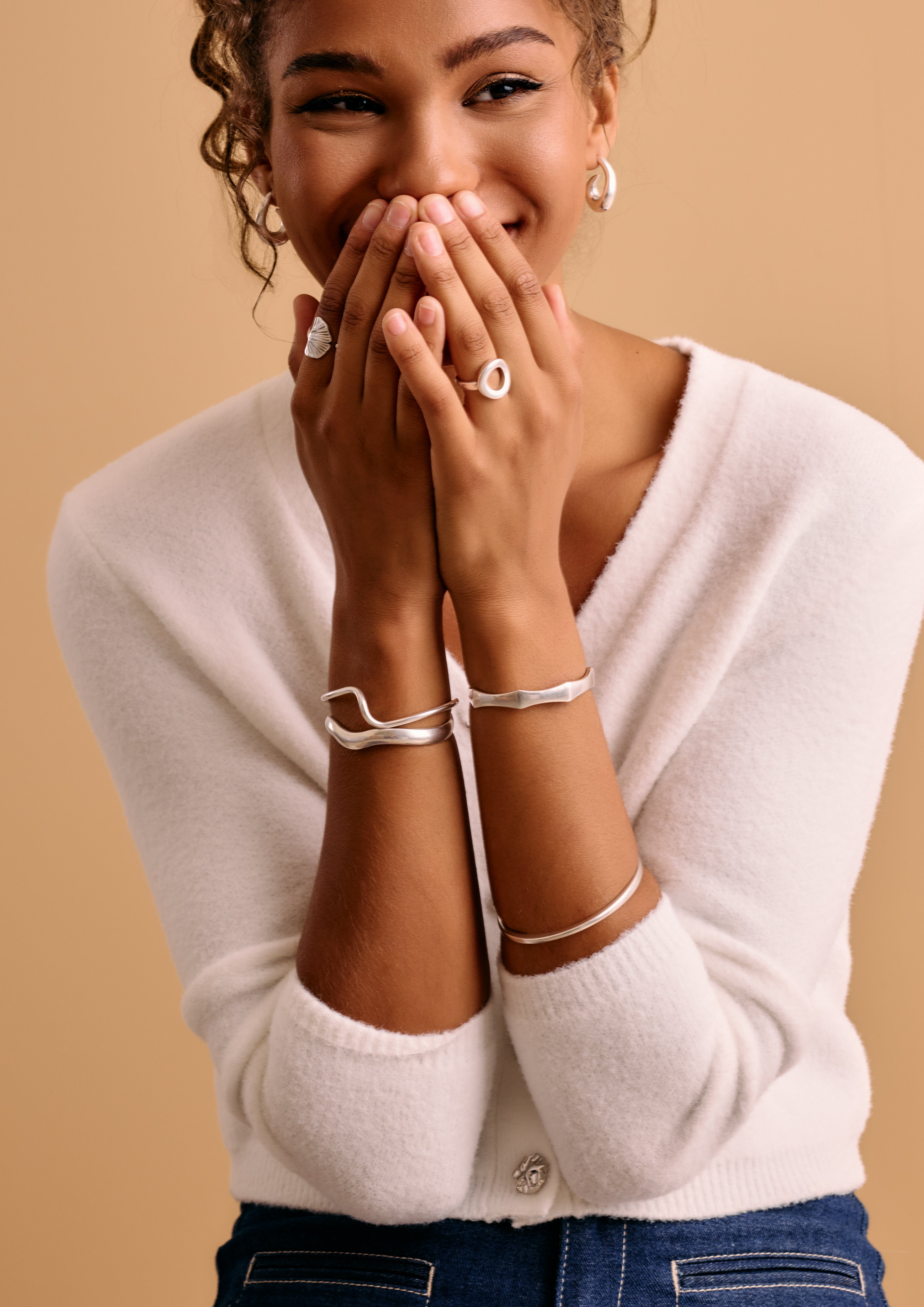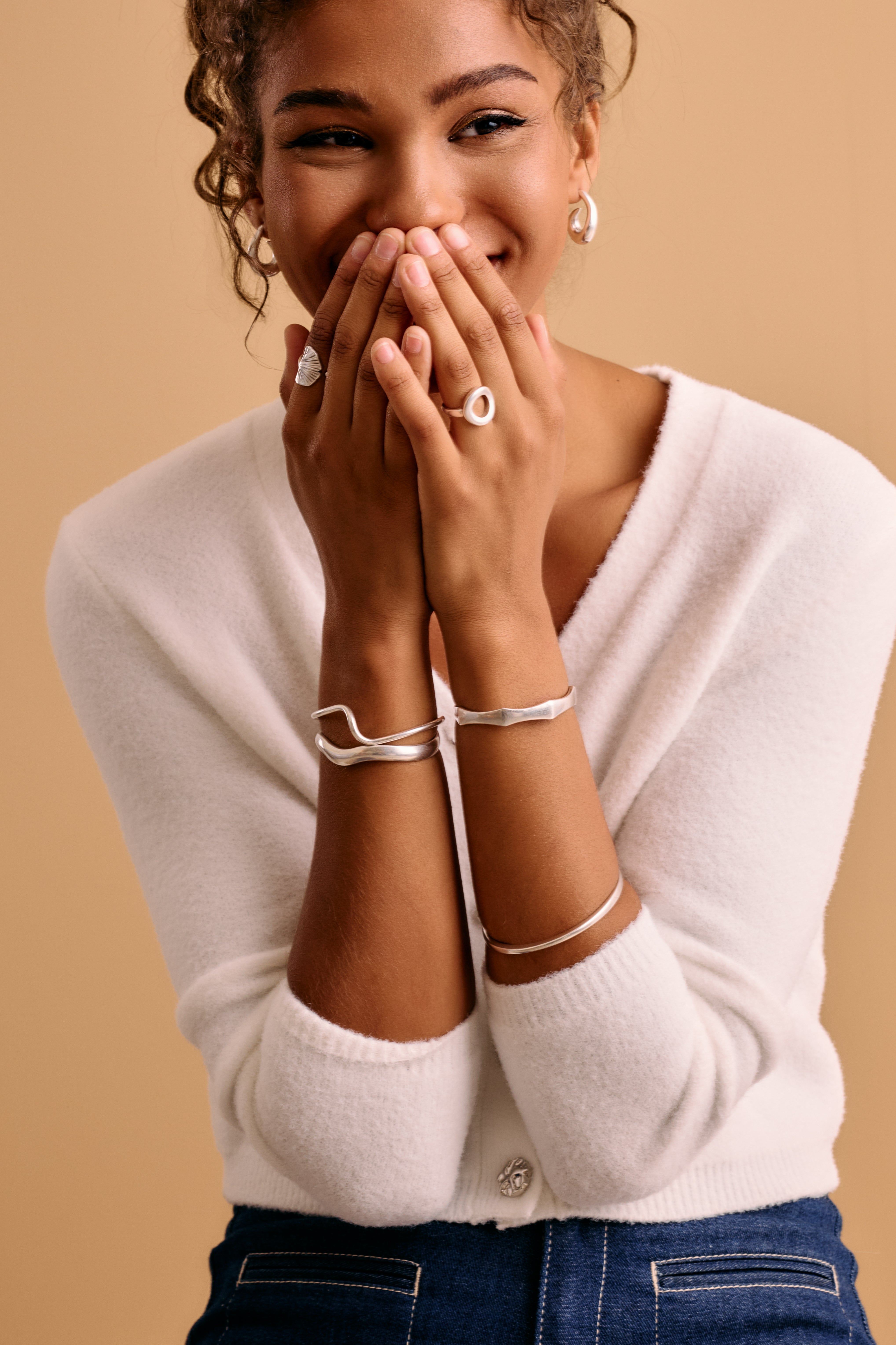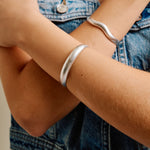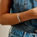 This silver-plated cuff bracelet, crafted with an antique vintage look, features a bold and irregular shape design that adds a unique edge to your style. Its distinctive character makes it a standout piece, perfect for wearing solo or mixing with other cuffs and bangles.