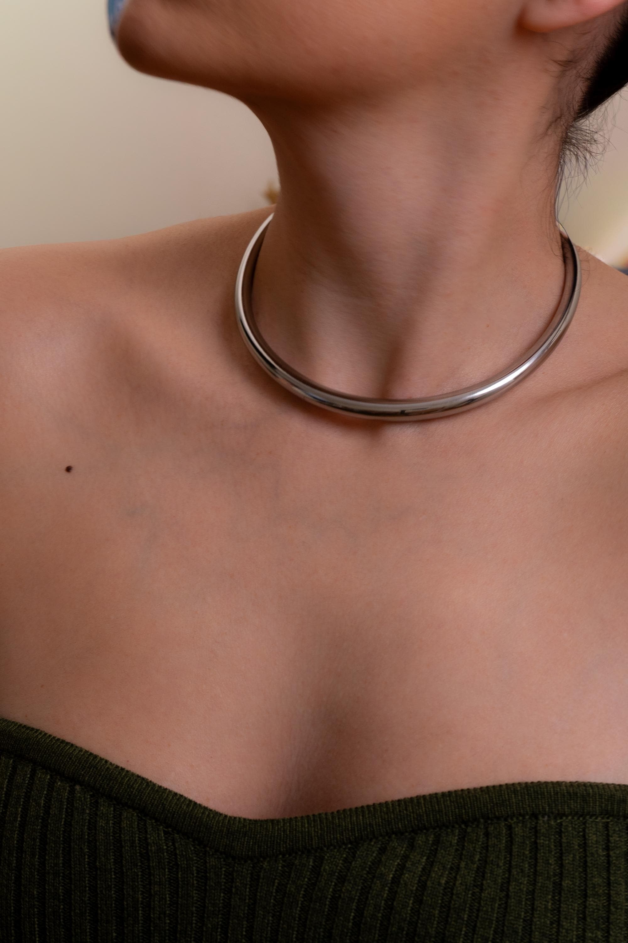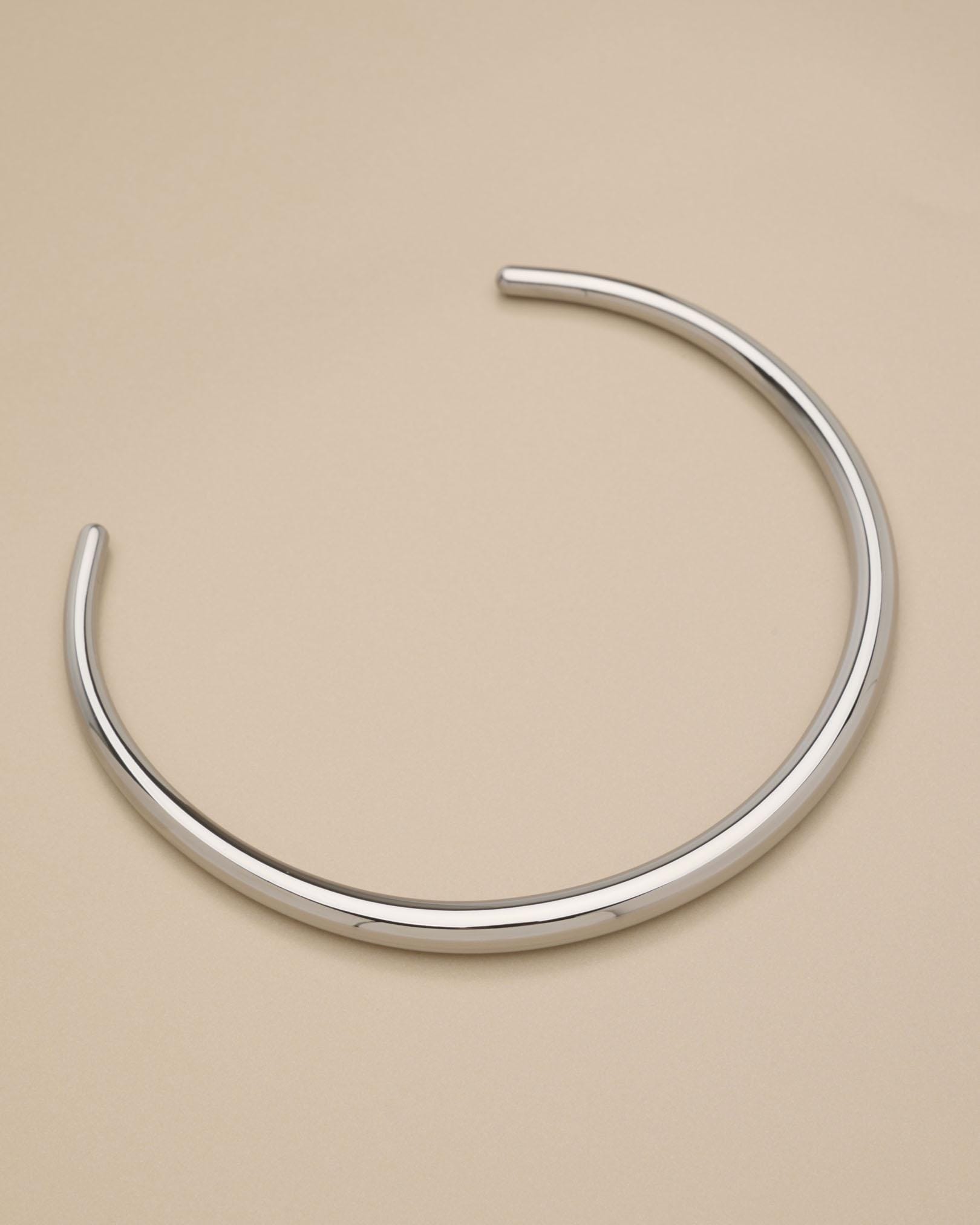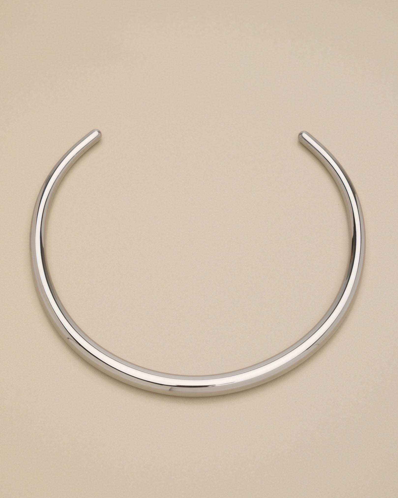 Αυτό το ασημένιο κολιέ τύπου κολάρο από ανοξείδωτο ατσάλι διαθέτει χοντρό, δομημένο σχεδιασμό και ανοιχτή γραμμή που αγκαλιάζει ψηλά το λαιμό. Δημιουργεί ένα καθαρό, αρχιτεκτονικό περίγραμμα που δίνει χαρακτήρα ακόμη και στο πιο απλό σύνολο.