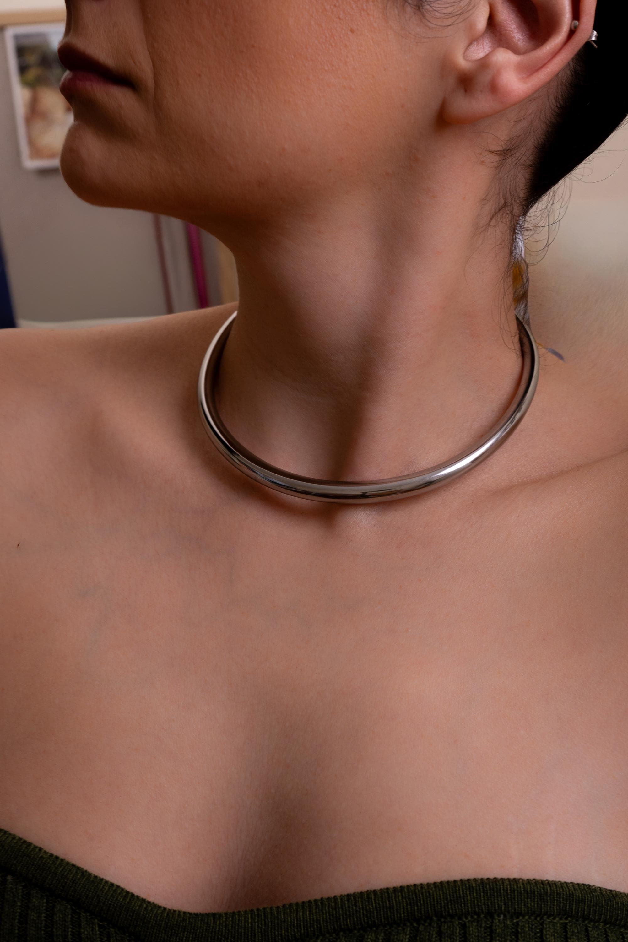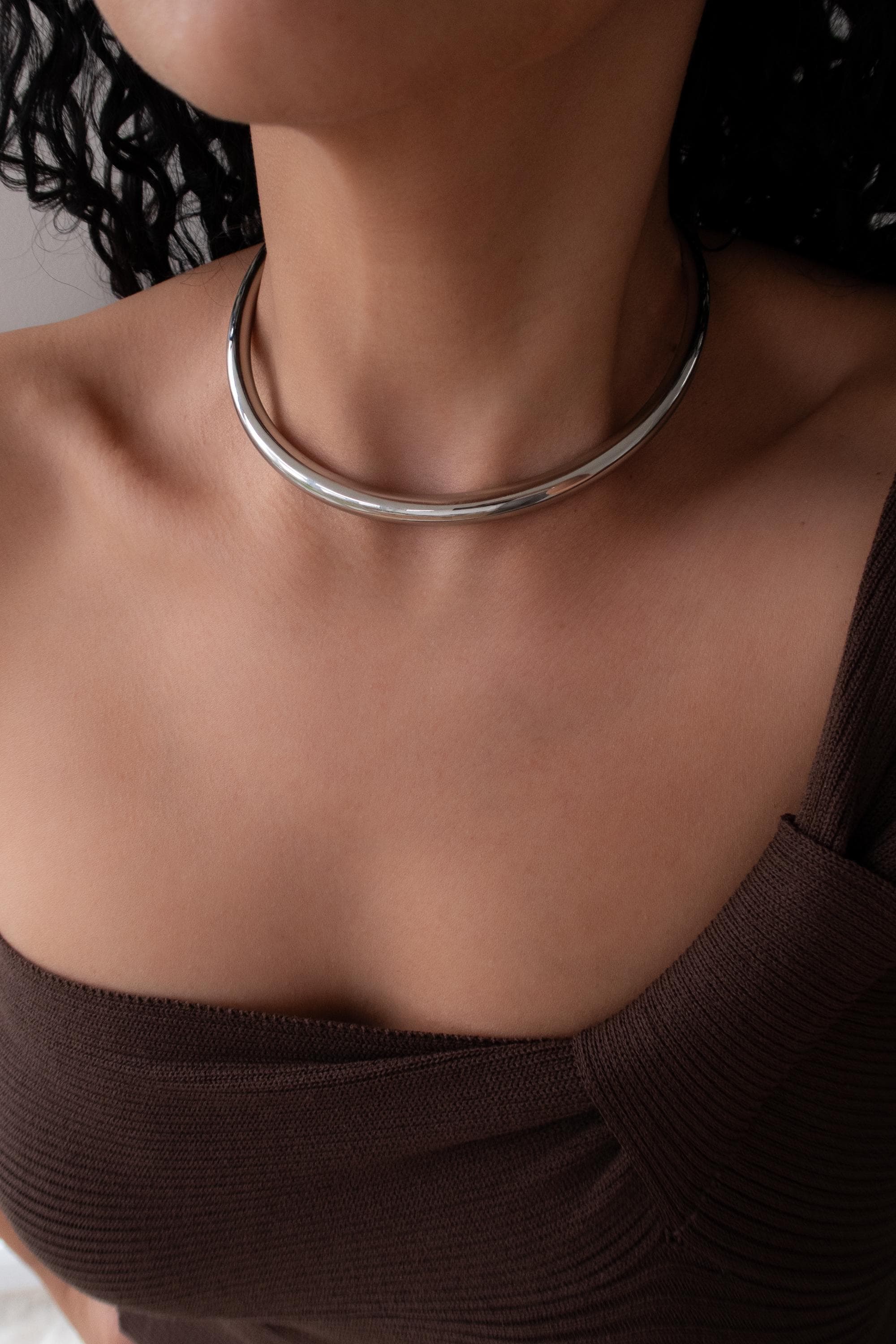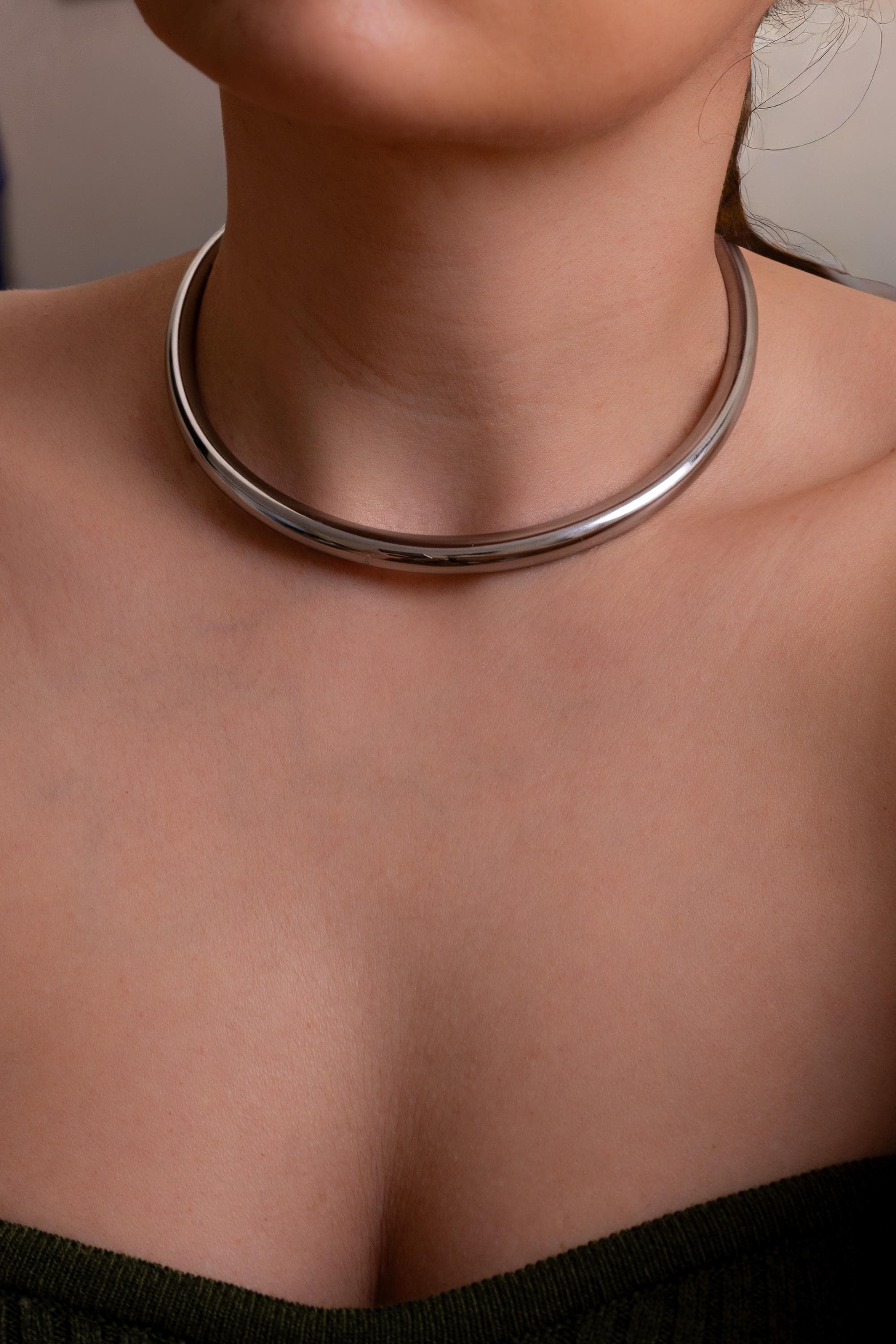Αυτό το ασημένιο κολιέ τύπου κολάρο από ανοξείδωτο ατσάλι διαθέτει χοντρό, δομημένο σχεδιασμό και ανοιχτή γραμμή που αγκαλιάζει ψηλά το λαιμό. Δημιουργεί ένα καθαρό, αρχιτεκτονικό περίγραμμα που δίνει χαρακτήρα ακόμη και στο πιο απλό σύνολο.