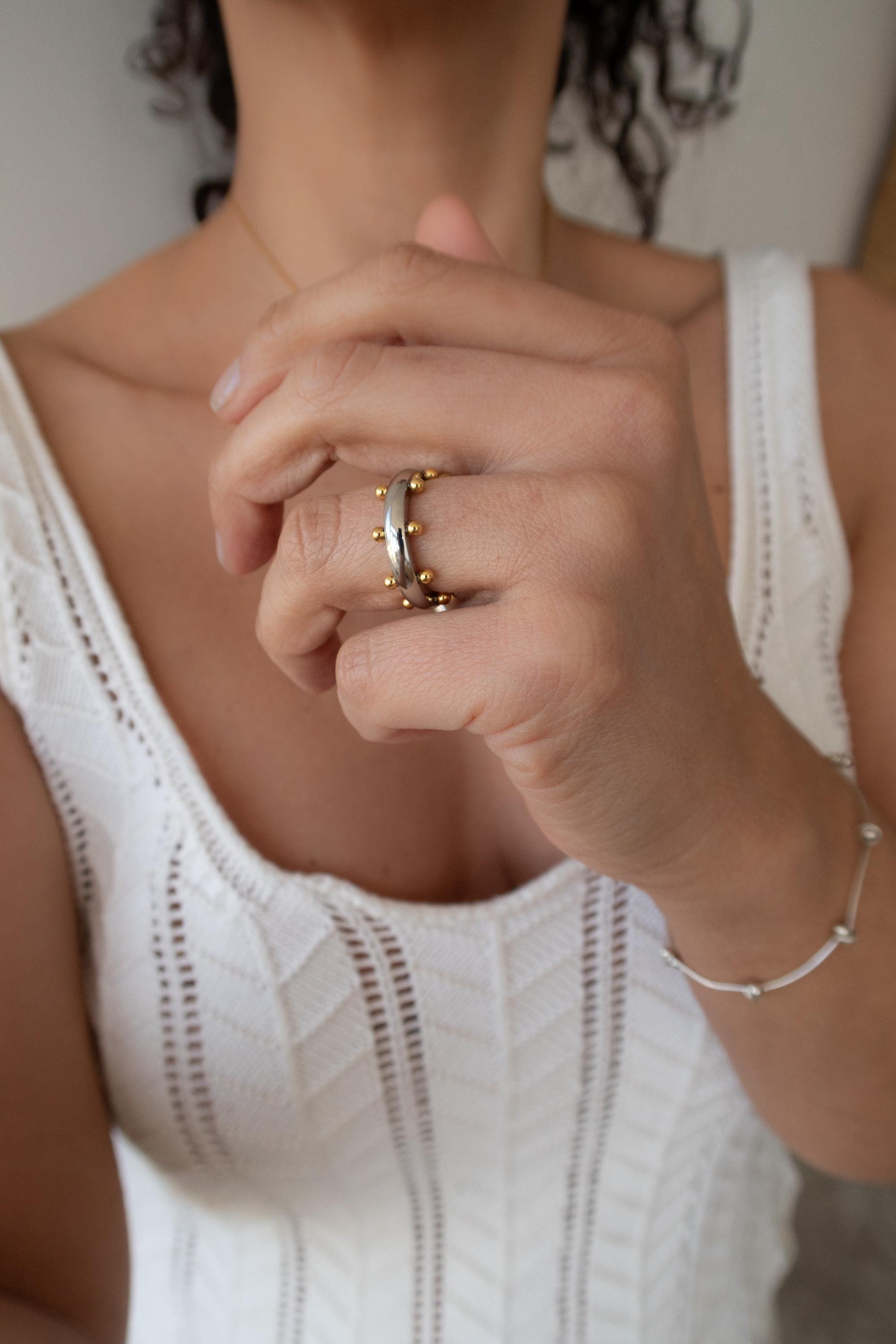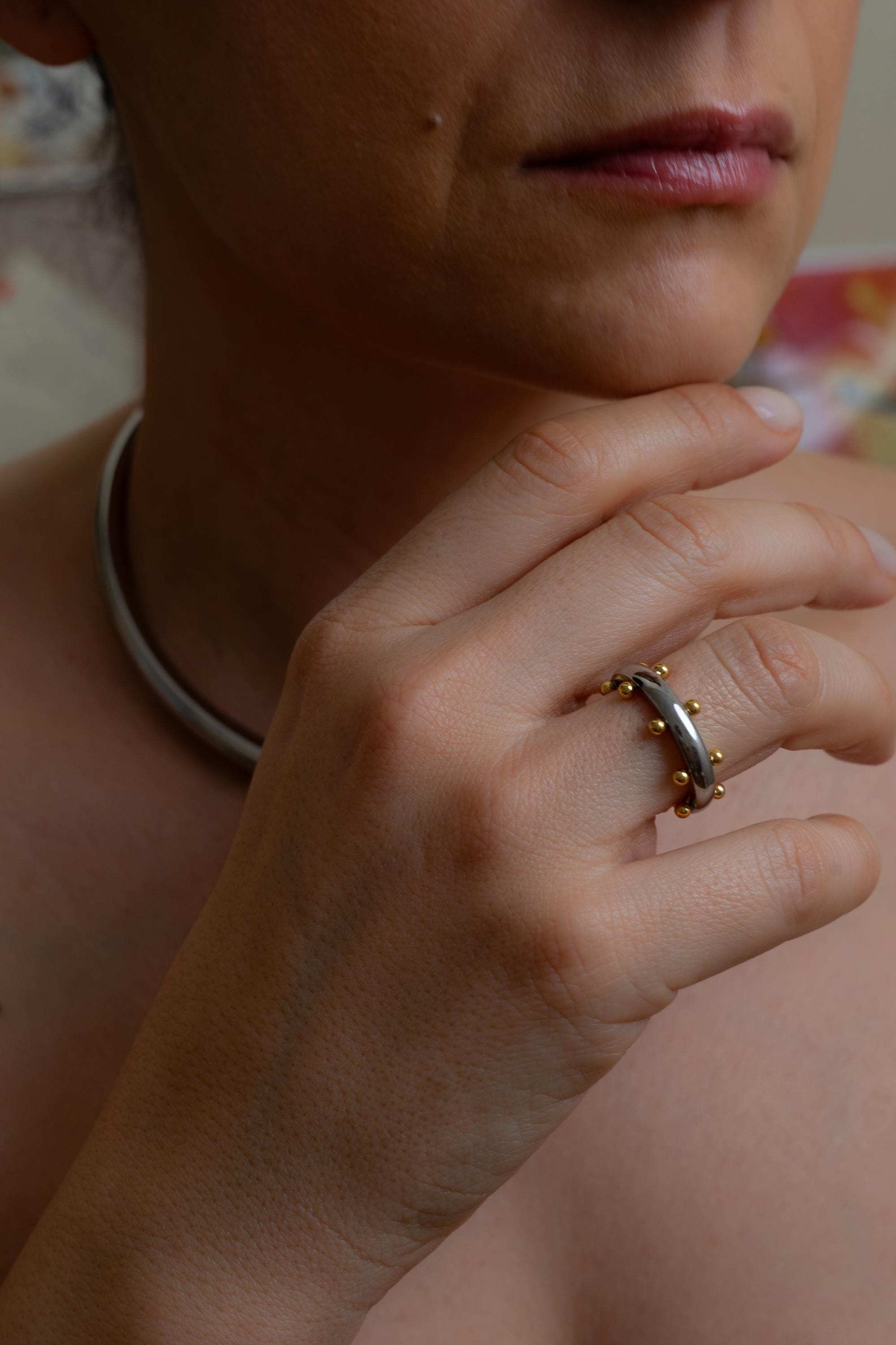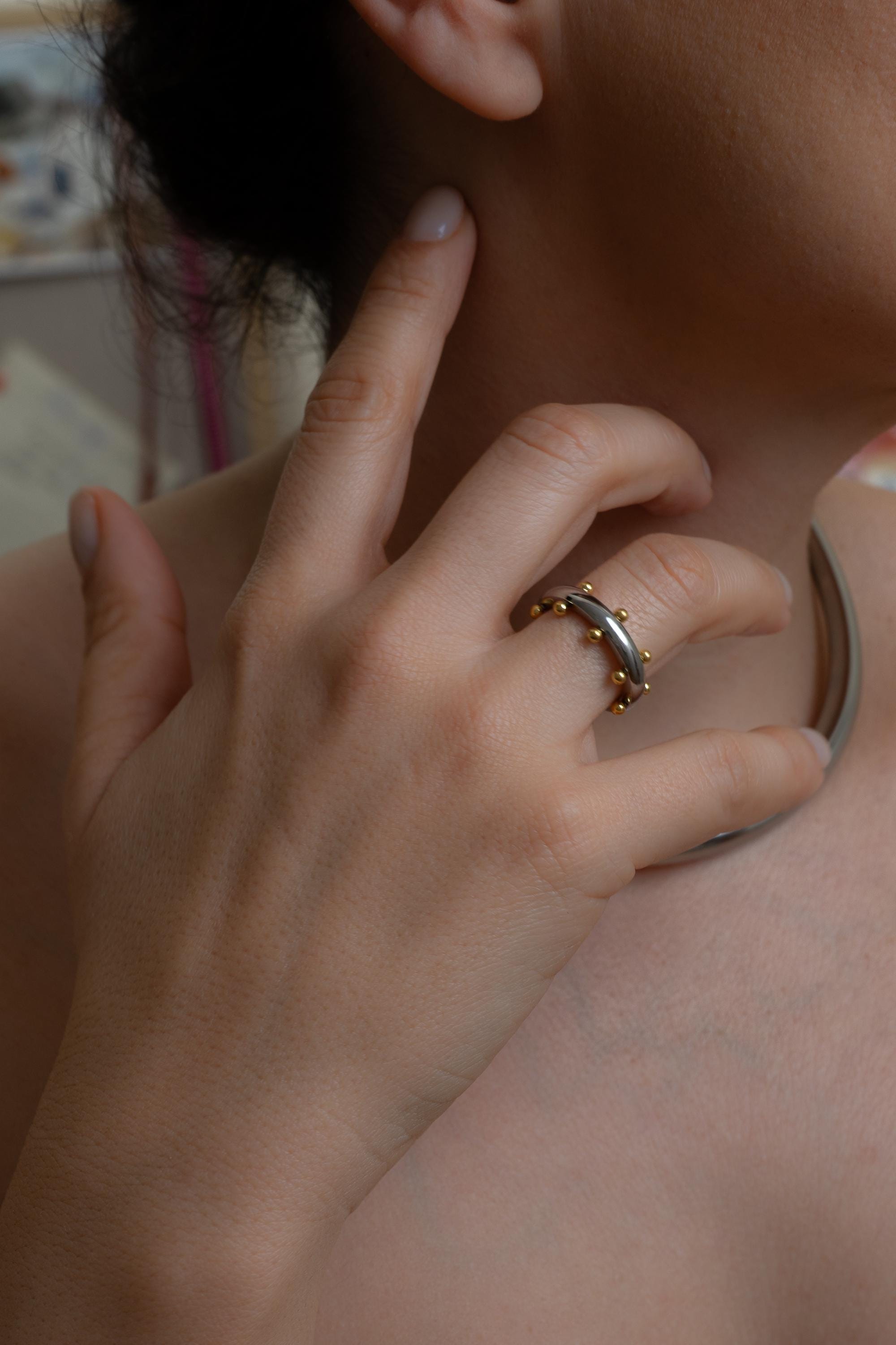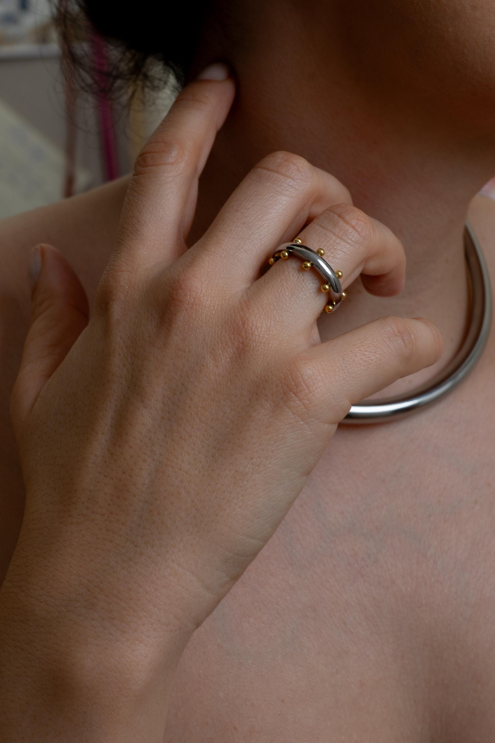 Αυτό το δαχτυλίδι από ανοξείδωτο ατσάλι διαθέτει μια γυαλιστερή ασημί βέρα διακοσμημένη με μικρές χρυσές μπίλιες που δημιουργούν ένα ιδιαίτερο δίχρωμο αποτέλεσμα. Ο minimal σχεδιασμός σε συνδυασμό με τις μικρές γλυπτικές λεπτομέρειες δίνει στο κόσμημα έναν σύγχρονο χαρακτήρα που φοριέται εύκολα κάθε μέρα.