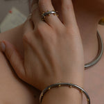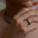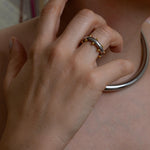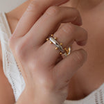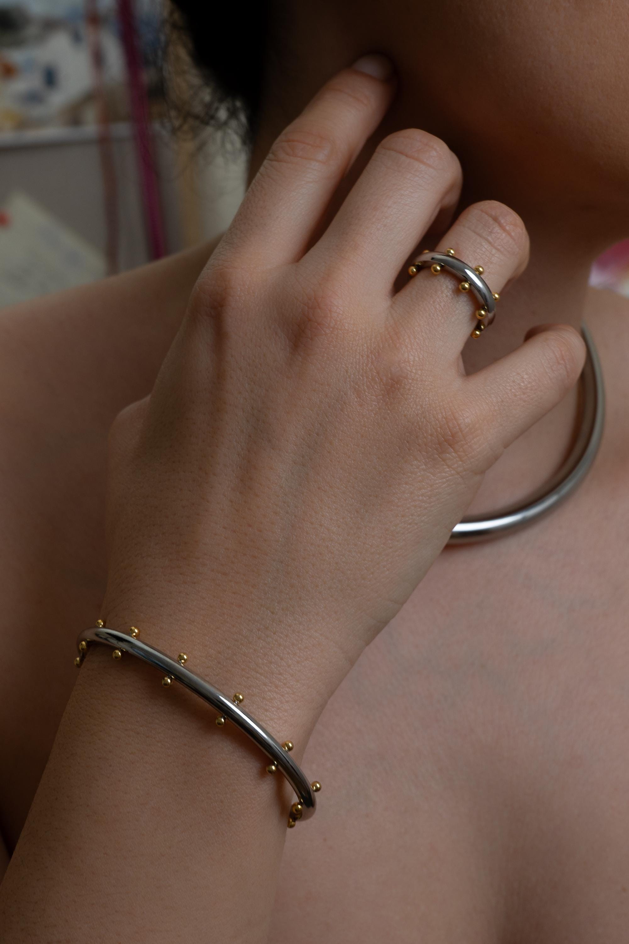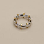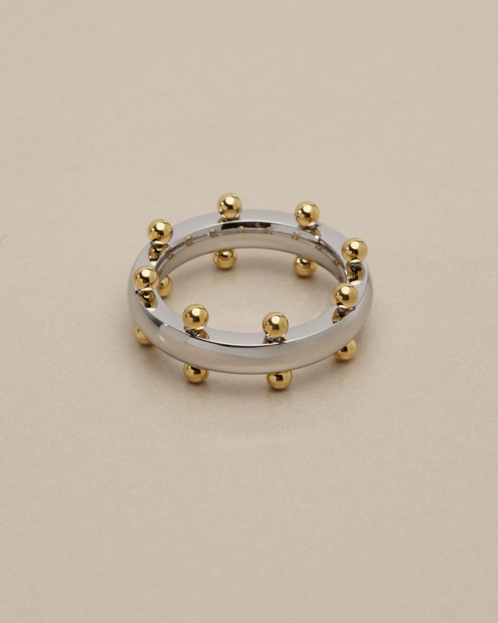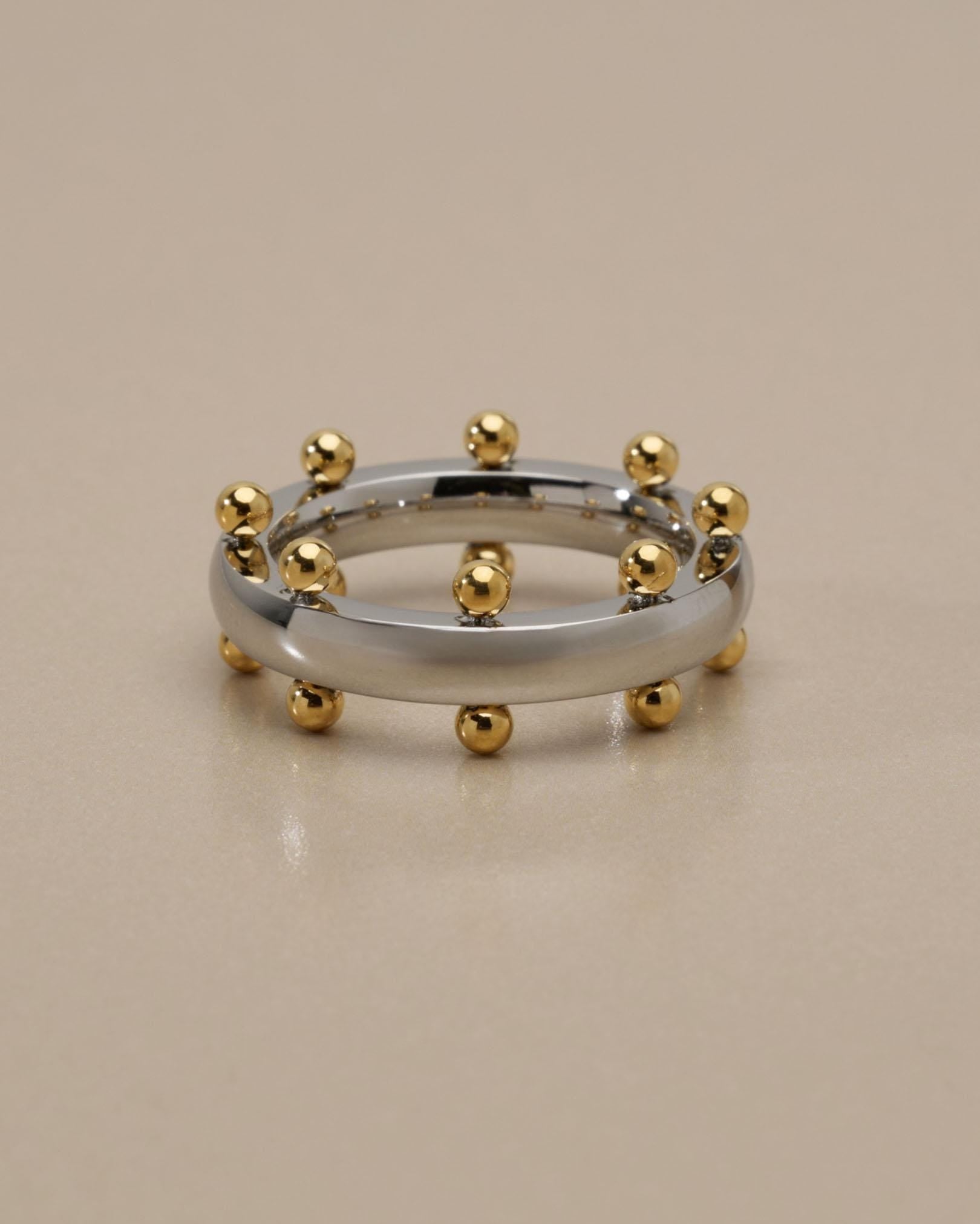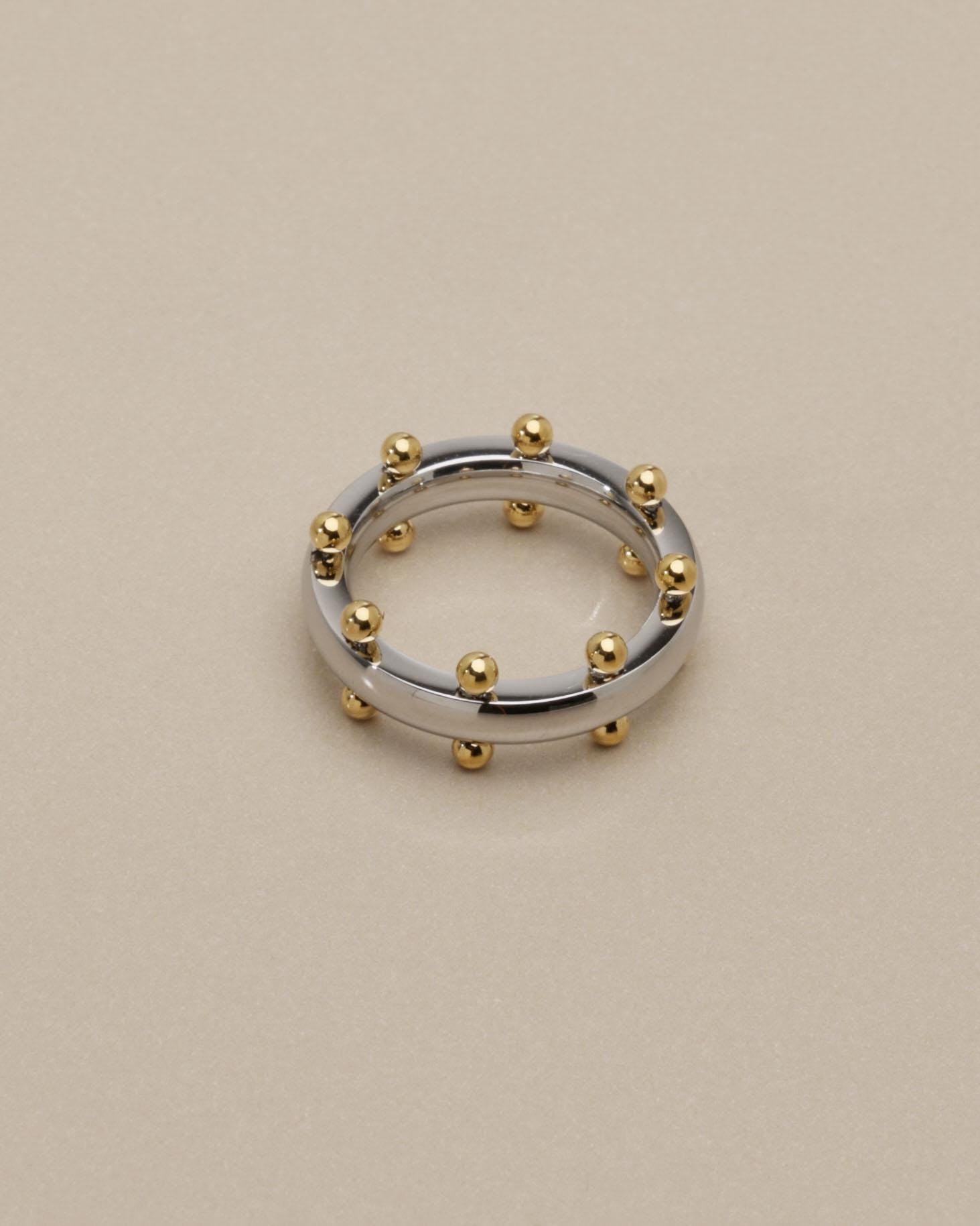 Αυτό το δαχτυλίδι από ανοξείδωτο ατσάλι διαθέτει μια γυαλιστερή ασημί βέρα διακοσμημένη με μικρές χρυσές μπίλιες που δημιουργούν ένα ιδιαίτερο δίχρωμο αποτέλεσμα. Ο minimal σχεδιασμός σε συνδυασμό με τις μικρές γλυπτικές λεπτομέρειες δίνει στο κόσμημα έναν σύγχρονο χαρακτήρα που φοριέται εύκολα κάθε μέρα.