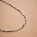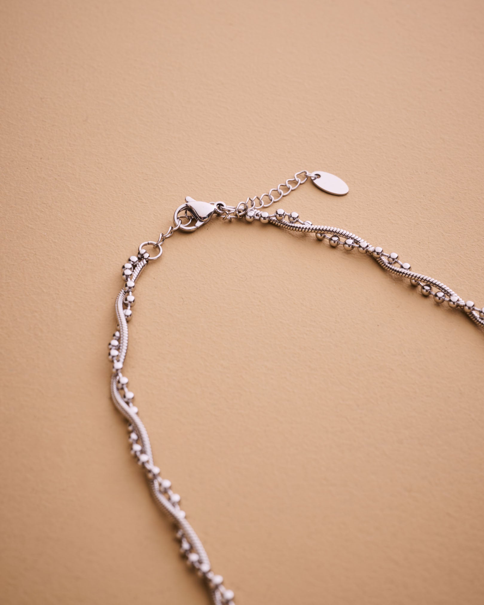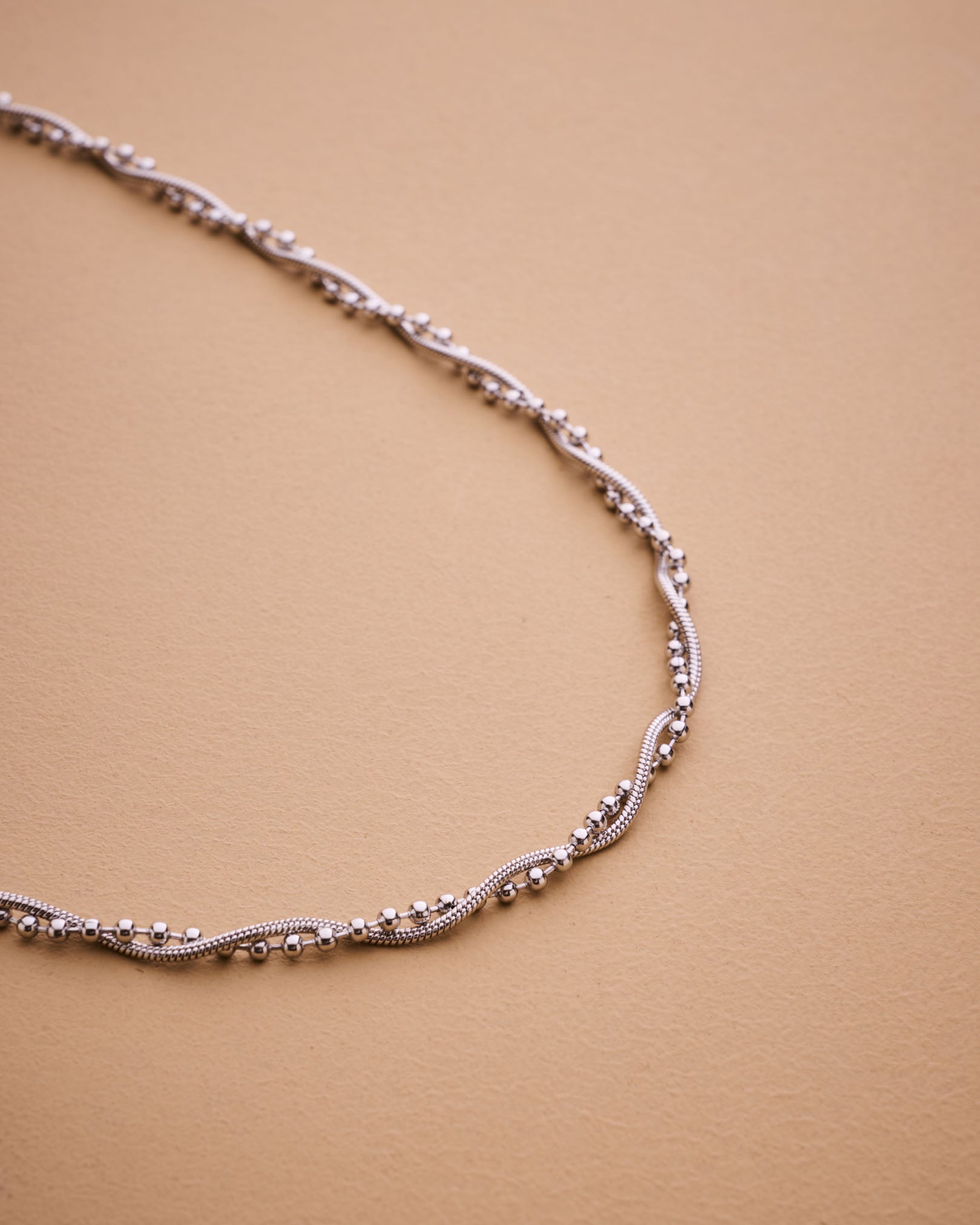 The Silver Twine Chain Necklace brings movement and structure together with an elegant, wave-like silhouette and beaded accents. Crafted from polished stainless steel, this choker-style necklace is designed to flow with your natural neckline.