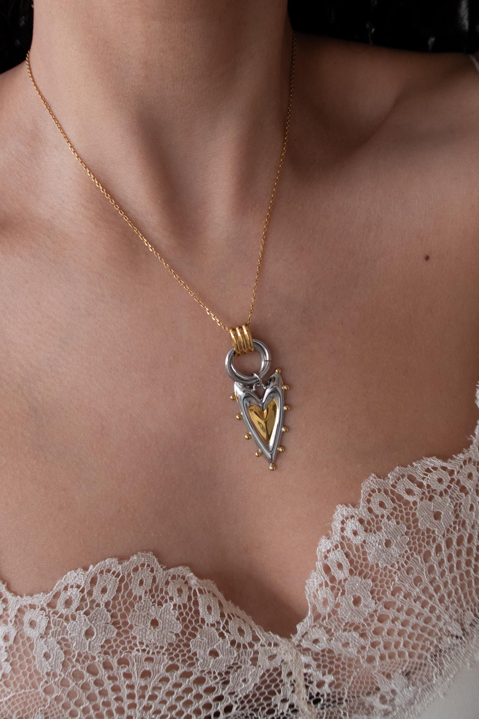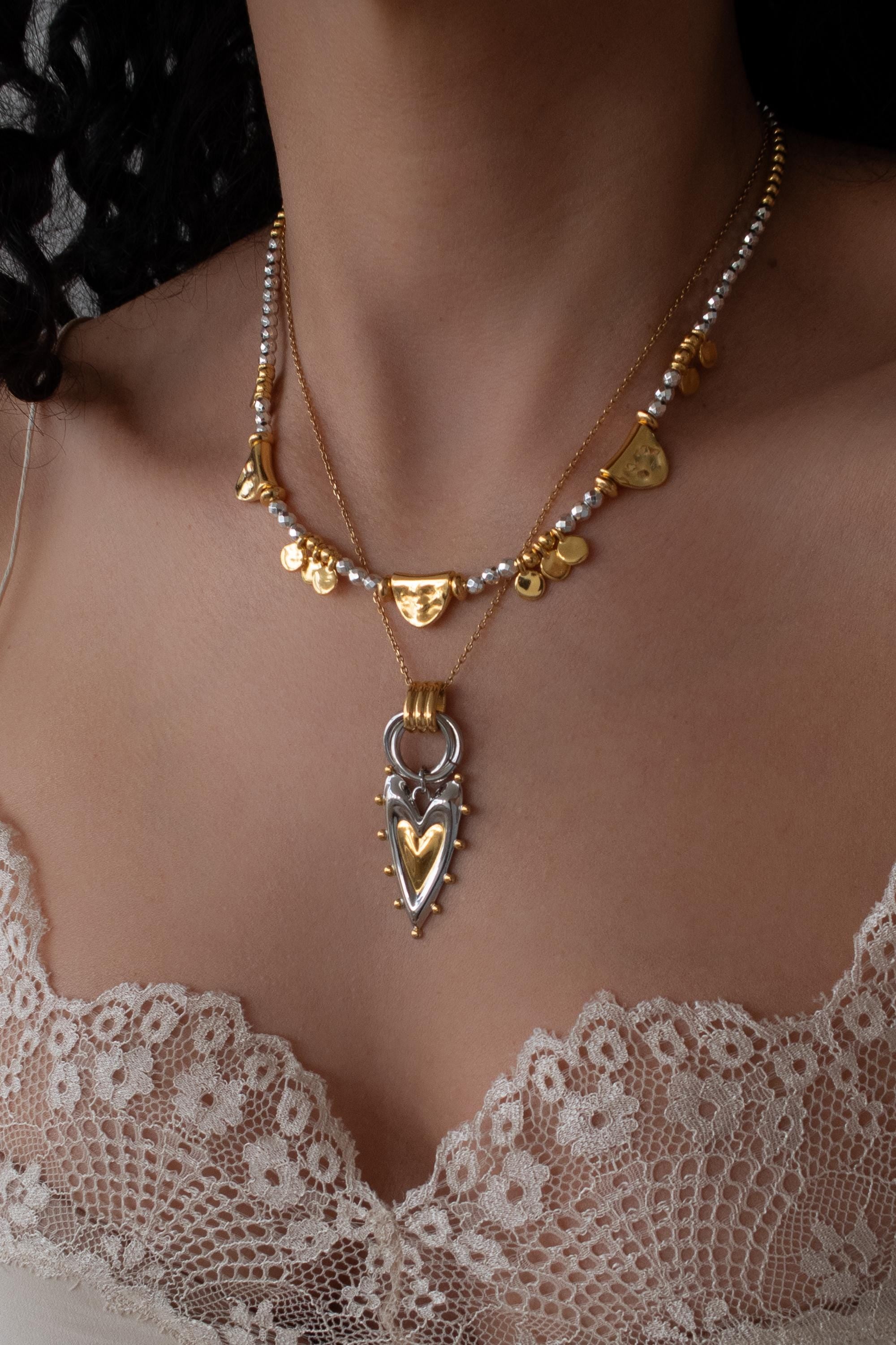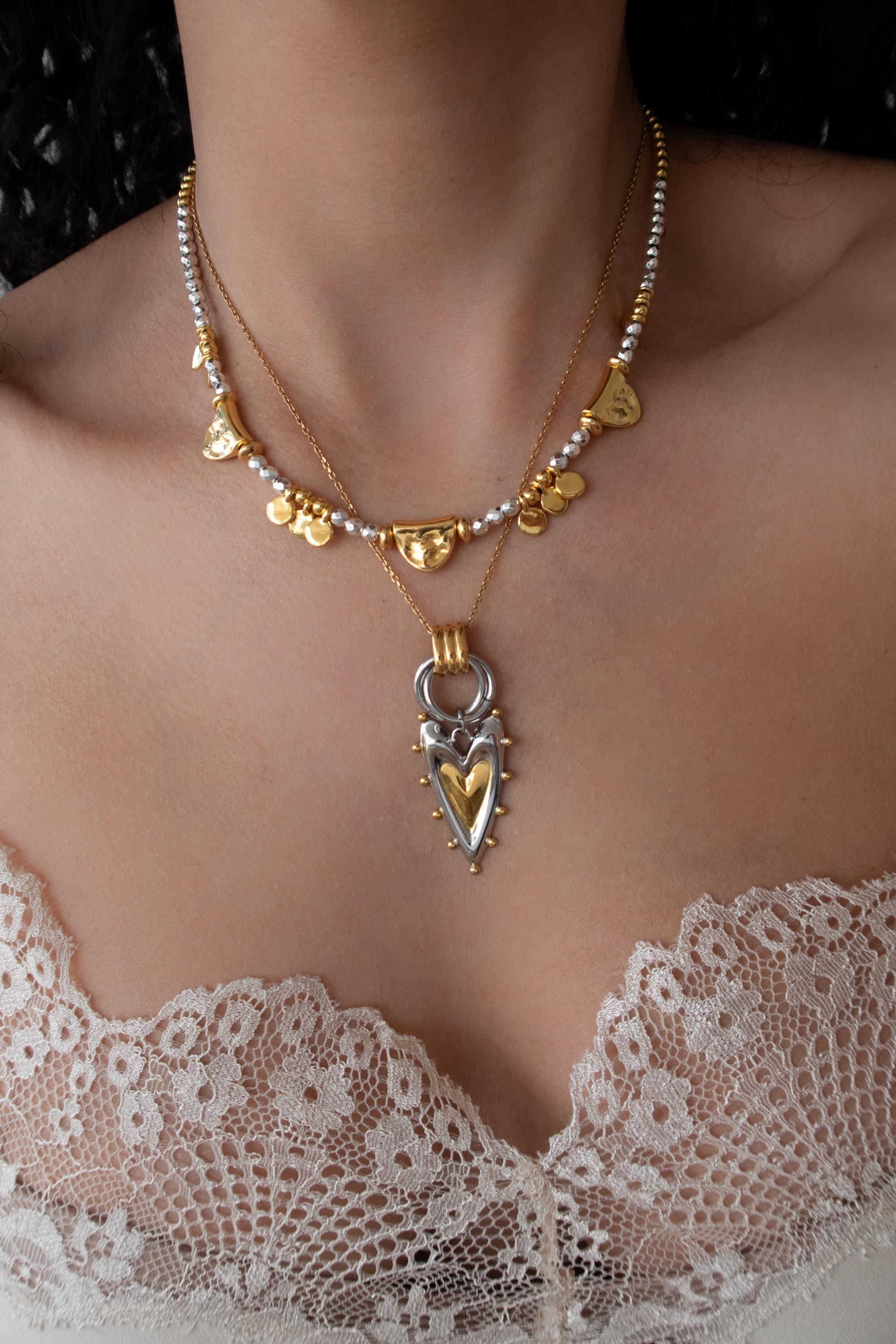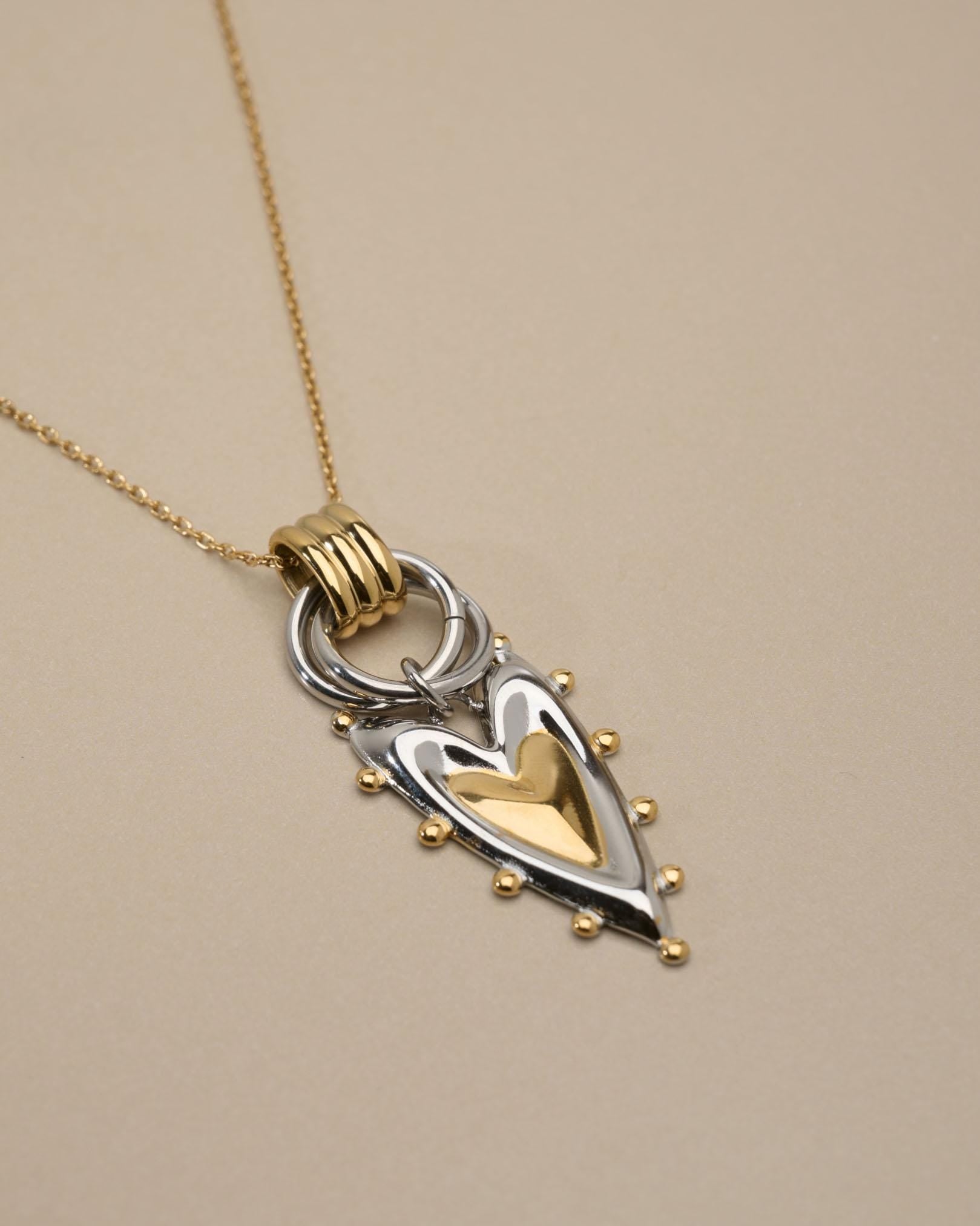Αυτό το κολιέ με καρδιά από ανοξείδωτο ατσάλι συνδυάζει γυαλιστερό ασημί μέταλλο με χρυσές λεπτομέρειες, δημιουργώντας ένα ιδιαίτερο δίχρωμο αποτέλεσμα. Το γλυπτικό σχήμα της καρδιάς πλαισιώνεται από μικρές χρυσές μπίλιες που προσθέτουν υφή και χαρακτήρα, διατηρώντας ταυτόχρονα μια σύγχρονη minimal αισθητική.