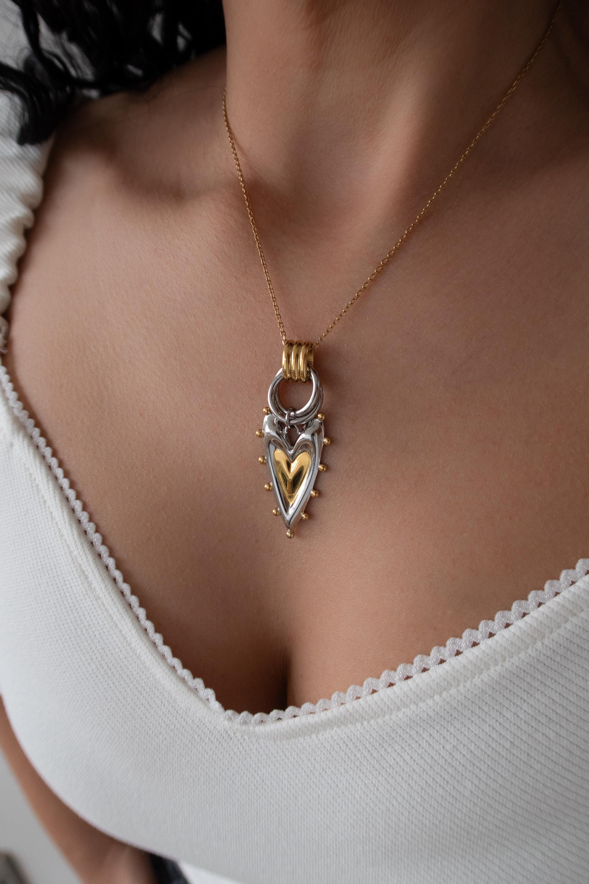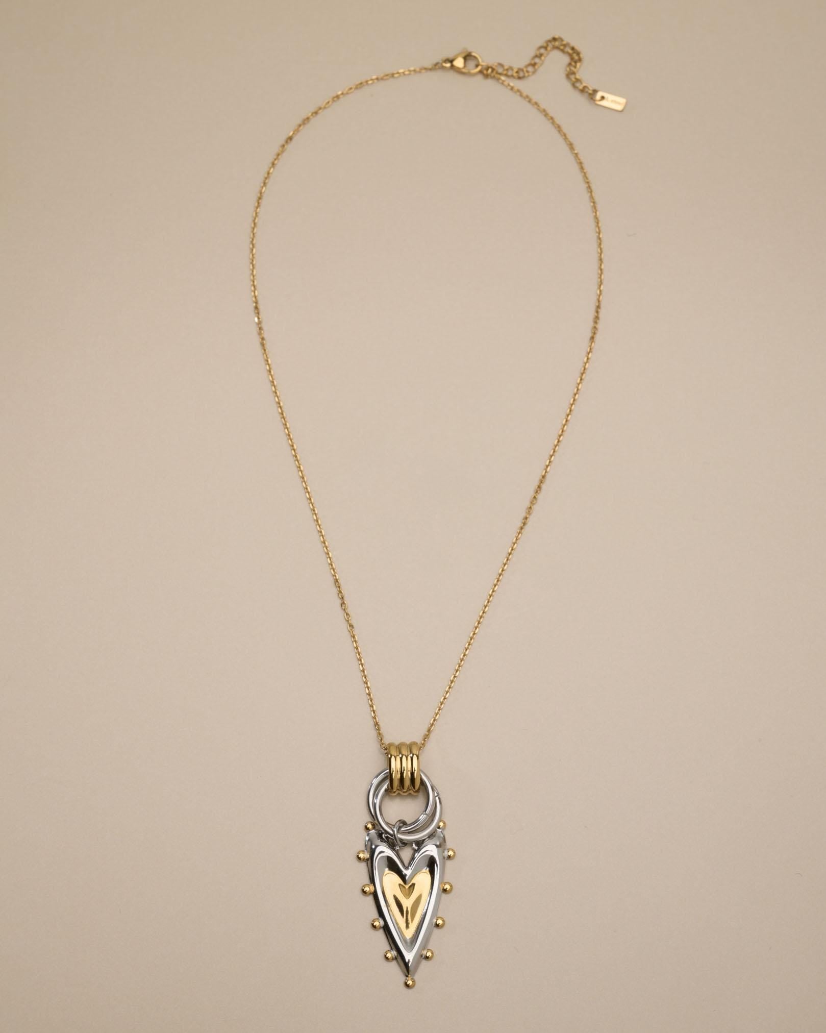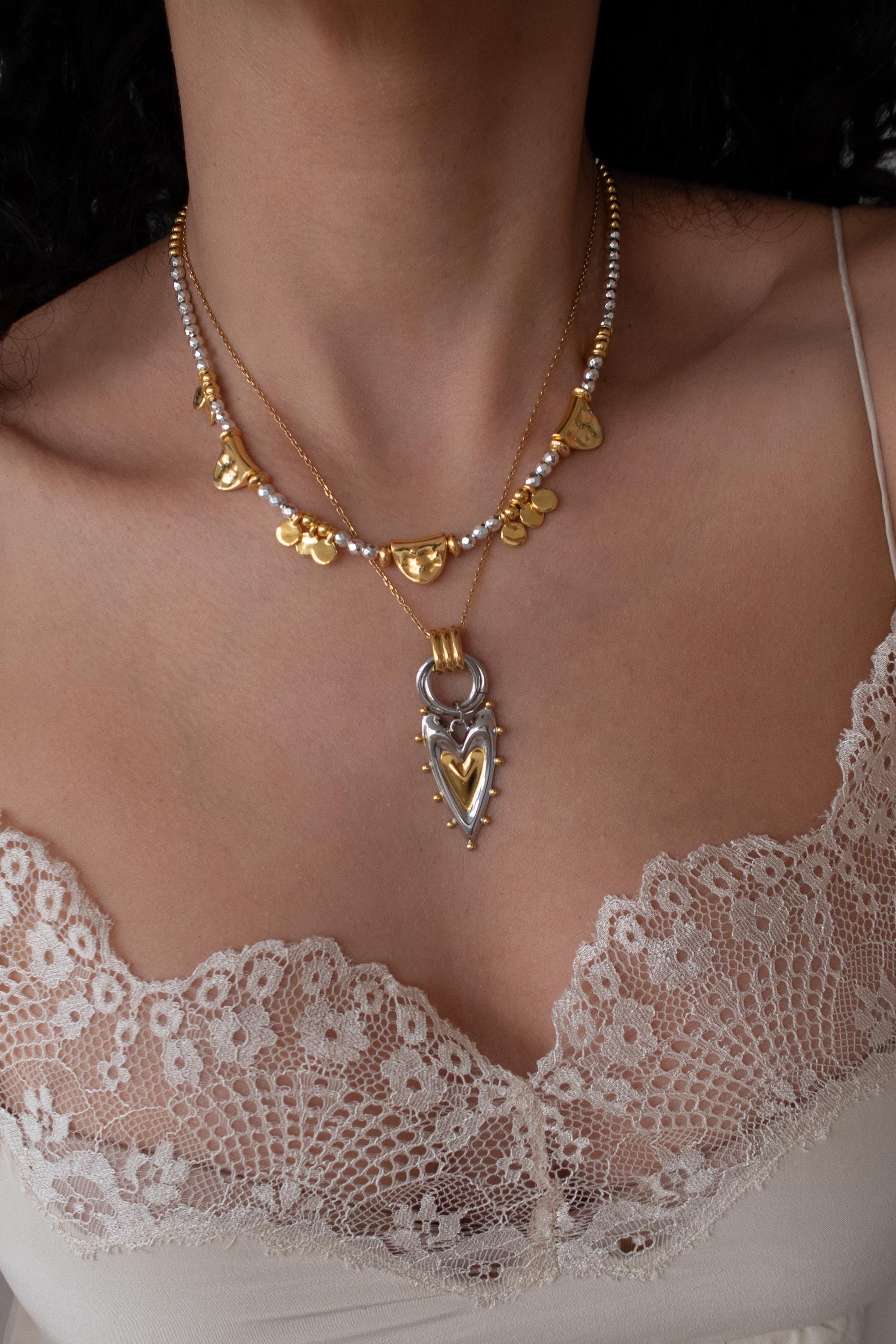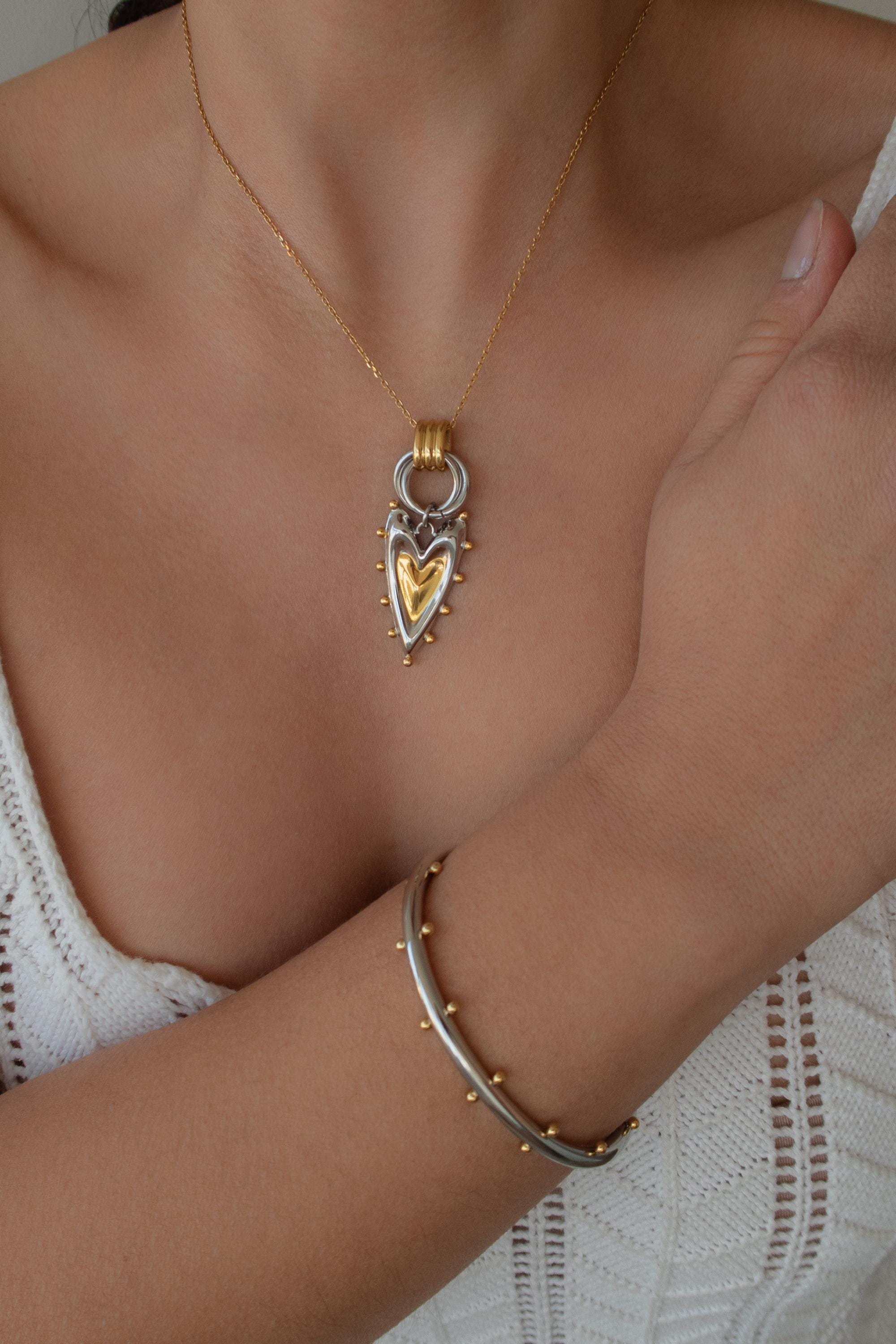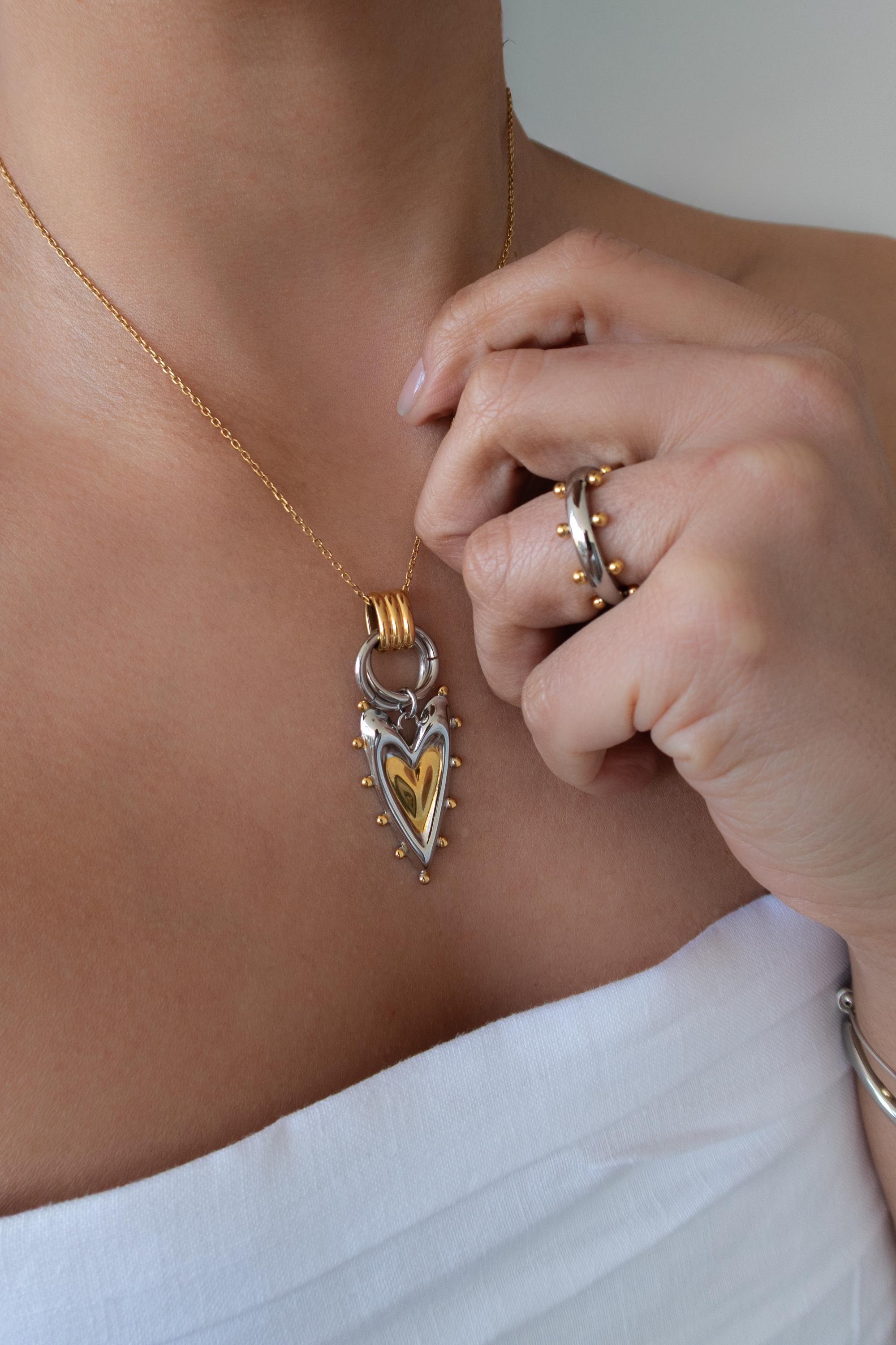 Αυτό το κολιέ με καρδιά από ανοξείδωτο ατσάλι συνδυάζει γυαλιστερό ασημί μέταλλο με χρυσές λεπτομέρειες, δημιουργώντας ένα ιδιαίτερο δίχρωμο αποτέλεσμα. Το γλυπτικό σχήμα της καρδιάς πλαισιώνεται από μικρές χρυσές μπίλιες που προσθέτουν υφή και χαρακτήρα, διατηρώντας ταυτόχρονα μια σύγχρονη minimal αισθητική.