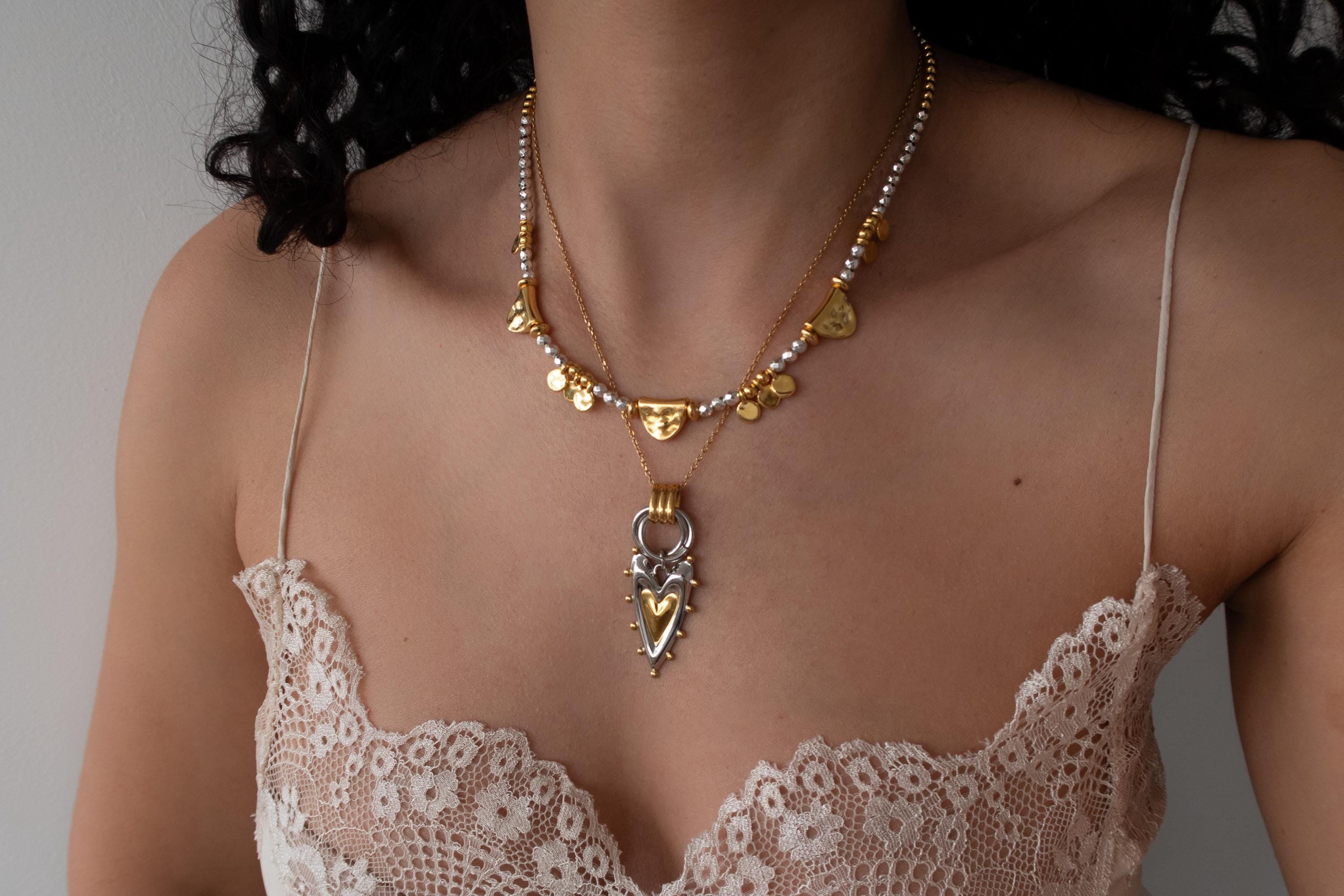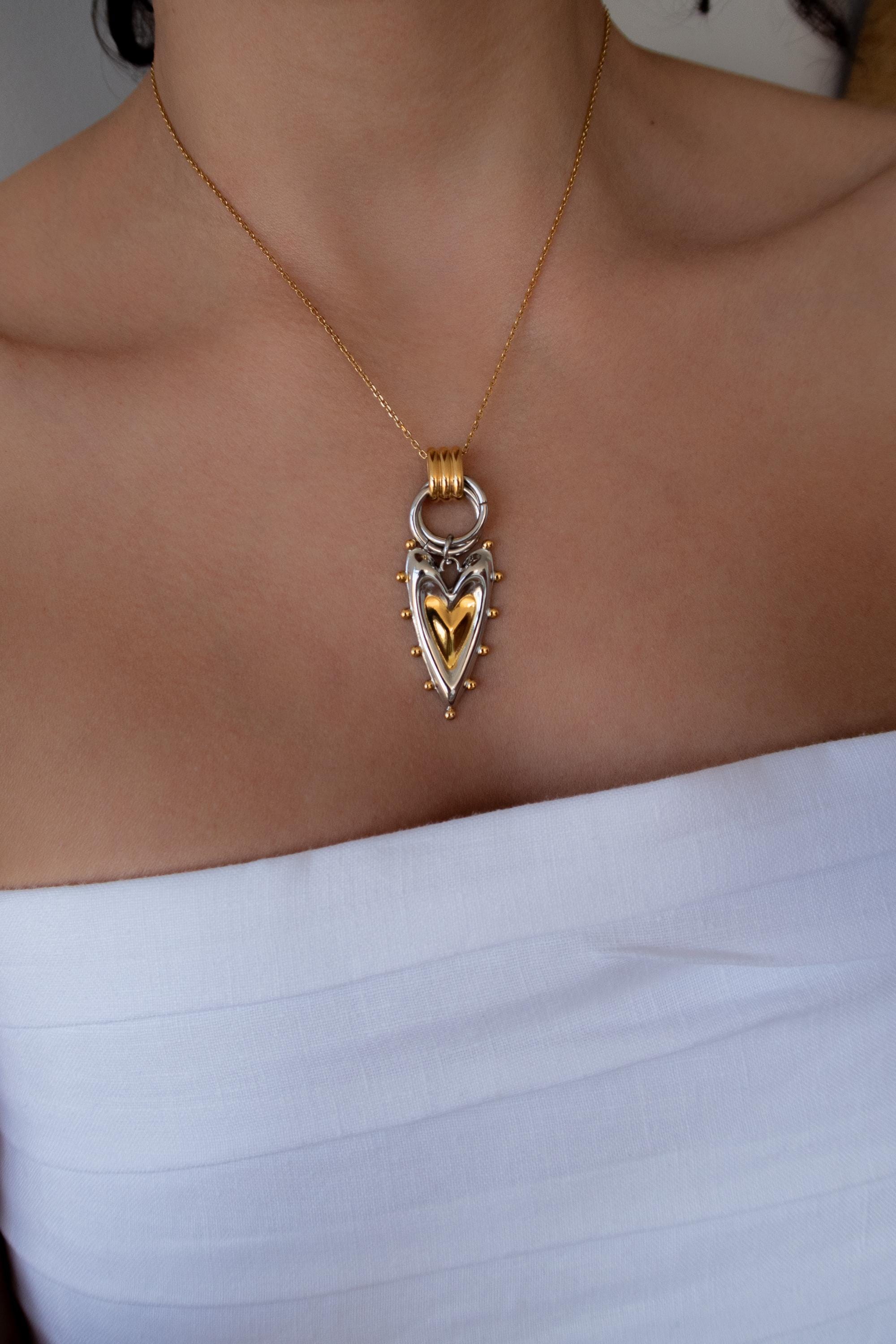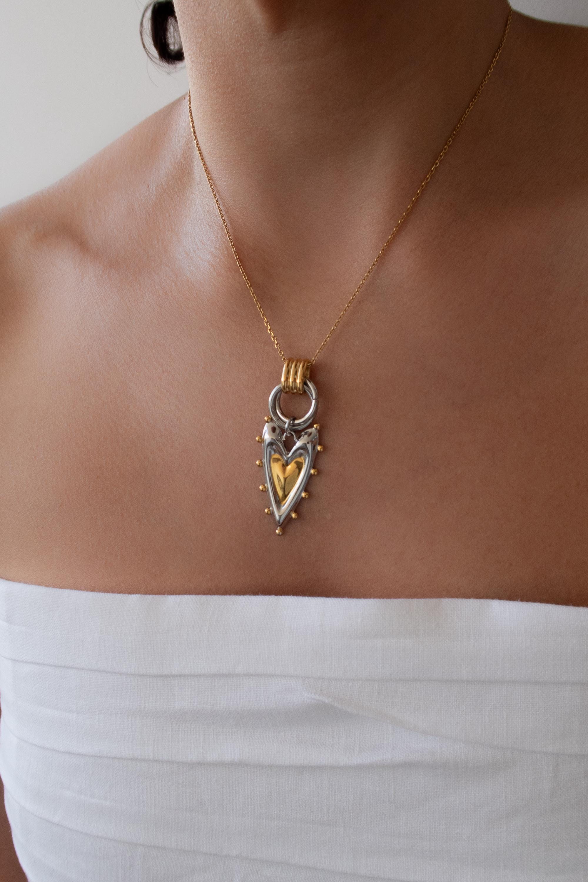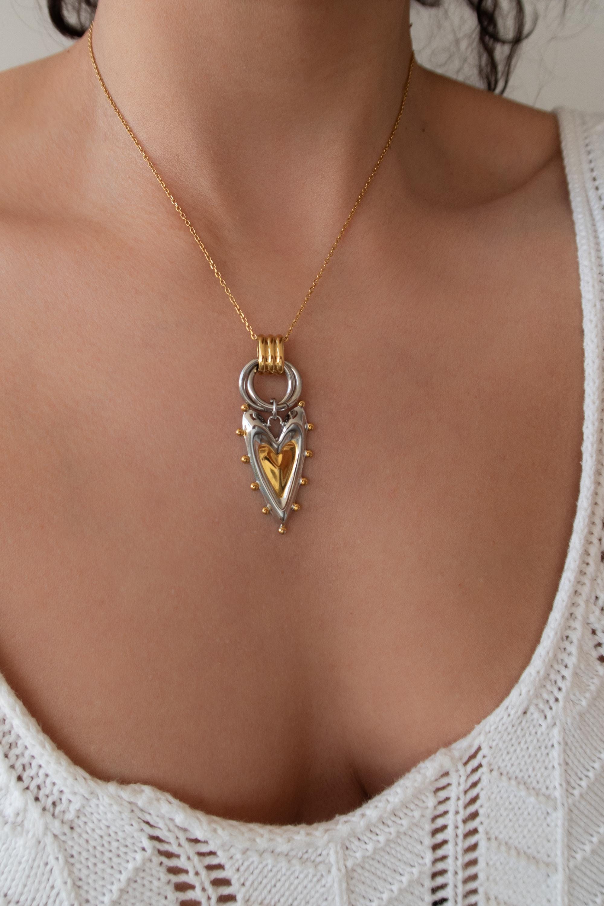 Αυτό το κολιέ με καρδιά από ανοξείδωτο ατσάλι συνδυάζει γυαλιστερό ασημί μέταλλο με χρυσές λεπτομέρειες, δημιουργώντας ένα ιδιαίτερο δίχρωμο αποτέλεσμα. Το γλυπτικό σχήμα της καρδιάς πλαισιώνεται από μικρές χρυσές μπίλιες που προσθέτουν υφή και χαρακτήρα, διατηρώντας ταυτόχρονα μια σύγχρονη minimal αισθητική.