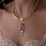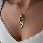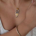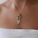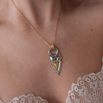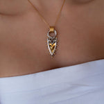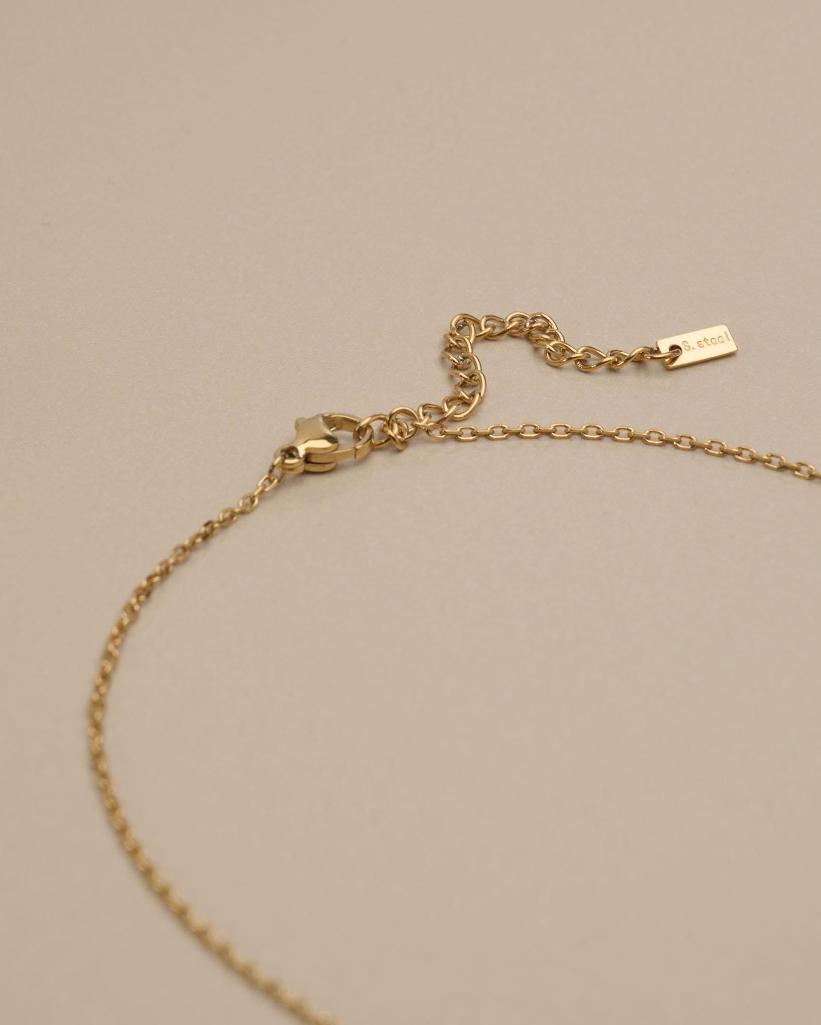 Το μενταγιόν κρέμεται από λεπτή αλυσίδα από ανοξείδωτο ατσάλι με χρυσούς κρίκους, δημιουργώντας μια όμορφη ισορροπία ανάμεσα στα δύο μέταλλα. Το κόσμημα φοριέται εύκολα κάθε μέρα και συνδυάζεται ιδανικά με το αντίστοιχο δαχτυλίδι και το cuff βραχιόλι της ίδιας σειράς.